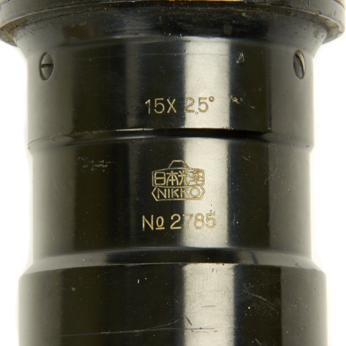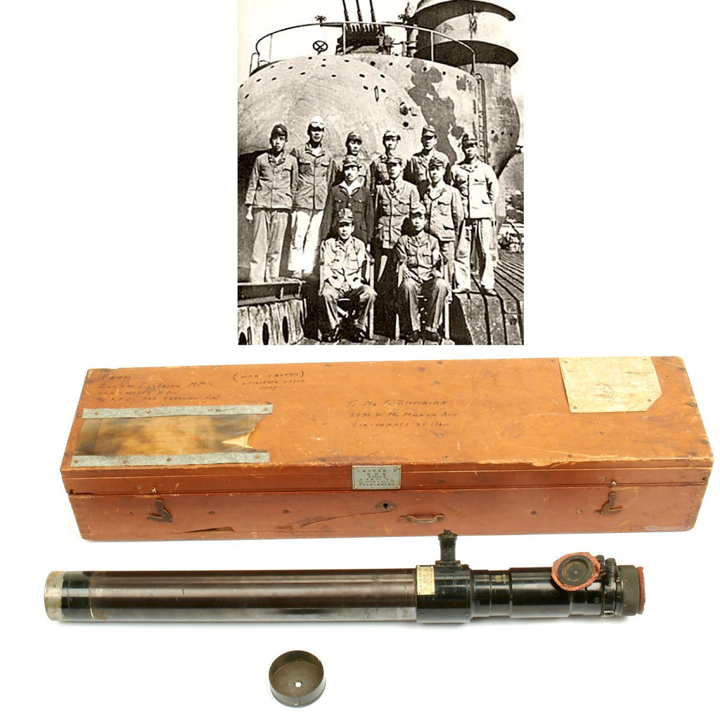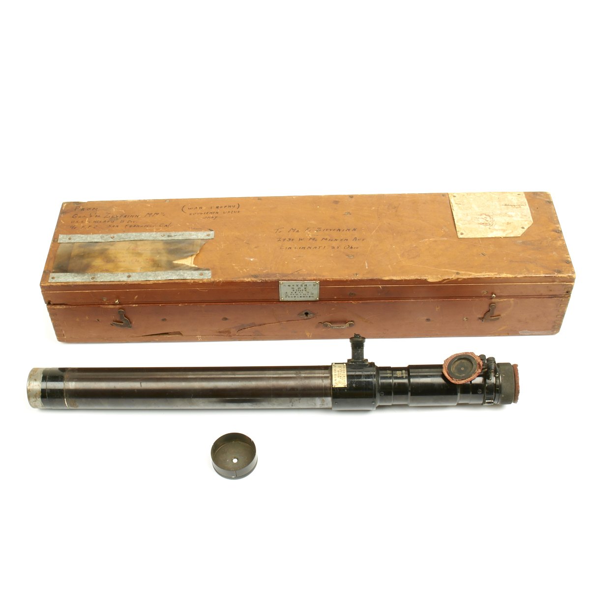 15 x 2.5NikkoNo 2785It is contained in its original wood transit chest complete with wartime dated data plate still attached. The box was used to ship home after the war by George WIlliam Zieverink who was on the USS Chicago. Zieverink can be found in dozens of official WWII USS Chicago muster rolls some copies of which are included. He also marked the box War Trophy Souvenir Value Only.A very rare, excellent example of a genuine Japanese Submarine Gun Sight brought home by a USN service member who served aboard the USS Chicago in the Pacific Theater during World War Two.USS Chicago in WWII:Chicago spent her first six weeks preparing for sea duty before departing on 26 February for Norfolk. After conducting training exercises, and calibrated her compasses in Chesapeake Bay, the cruiser got underway on 12 March for the Gulf of Paria, Trinidad. Arriving on 18 March, the cruiser conducted shakedown training and shore bombardment exercises off Culebra, Puerto Rico, before returning to Norfolk on 11 April. Following inspections and battle problem training, the cruiser sailed to Philadelphia for post-shakedown repair availability on 16 April.