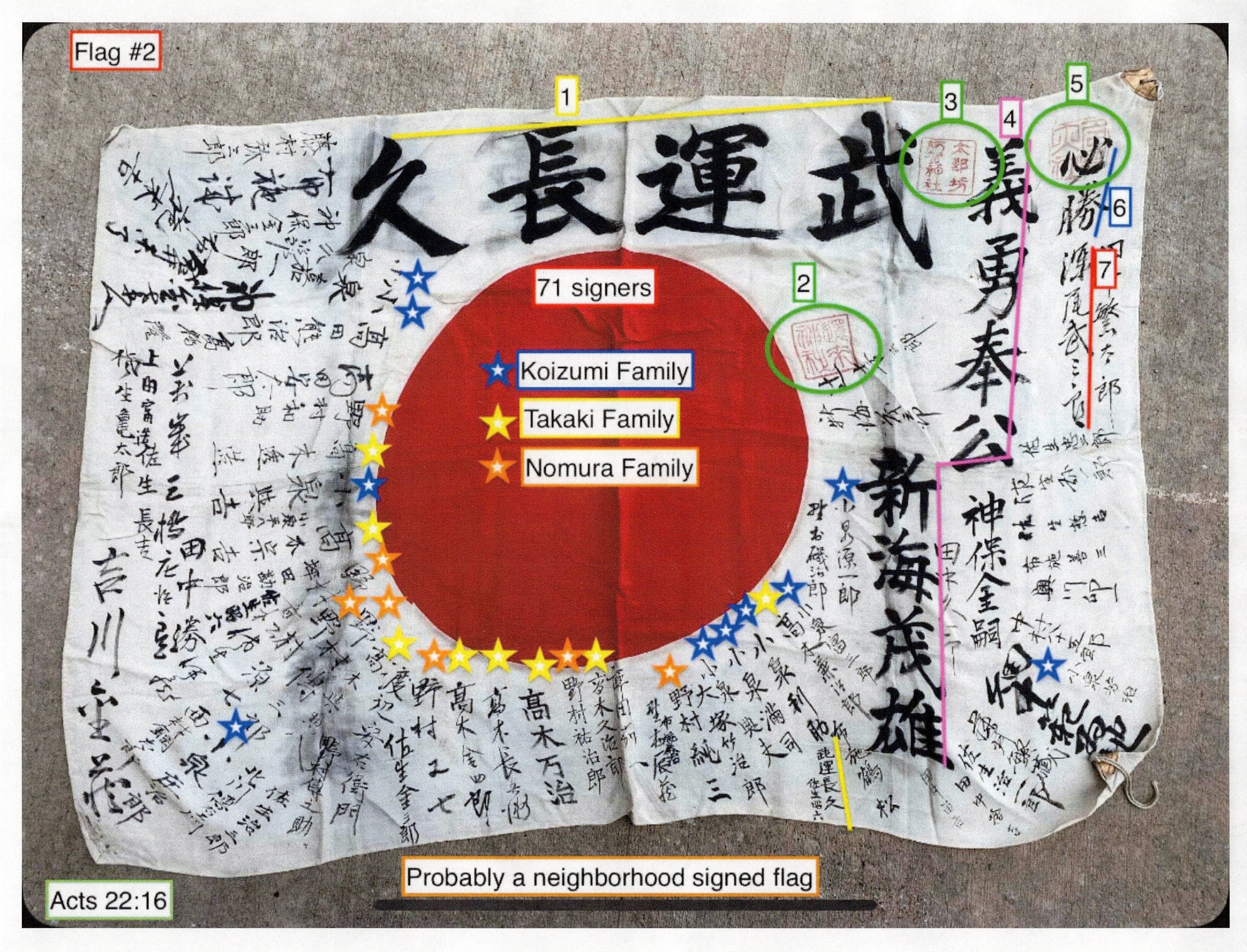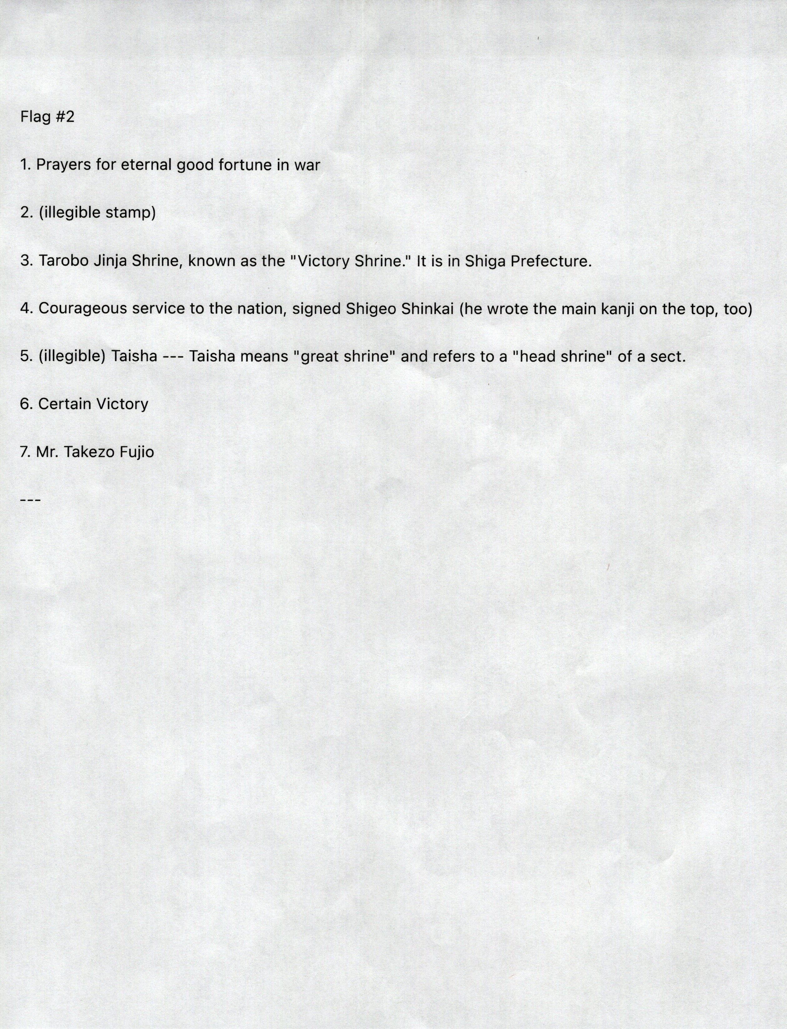 The flag comes with a page of partial translations. The page identifies one of the Temple Stamps, numbered 3 on the page, for the Tarobo Jinja Shrine, known as the “Victory Shrine”, located in the Shiga Prefecture. There is a photo of a shrine at a bird’s eye view included, which is likely this shrine.