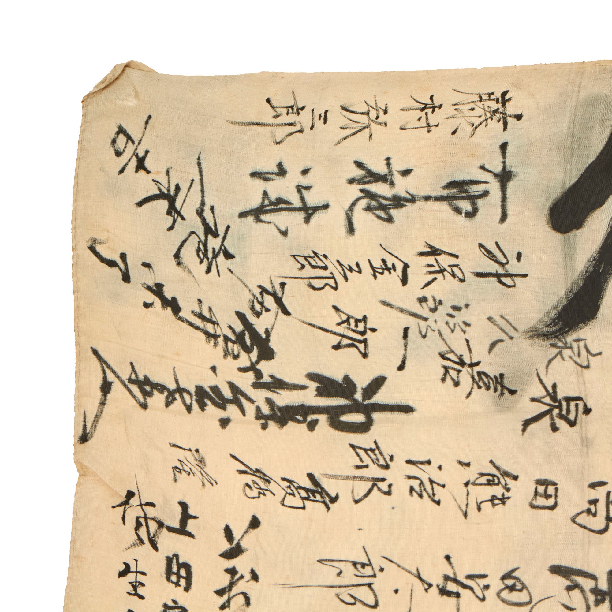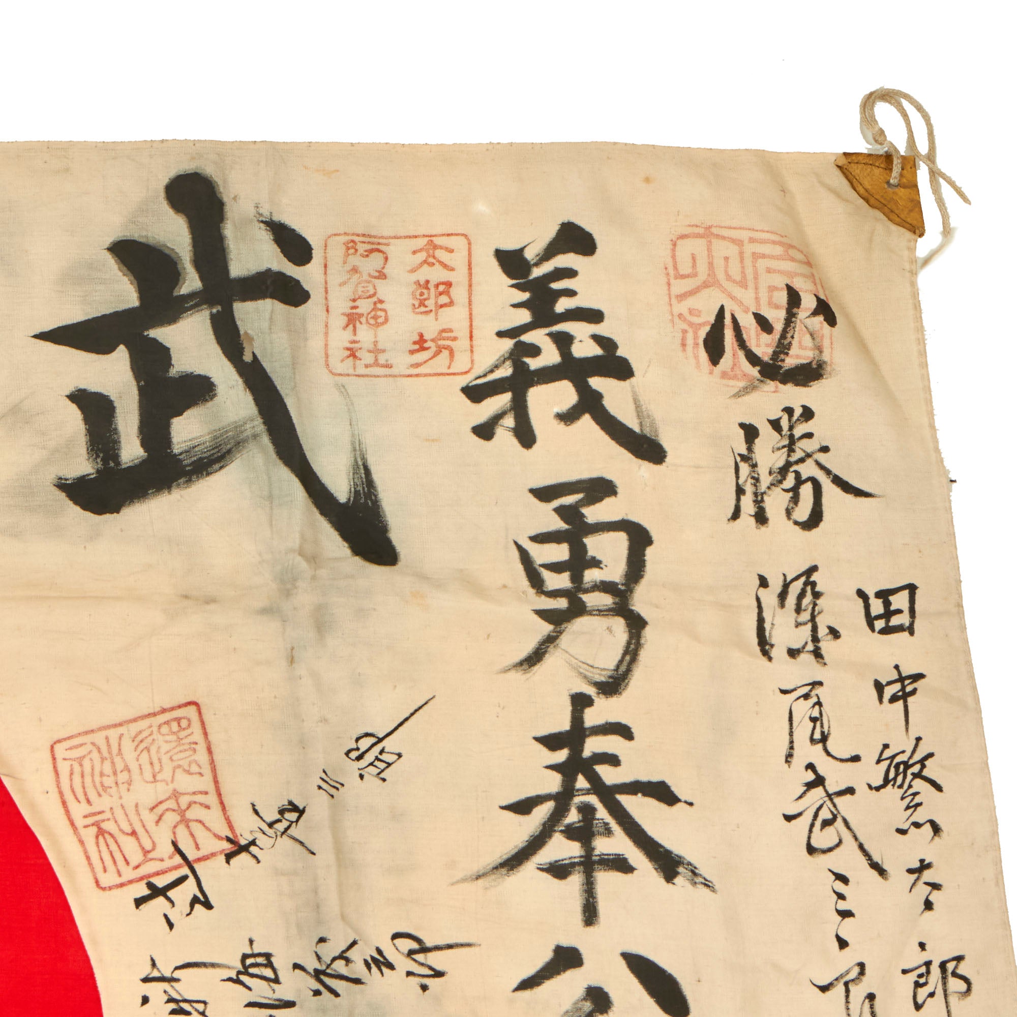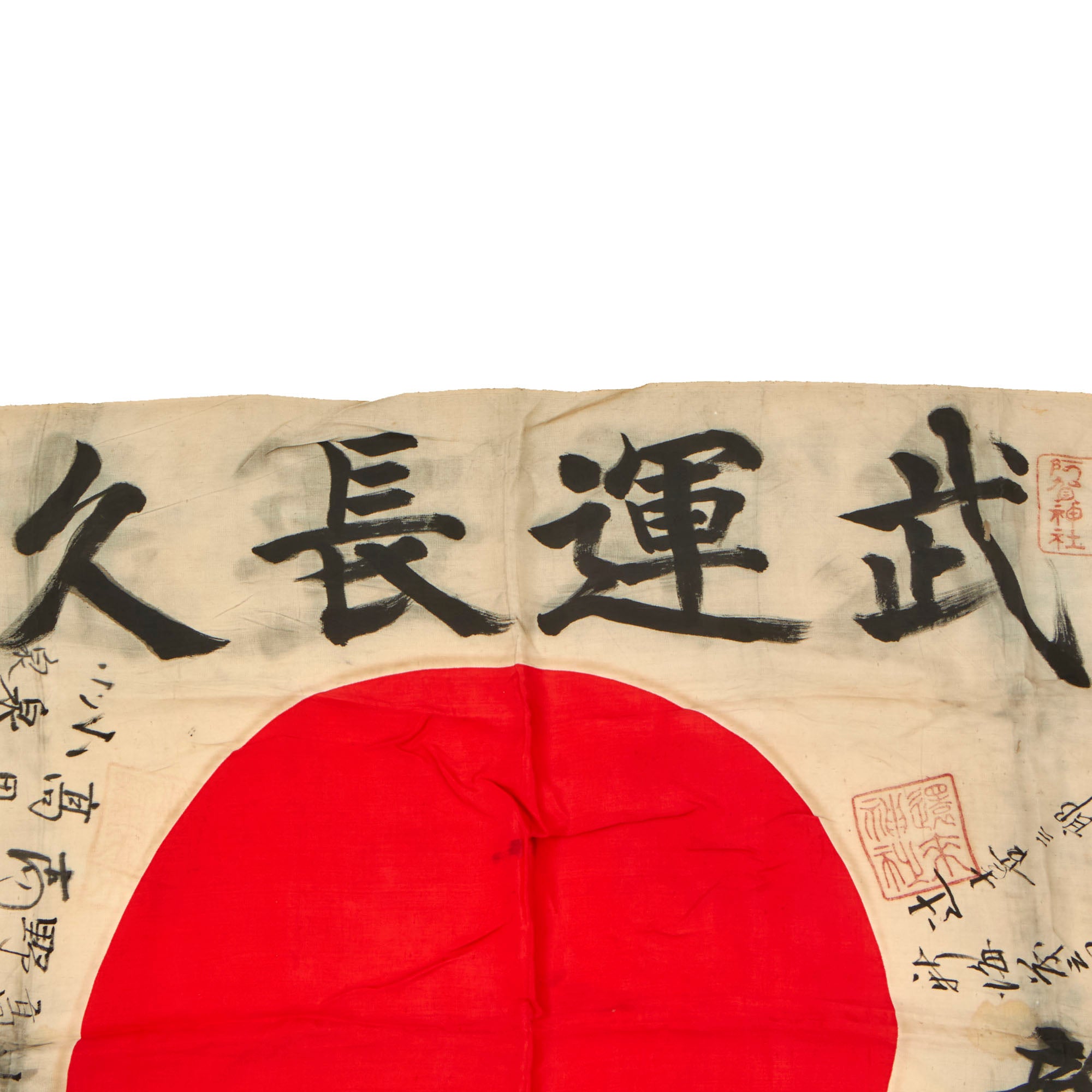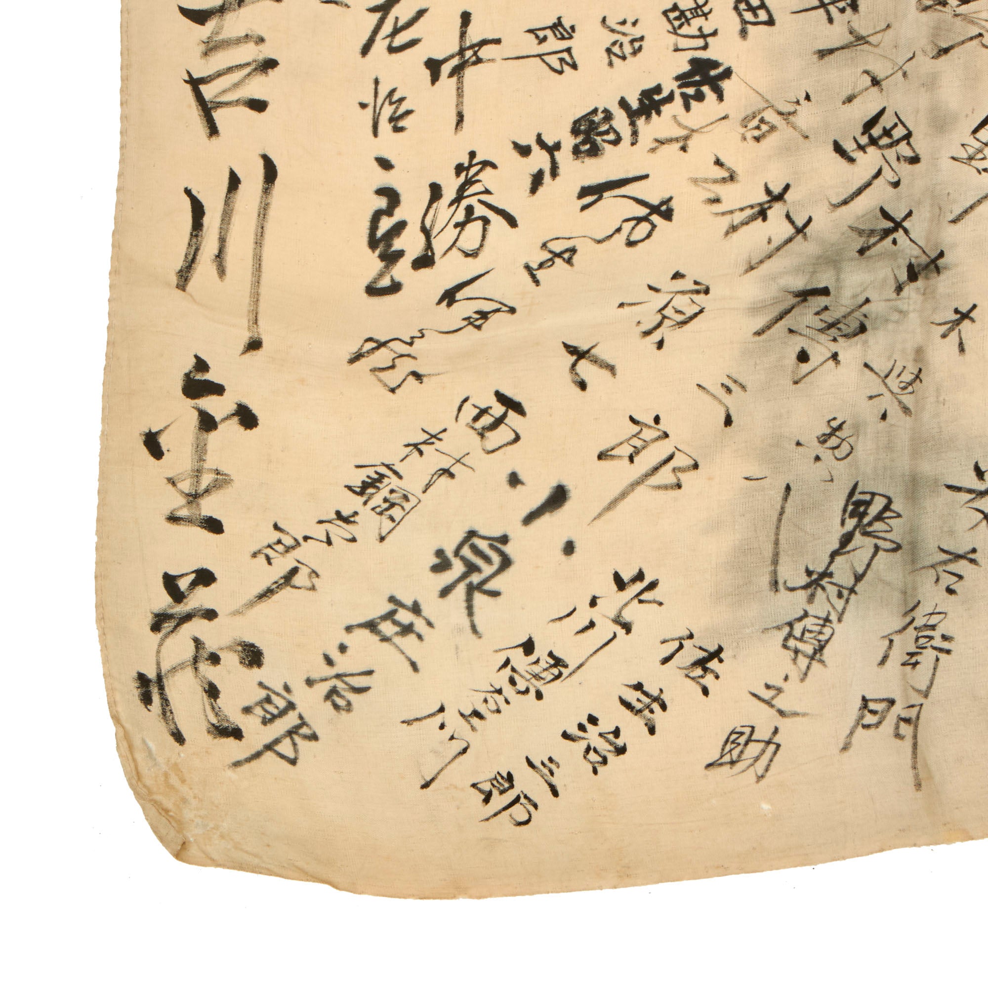 The Japanese call their country's flag hinomaru, which translates literally to "sun-round", referencing the red circle on a white field. When the hinomaru was signed, the Japanese characters were usually written vertically, and radiated outward from the edge of the red circle. This practice is referenced in the second term, yosegaki, meaning "sideways-writing". The phrase hinomaru-yosegaki can be interpreted as "To write sideways around the red sun", describing the appearance of the signed flag. This particular example completely unique is written in old KANJI the writing are mainly Japanese names of this soldier's family and friends with quotes and phrases.