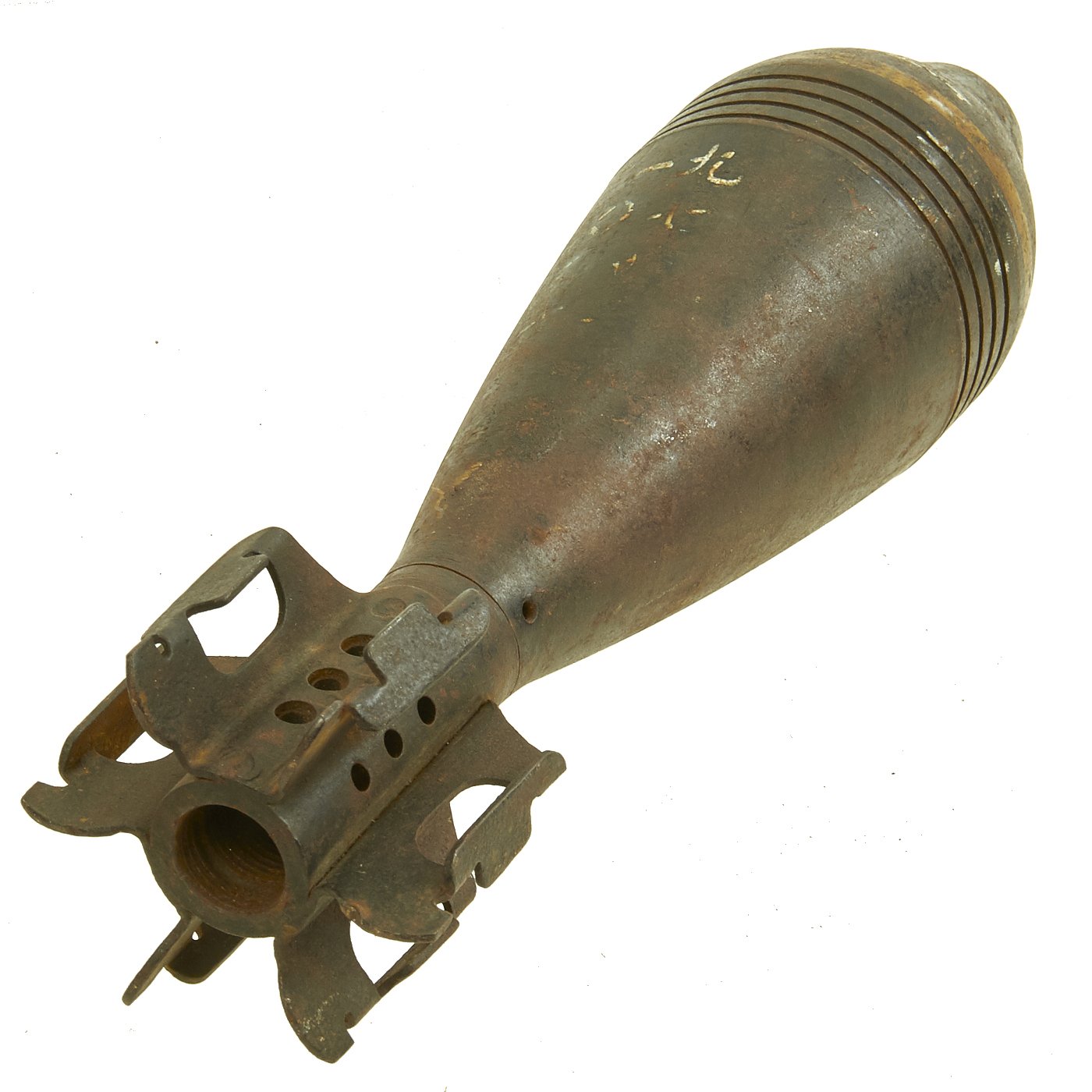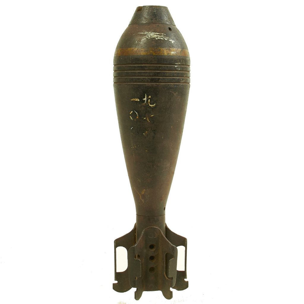 This is a very good condition late war example of the rare Japanese Type 100 HE Mortar Round used with the Type 97 (1937) and later the Type 99 small trench mortar. This is based on the Stokes-Brandt design, as was the U.S. 81mm, and this round was actually interchangeable with the U.S. M43A1 shell.