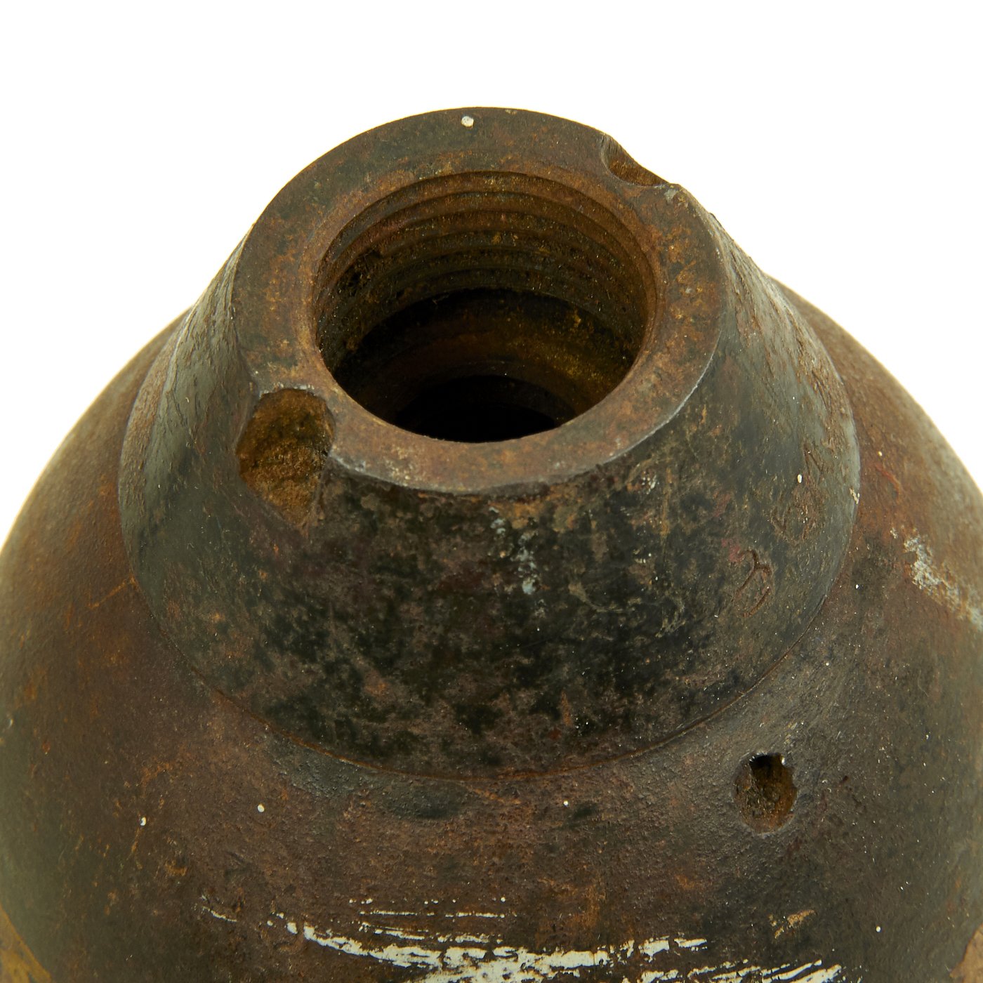The Japanese Type 100 round had a maximum range of about 3,000 yards. Loaded weight: ~3kg (6.9lbs) of which 1 pound was TNT. This round is complete, except it does not have an inert fuze installed on the top. The top cap is also not currently removable. It still has the original paint markings indicating type and other information regarding the round, though they are almost worn away.