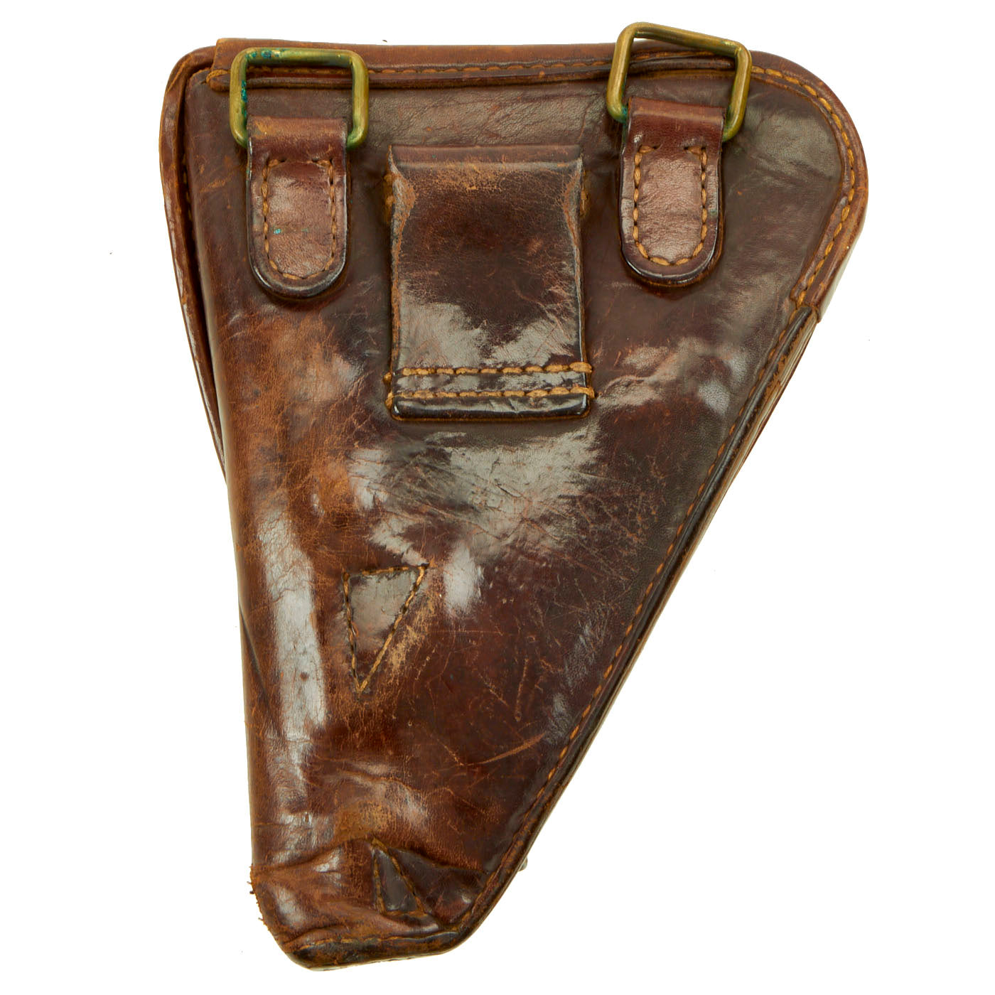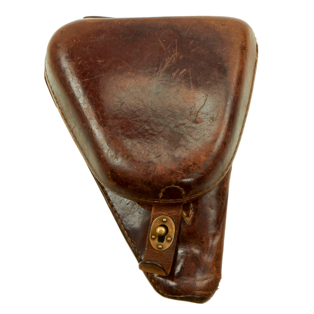 Original Item: Only One Available. This is a very nice original WWII Issue holster for the Japanese Nambu type 14 semi automatic pistol. It is constructed of thick leather with a hard shell lid which covers the pistol's grip as well as the spare ammunition compartment and firing pin pouch. There is also a flap covering the ammunition compartment, which is intact, and a loop inside to hold the combination cleaning rod take down tool. The rear of the holster has a belt loop, as well as two loops for a shoulder strap, which is not present.