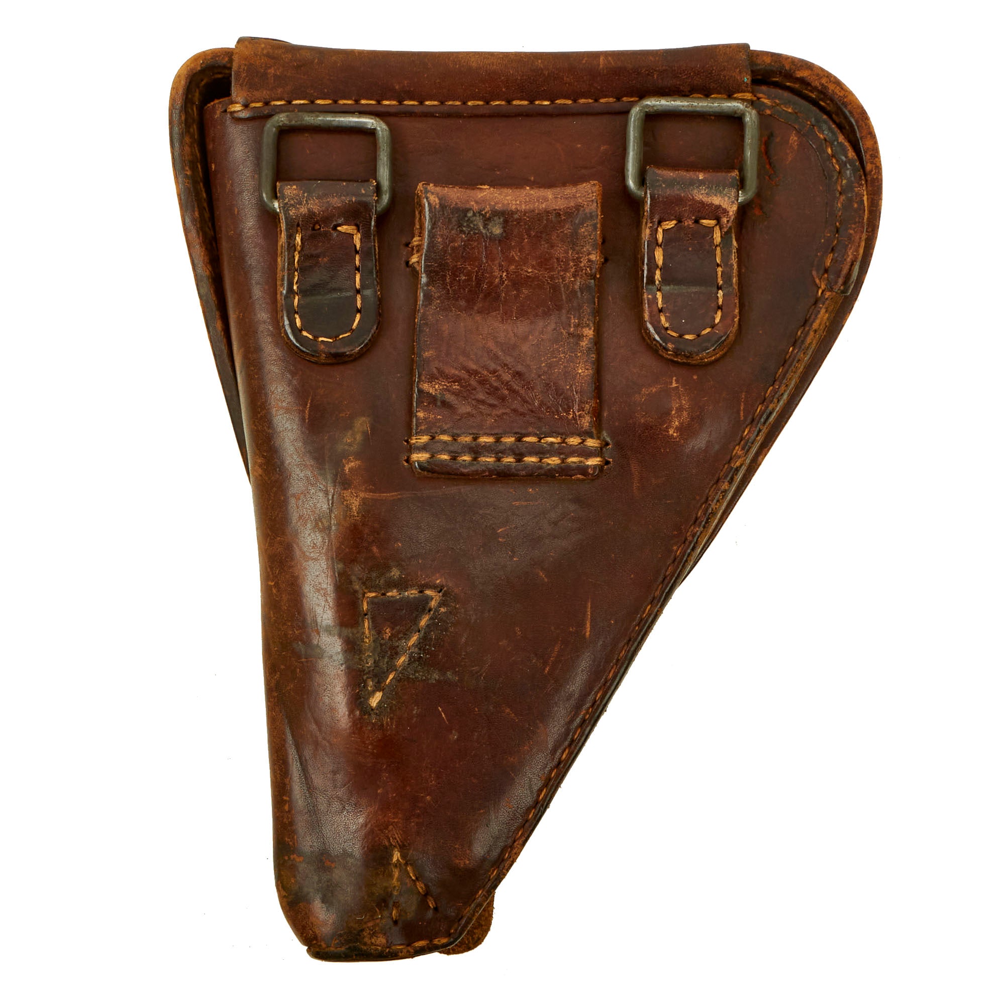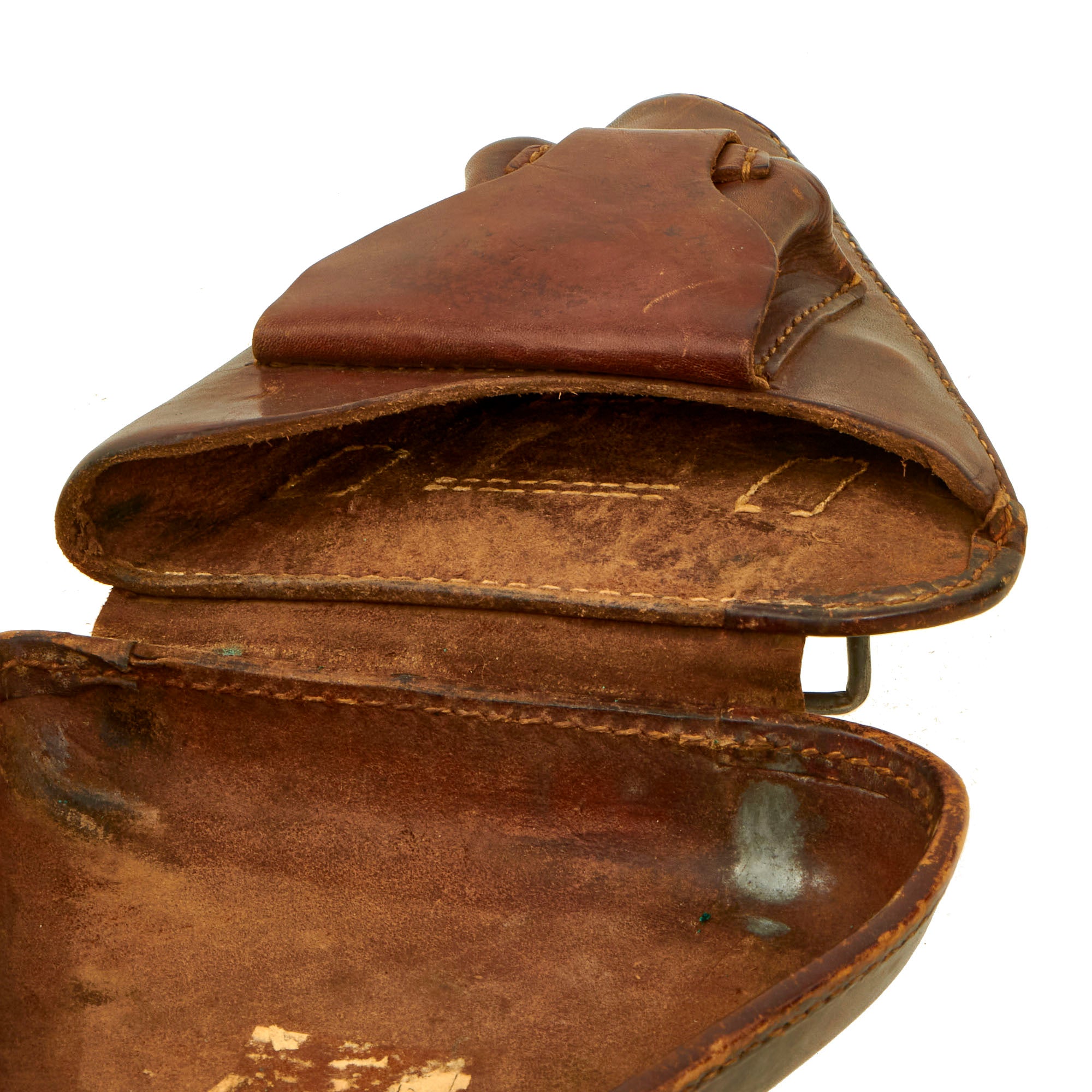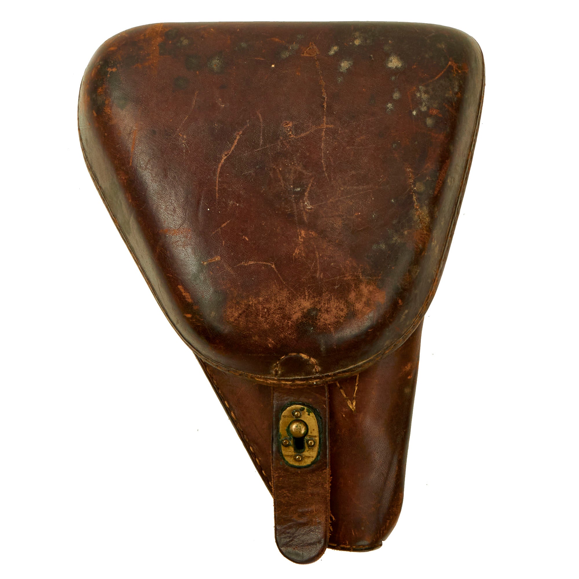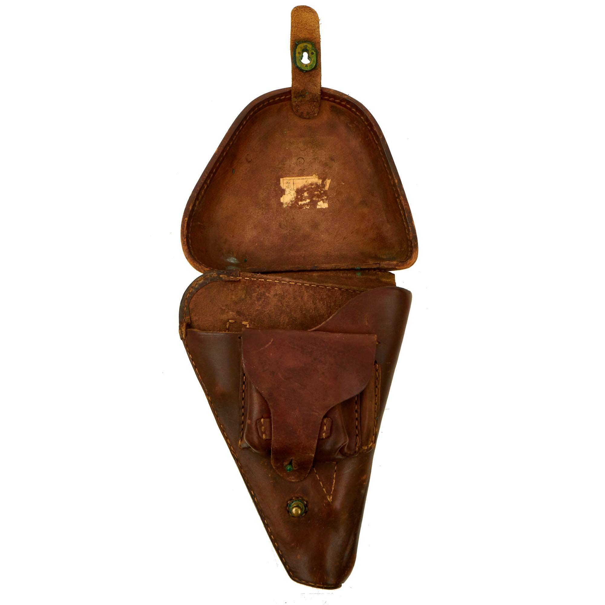 Original Item: Only One Available. This is a very nice original WWII Issue holster for the Japanese Nambu type 14 semi automatic pistol. It is constructed of thick leather with a hard shell lid which covers the pistol's grip as well as the spare ammunition compartment and firing pin pouch. There is also a flap covering the ammunition compartment, which is intact, and a loop inside to hold the combination cleaning rod take down tool. The rear of the holster has a belt loop, as well as two loops for a shoulder strap, which is not present.