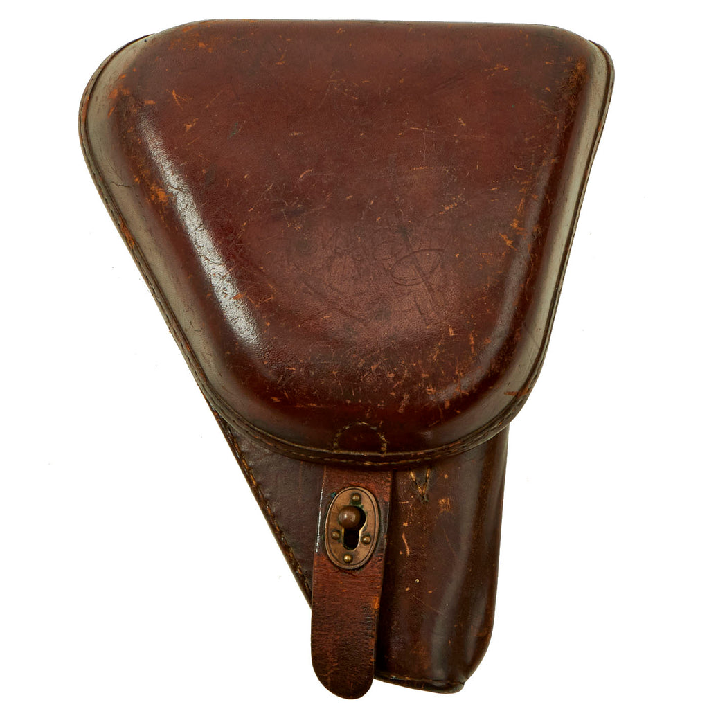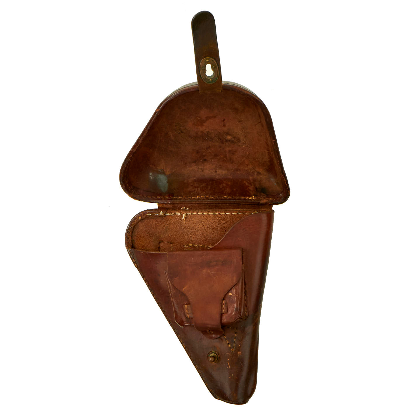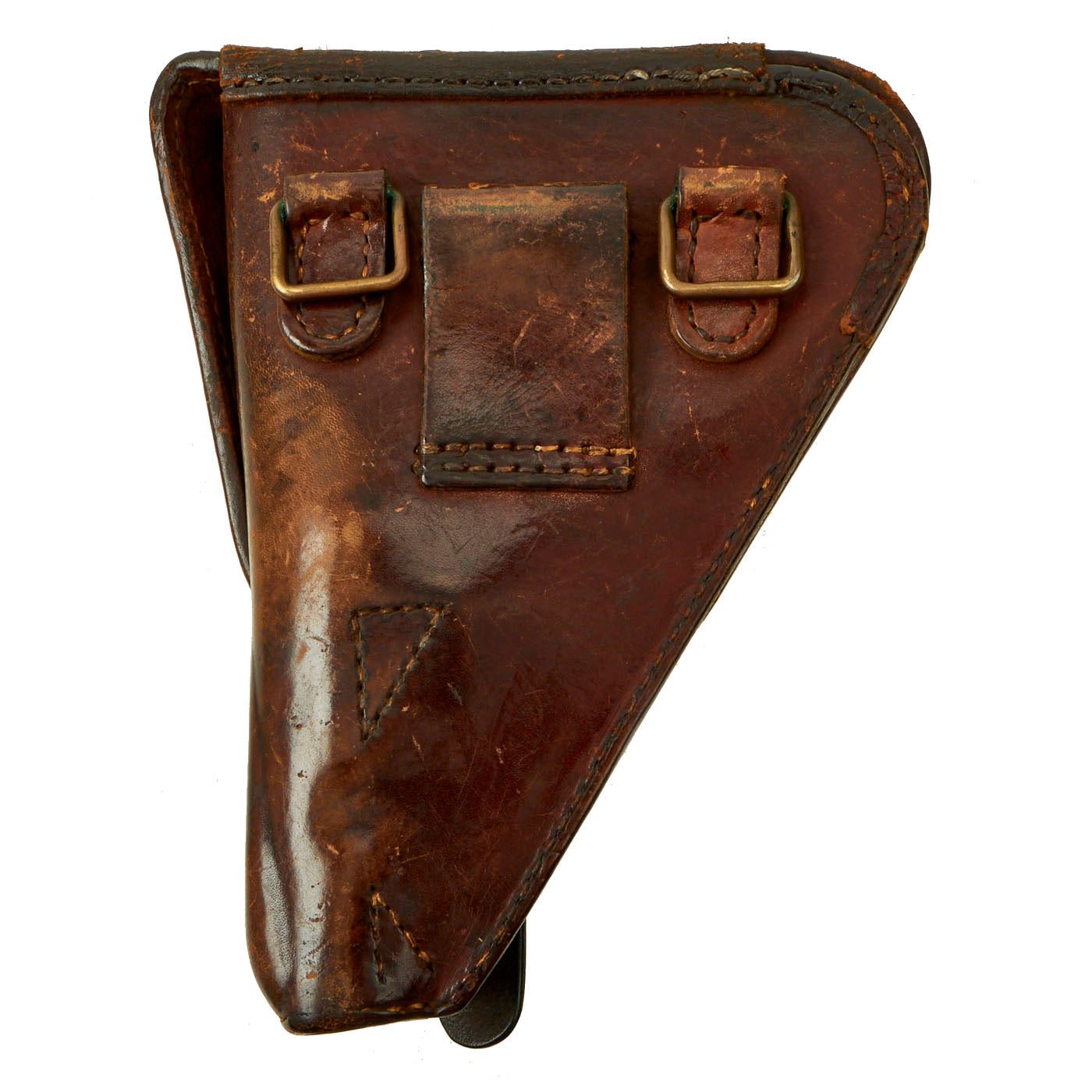 Original Item: Only One Available. This is a very nice original WWII Issue holster for the Japanese Nambu type 14 semi automatic pistol. It is constructed of thick leather with a hard shell lid which covers the pistol's grip as well as the spare ammunition compartment and firing pin pouch. There is also a flap covering the ammunition compartment, which is intact, and a loop inside to hold the combination cleaning rod take down tool. The rear of the holster has a belt loop, as well as two loops for a shoulder strap, which is not present.