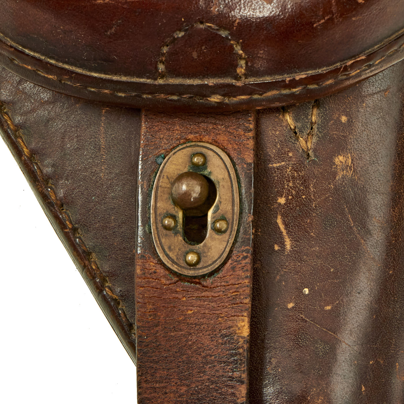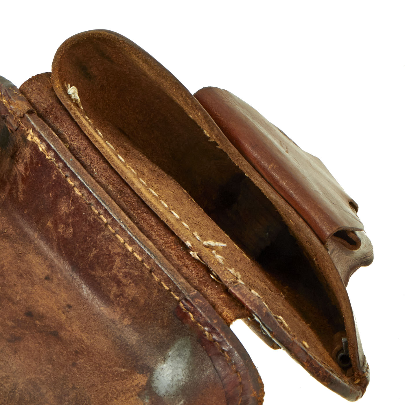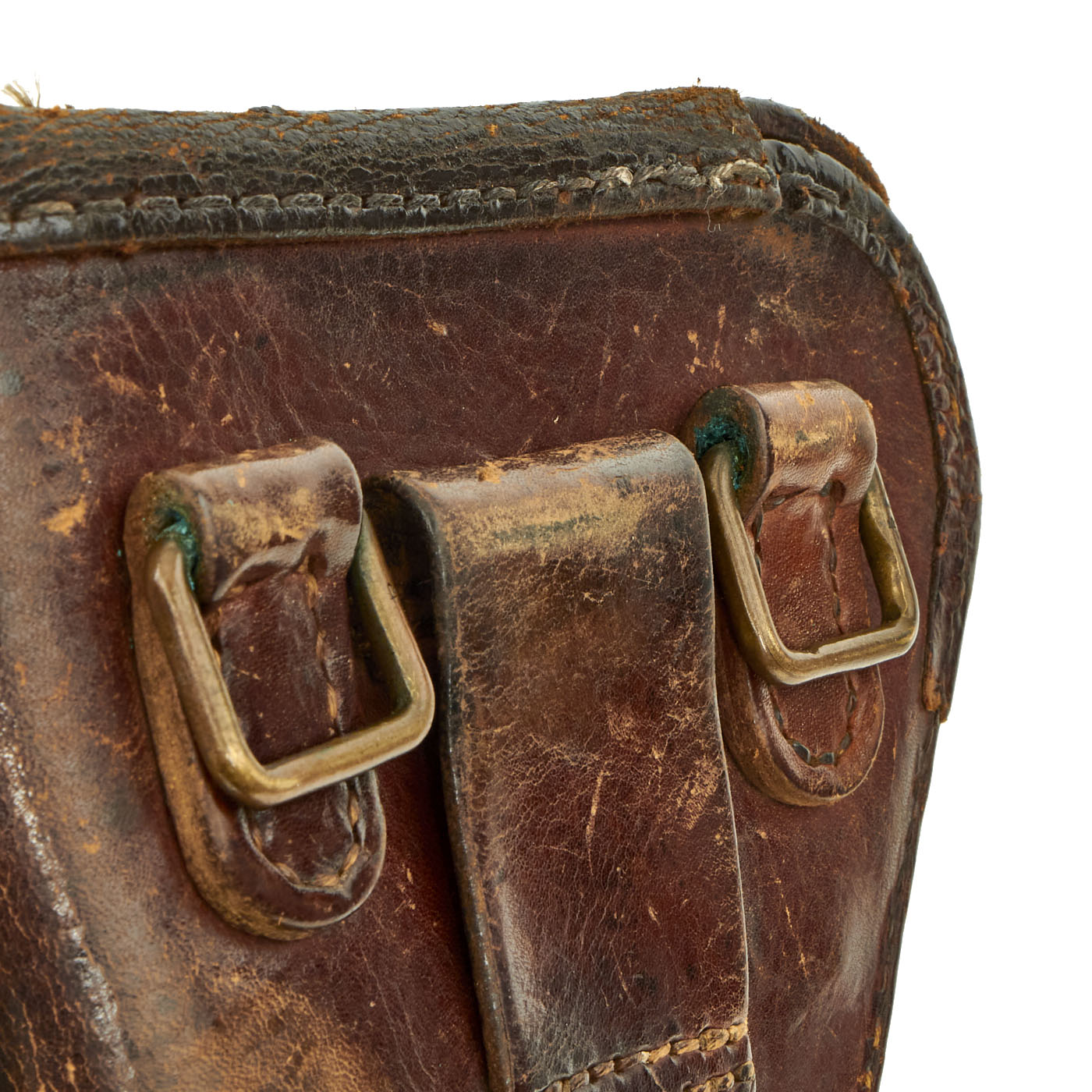 Original Item: Only One Available. This is a very nice original WWII Issue holster for the Japanese Nambu type 14 semi automatic pistol. It is constructed of thick leather with a hard shell lid which covers the pistol's grip as well as the spare ammunition compartment and firing pin pouch. There is also a flap covering the ammunition compartment, which is intact, and a loop inside to hold the combination cleaning rod take down tool. The rear of the holster has a belt loop, as well as two loops for a shoulder strap, which is not present.