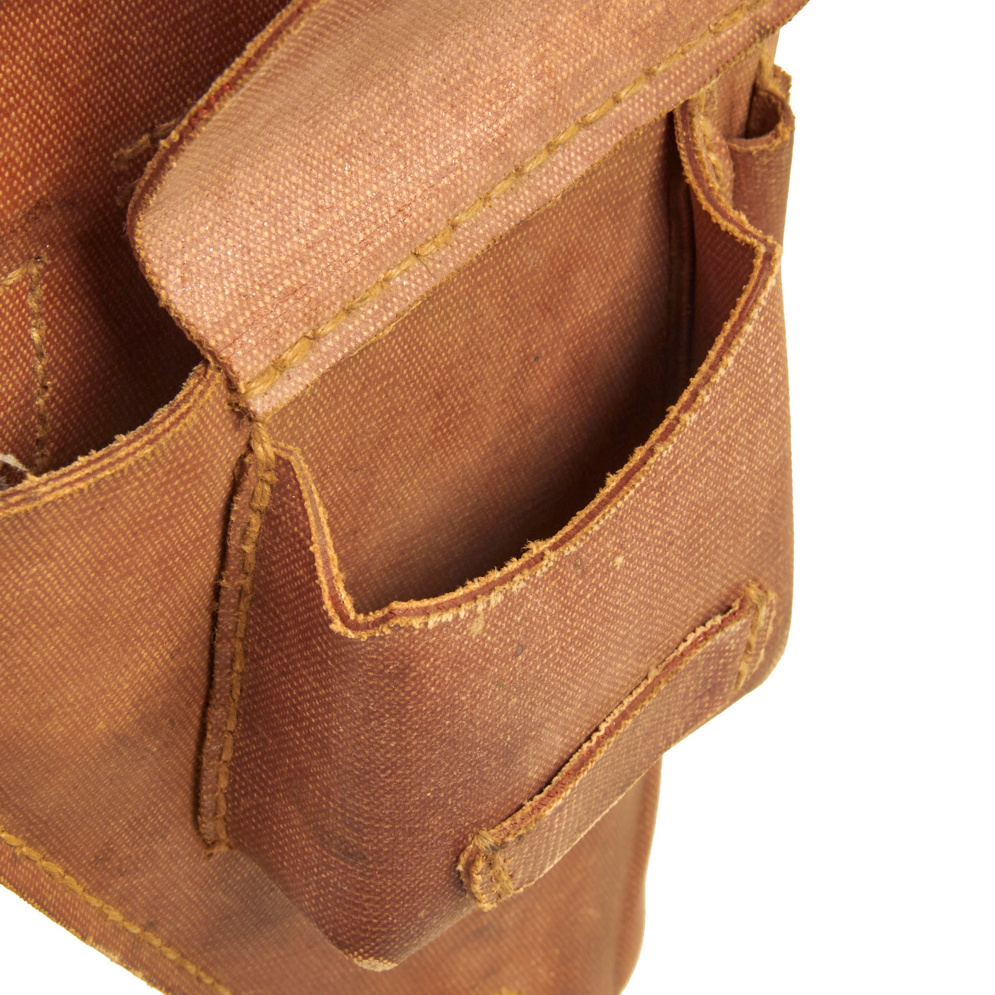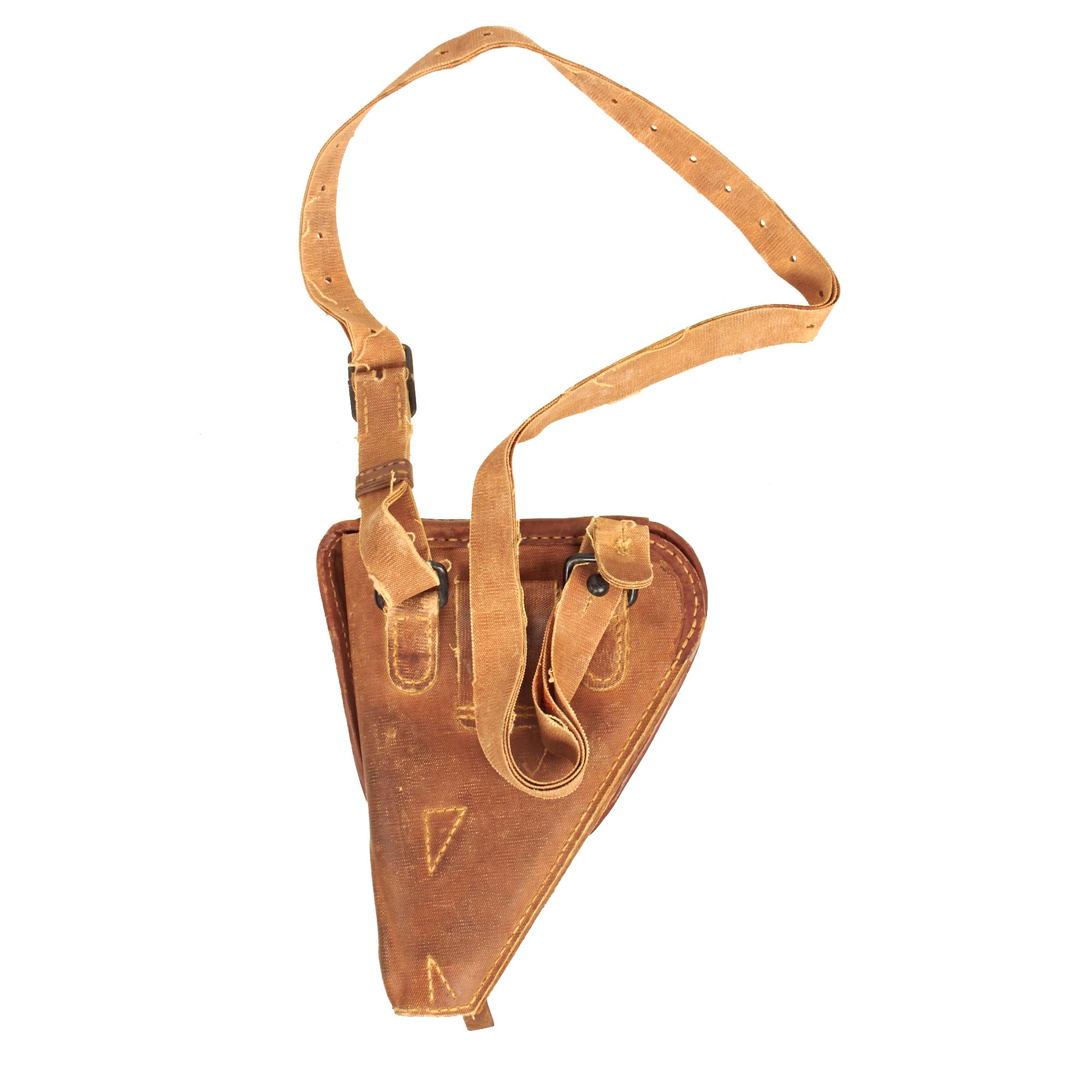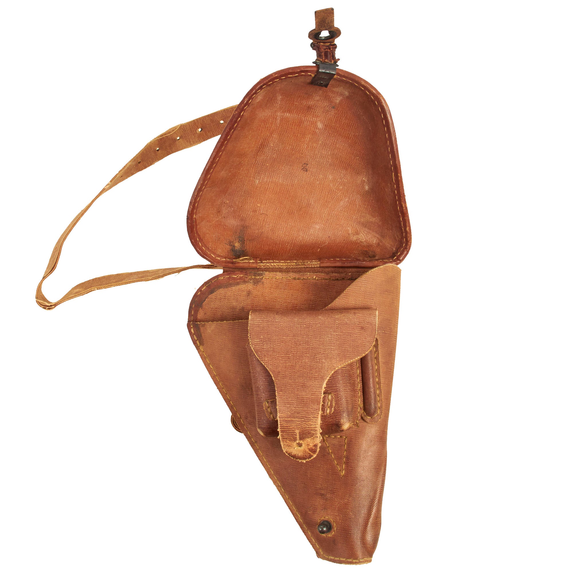 Original Item: Only One Available. This is a very good condition original WWII Issue holster for the Japanese Nambu type 14 semi automatic pistol. It is constructed of thick rubberized canvas with a hard shell lid which covers the pistol's grip as well as the spare ammunition compartment and firing pin pouch. There is also a flap cover the ammunition compartment, which is intact, and a loop inside the main compartment to hold the combination cleaning rod take down tool. The rear of the holster has a belt loop and two loops for a shoulder / cross strap, which in this case is actually included!