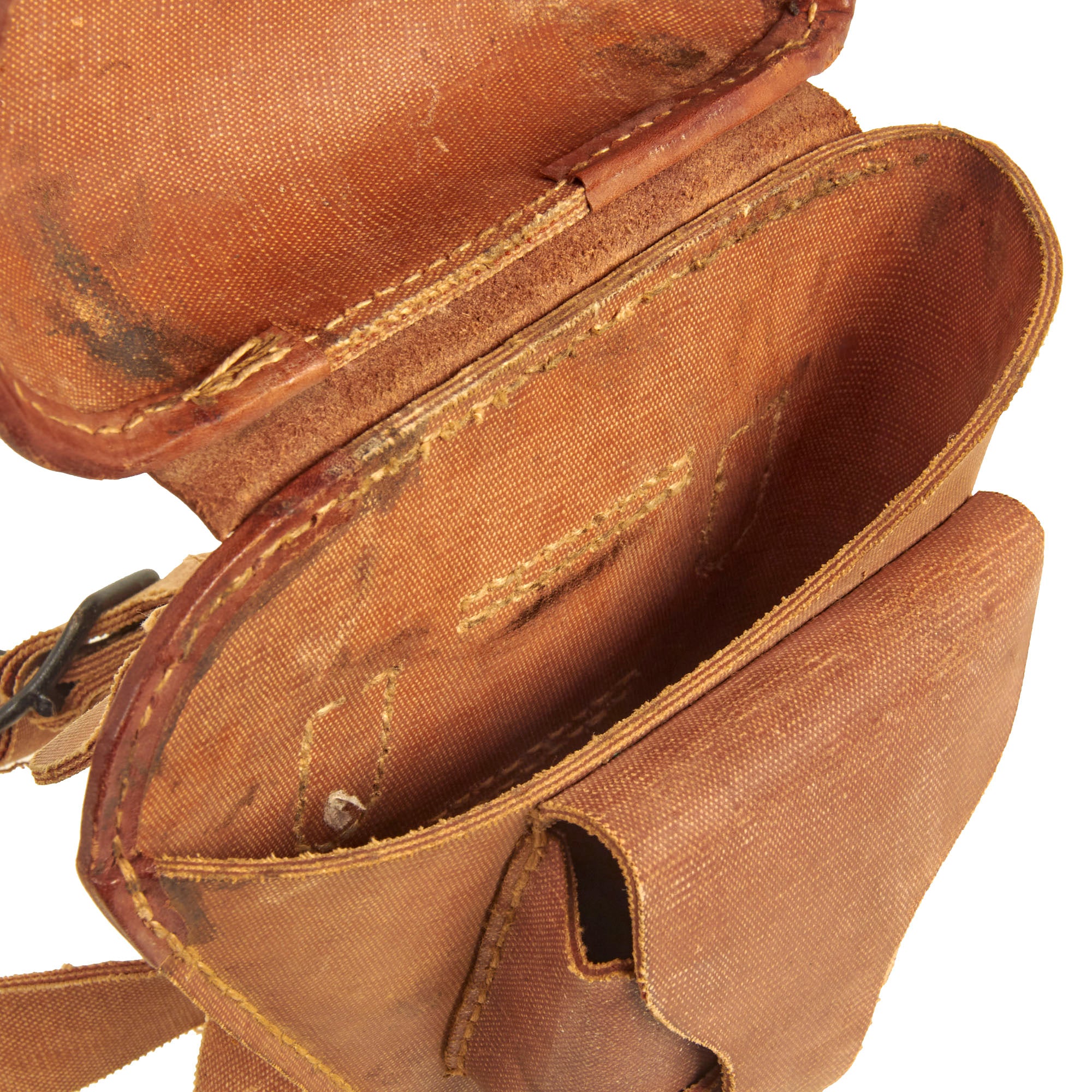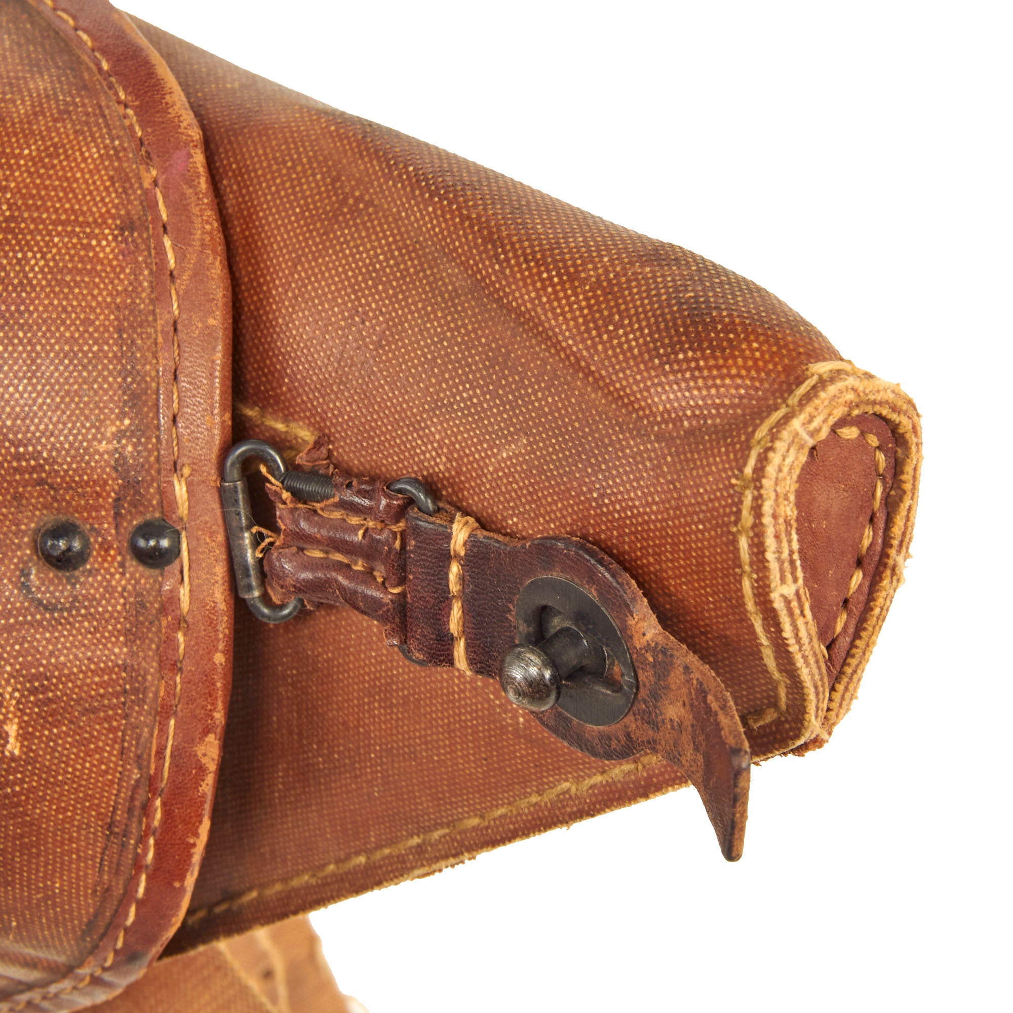 Overall the holster is in very good condition, though as with all rubberized canvas from WWII, the rubber has become quite hard. We were able to open the ammo pouch cover, and see that it is empty. The holster still has a complete leather closure strap, with an intact pull tab, showing some tearing around the springs.