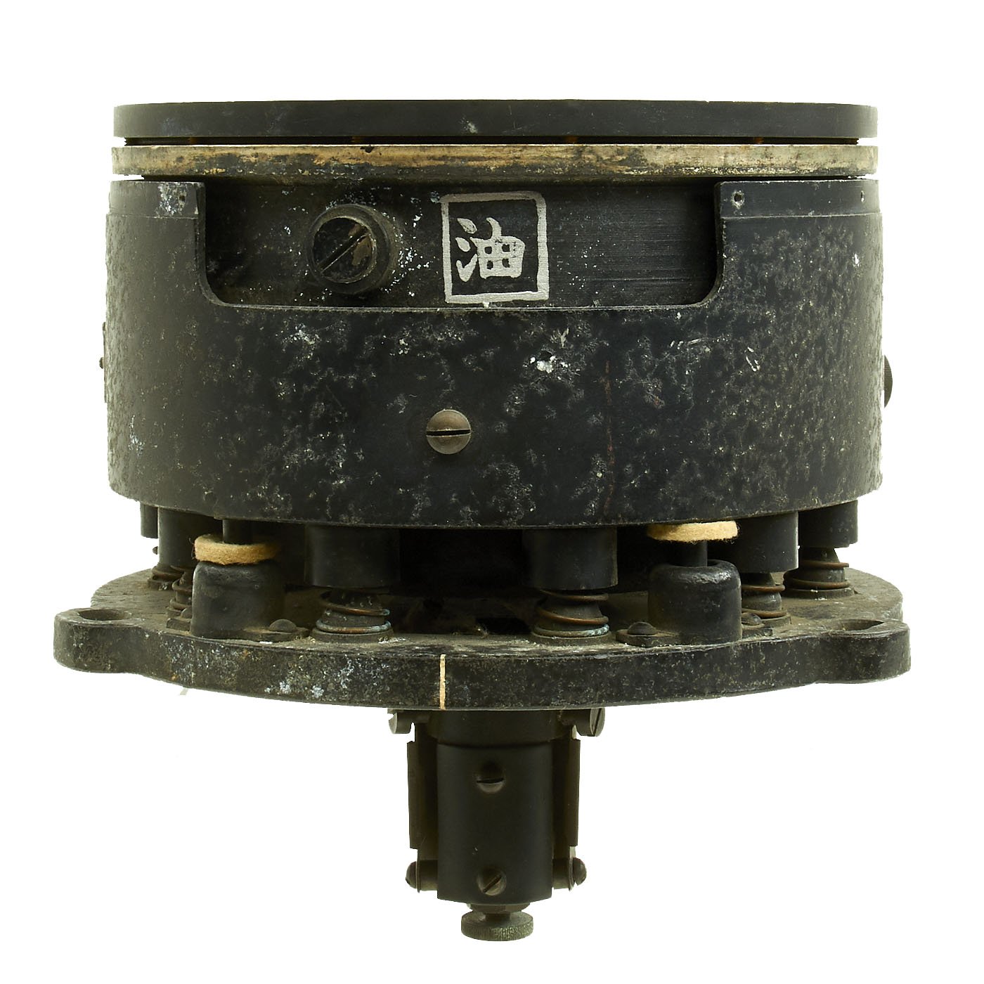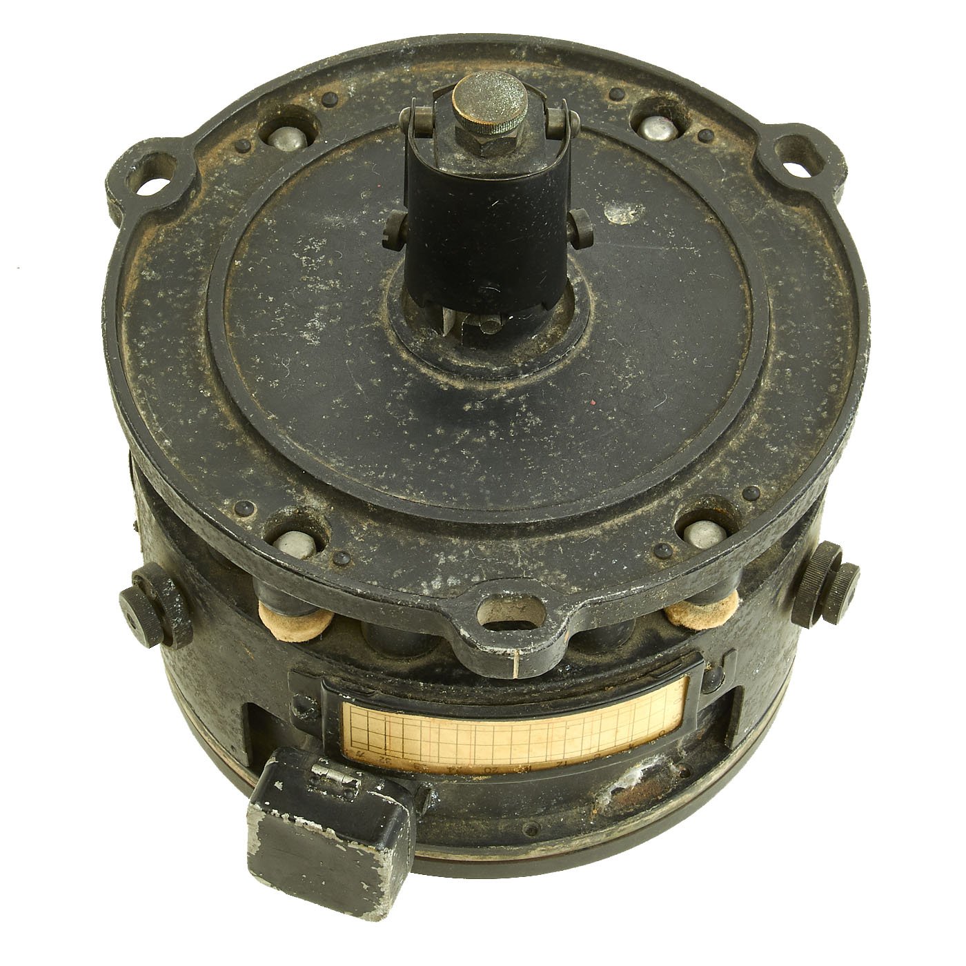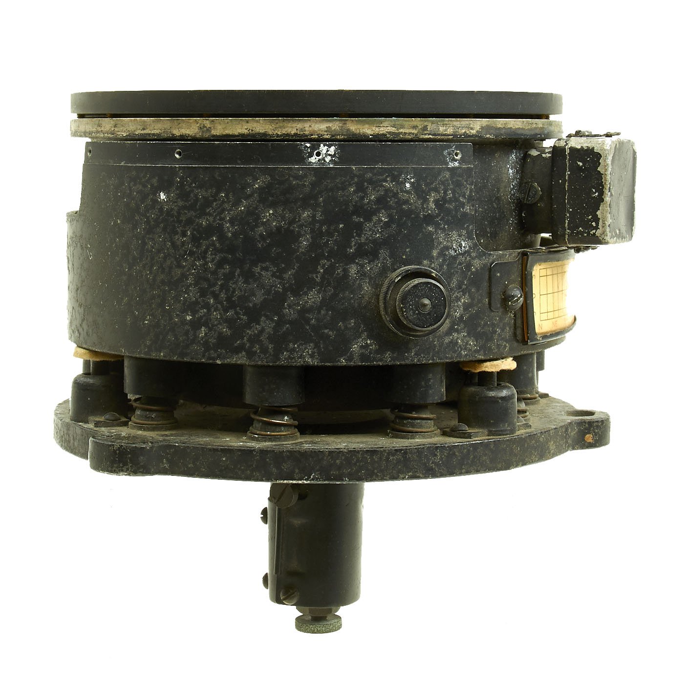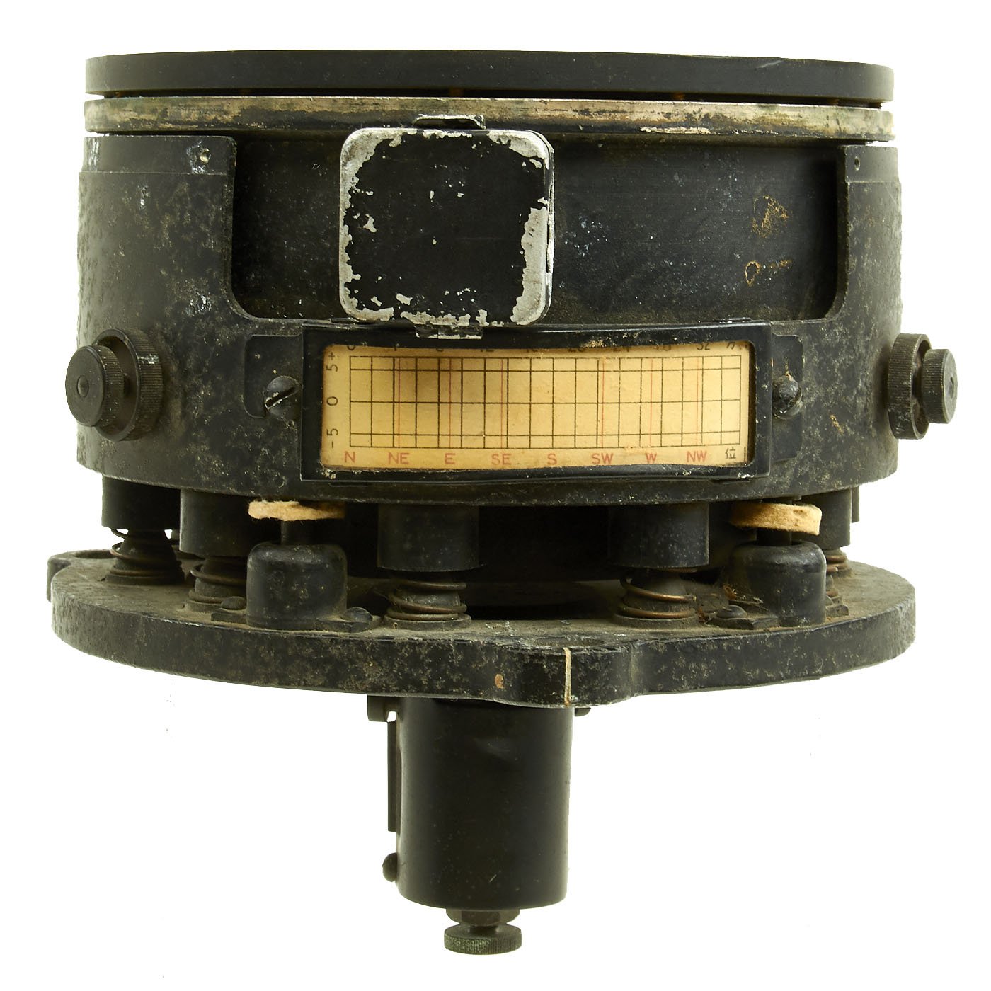 The KAI compass originally had a reflector assembly with a mirror to permit viewing horizontally, as this compass was mounted glass-up. The markings within the compass are reversed so they would read correctly when reflected in the mirror. Unfortunately this example no longer has the reflector, which may not have ever been installed. THe compass has a stem protruding from the bottom, which was used to mount it inside the aircraft. We have unfortunately not been able to find any pictures of the proper mounting.