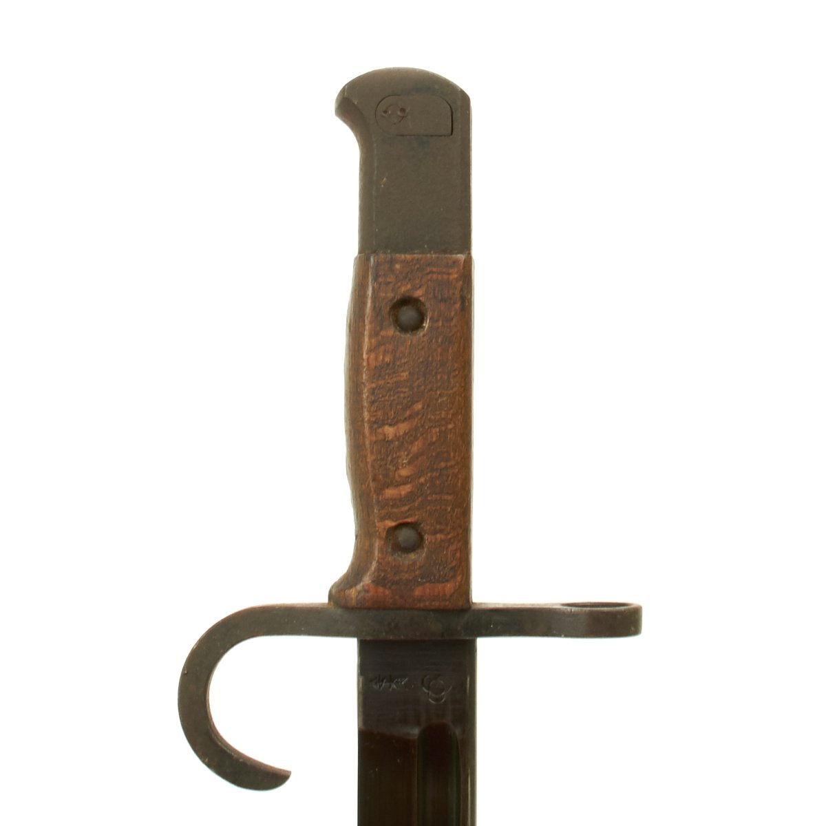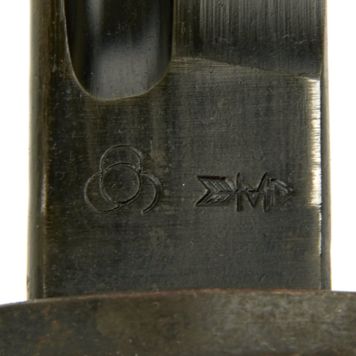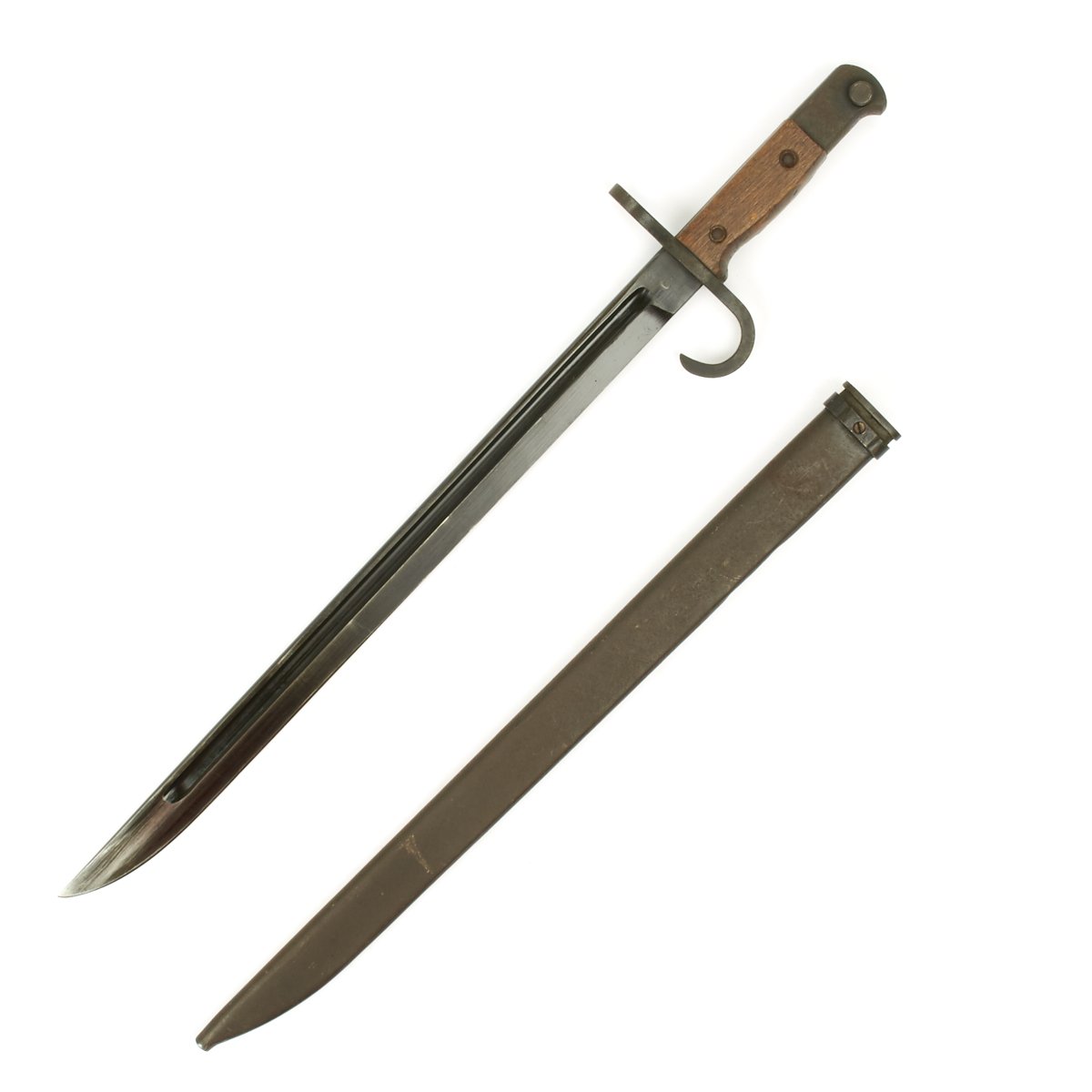 The Type 30 Bayonet was a single-edged sword bayonet with a 400 millimetres (15.75 in) blade and an overall length of 514 millimetres (20.24 in) with a weight of approximately 700 grams. The Type 30 bayonet is also known as the Pattern 1897 bayonet. Early Type 30 bayonets usually sported a hooked quillion guard which gave it a distinct look, but later models had a straight hand guard. This bayonet is of the earliest design, with a hooked quillion, with the earliest style rounded "birds head" shaped pommel. End of pommel bears serial number 263212