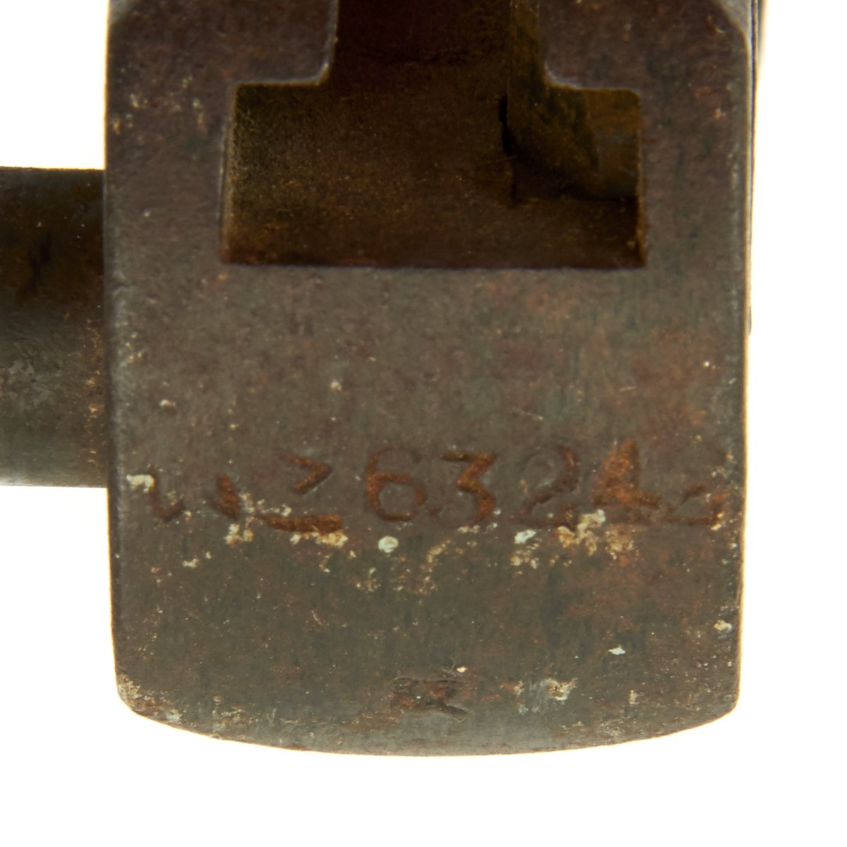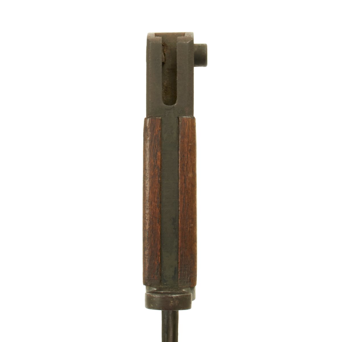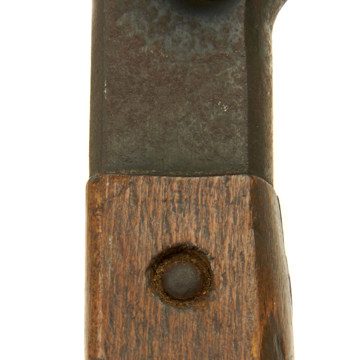 The Type 30 Bayonet was a single-edged sword bayonet with a 400 millimetres (15.75 in) blade and an overall length of 514 millimetres (20.24 in) with a weight of approximately 700 grams. The Type 30 bayonet is also known as the Pattern 1897 bayonet. Early Type 30 bayonets usually sported a hooked quillion guard which gave it a distinct look, but later models had a straight hand guard. This bayonet is of the earliest design, with a hooked quillion, with the earliest style rounded "birds head" shaped pommel. End of pommel bears serial number 263212