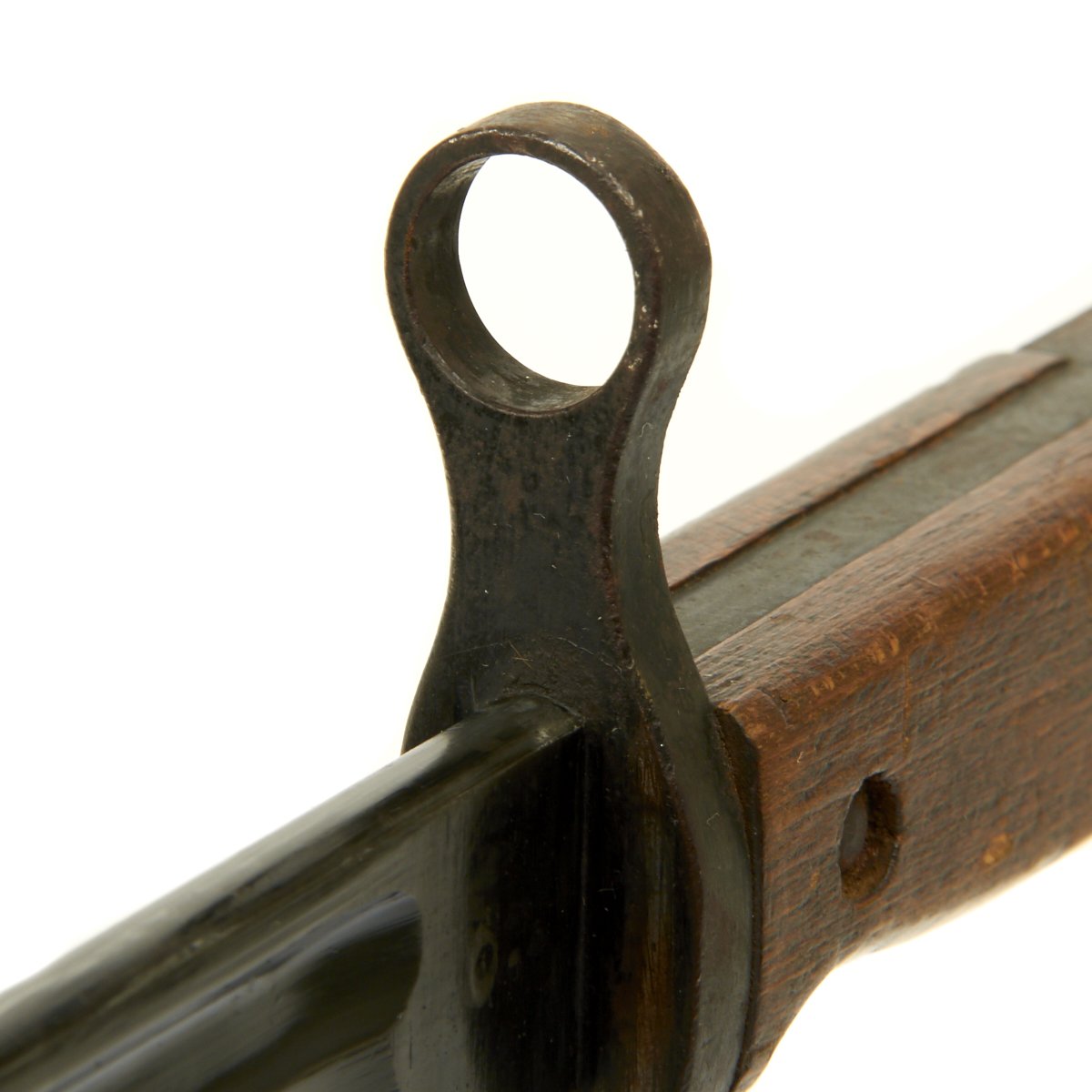 Original Item: Only One Available. This is an excellent example complete with early hooked quillion guard, steel scabbard and genuine leather frog. The Type 30 bayonet (?????? sanjunen-shiki juken?) was a bayonet designed for the Imperial Japanese Army to be used with the Arisaka Type 30 Rifle and was later used on the Type 38 and Type 99 rifles. Some 8.4 million were produced, and it remained in front-line use from the Russo-Japanese War to the end of World War II.