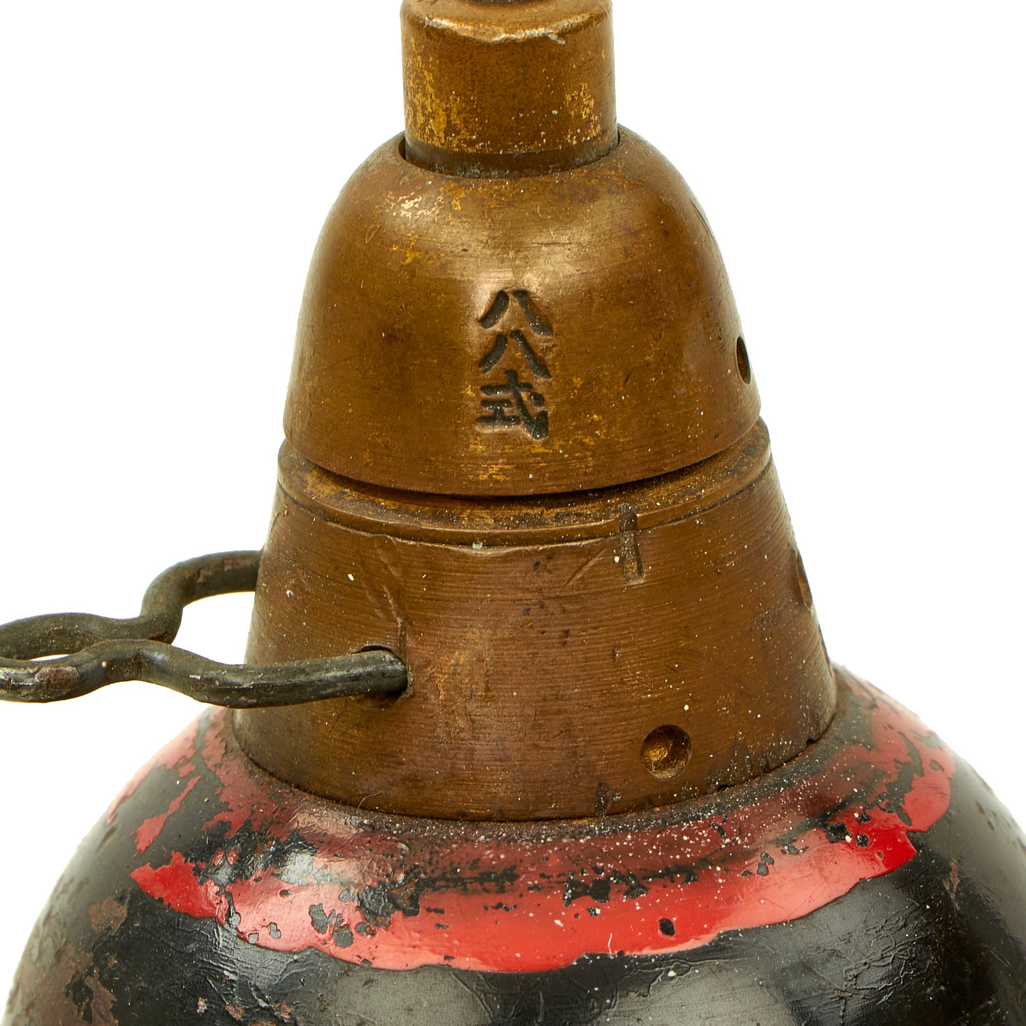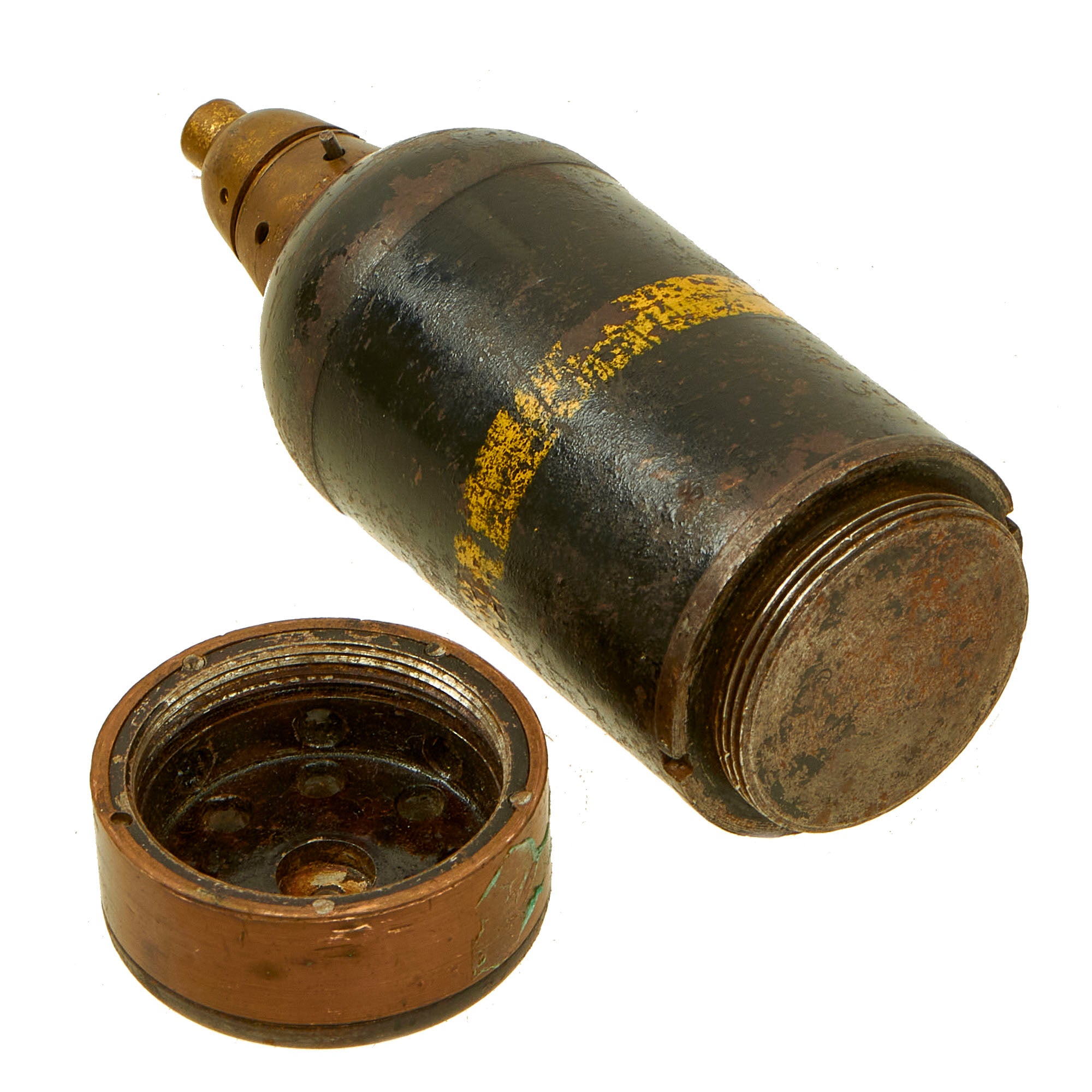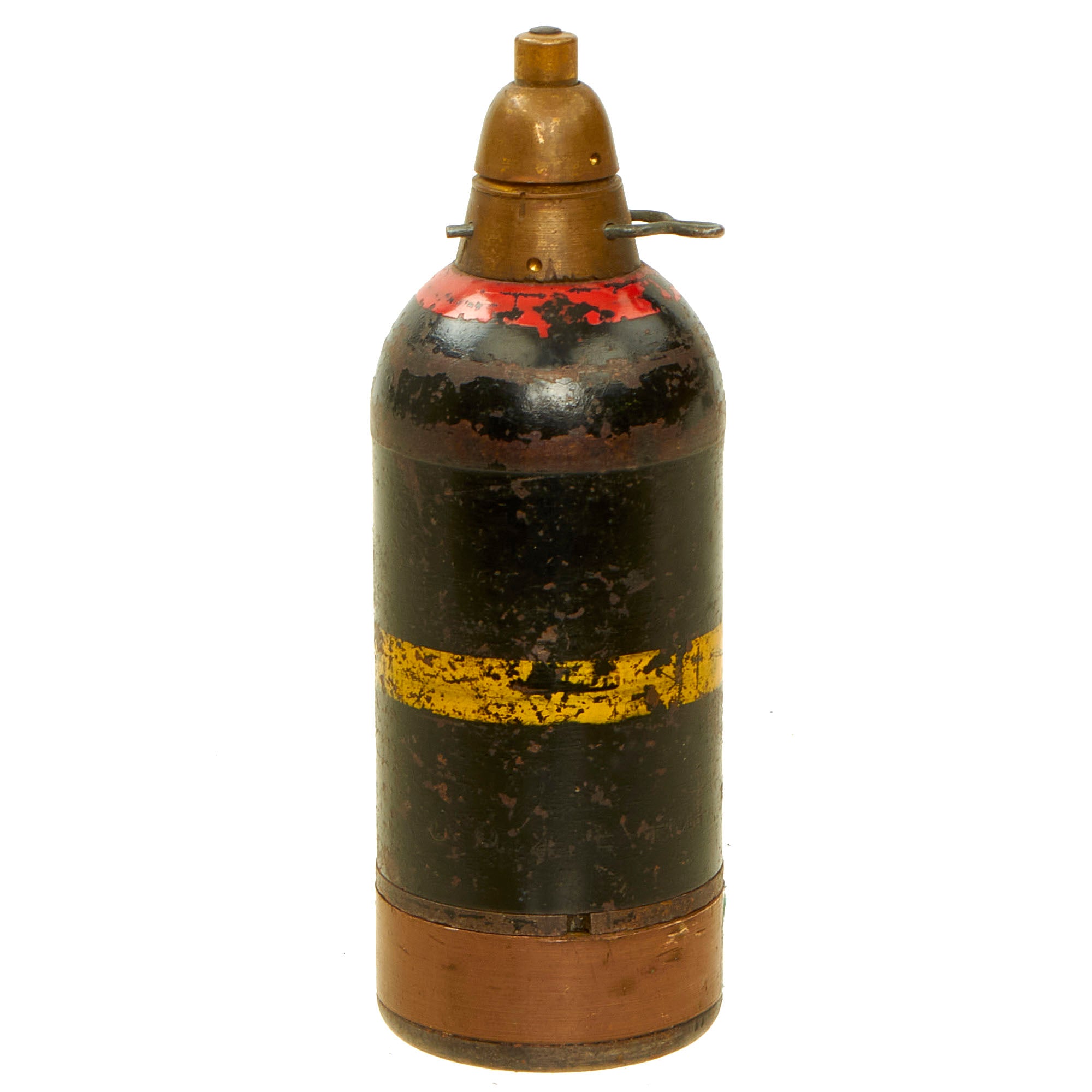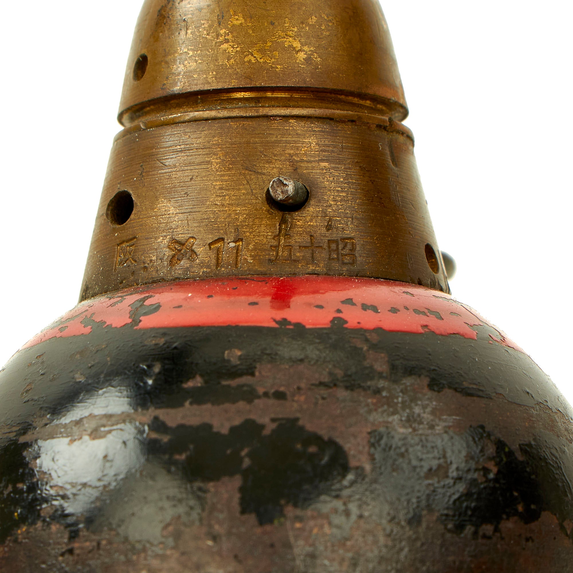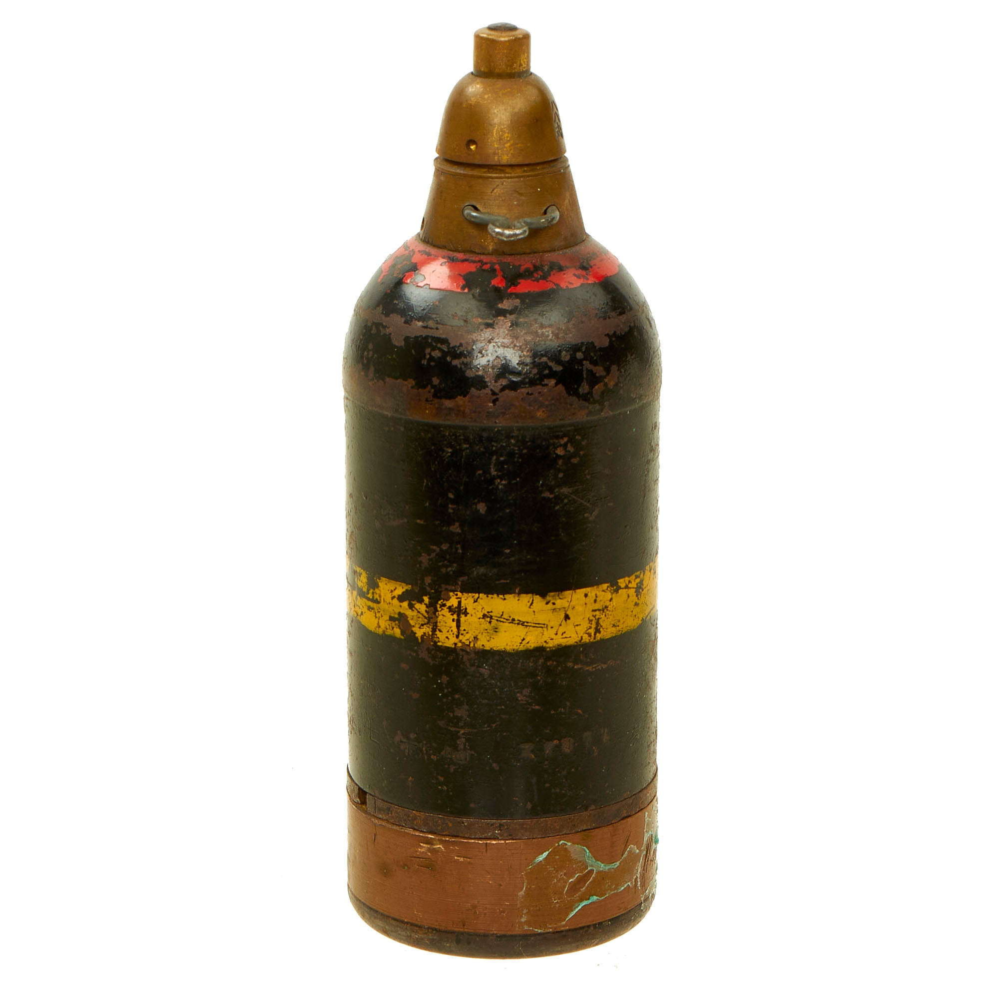 Original Items: Only One Available. This is a genuine Japanese World War II 50mm Mortar, Type 89 grenade with a Type 88 instantaneous fuze. Features original paint with a yellow band on the body and a red band at the top.