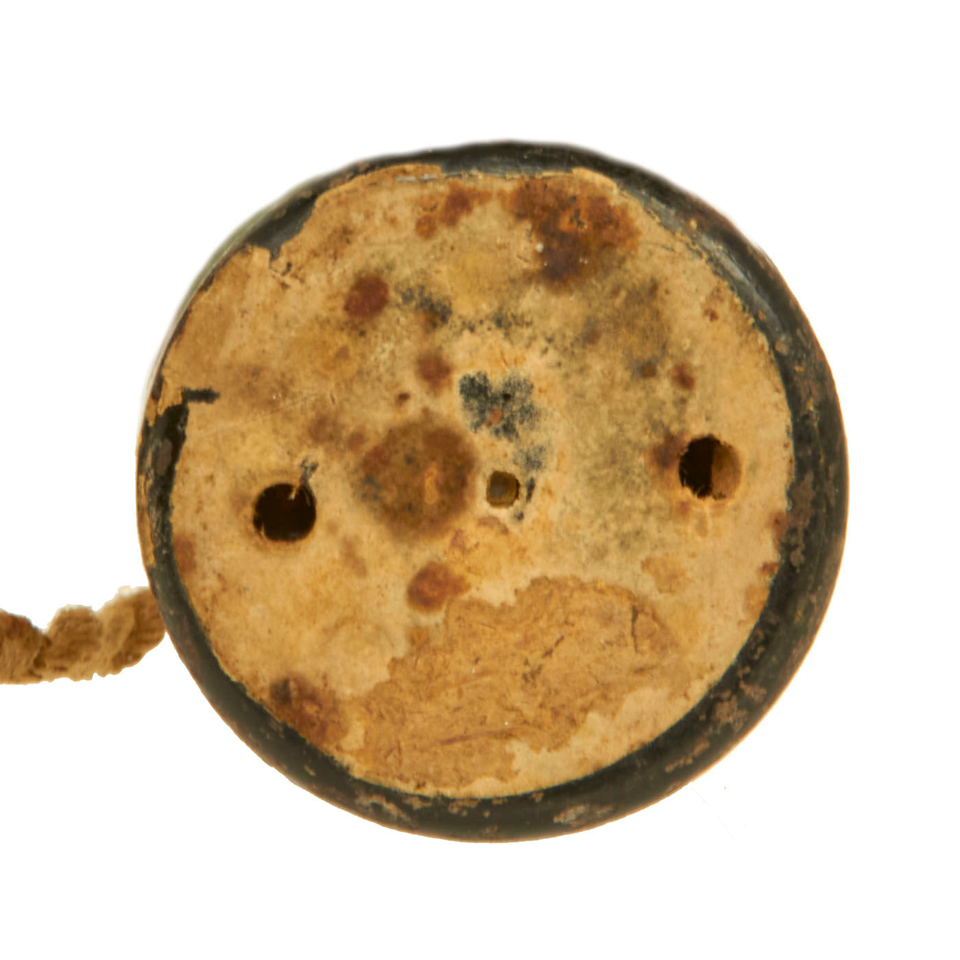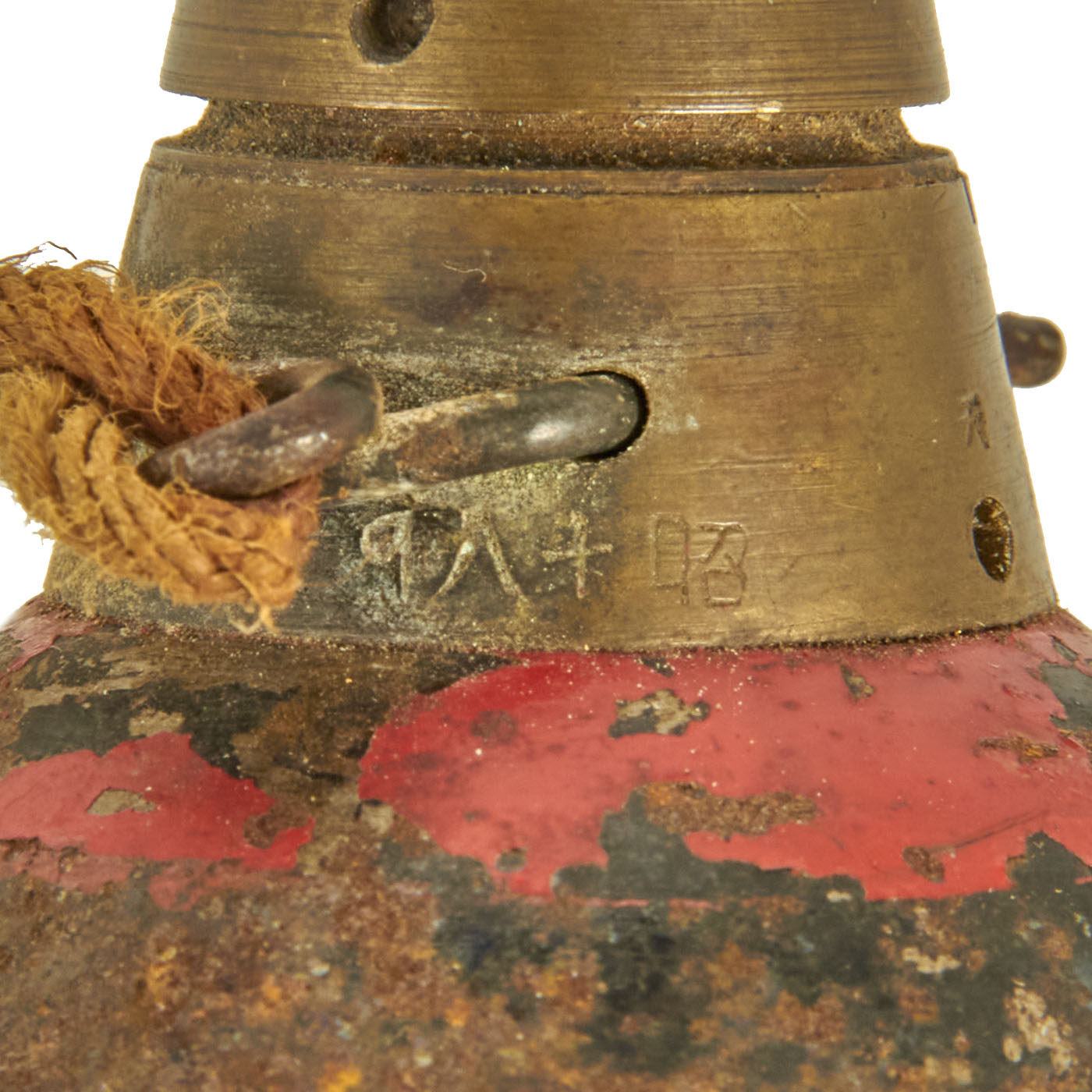 The fuze still has an intact spring in the nose, and is stamped with several Japanese characters. The brass fuze housing itself is dated 9 六 十 昭. This marking is written right to left, and would be read: SHOWA (current reigning emperor) Juu-Roku Nen (16th year of reign - 1941), probably the 9 month of September. There are also arsenal markings on the body of the round.
