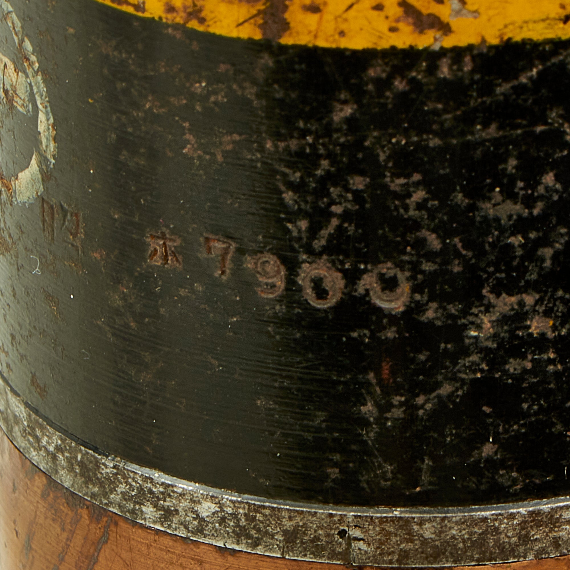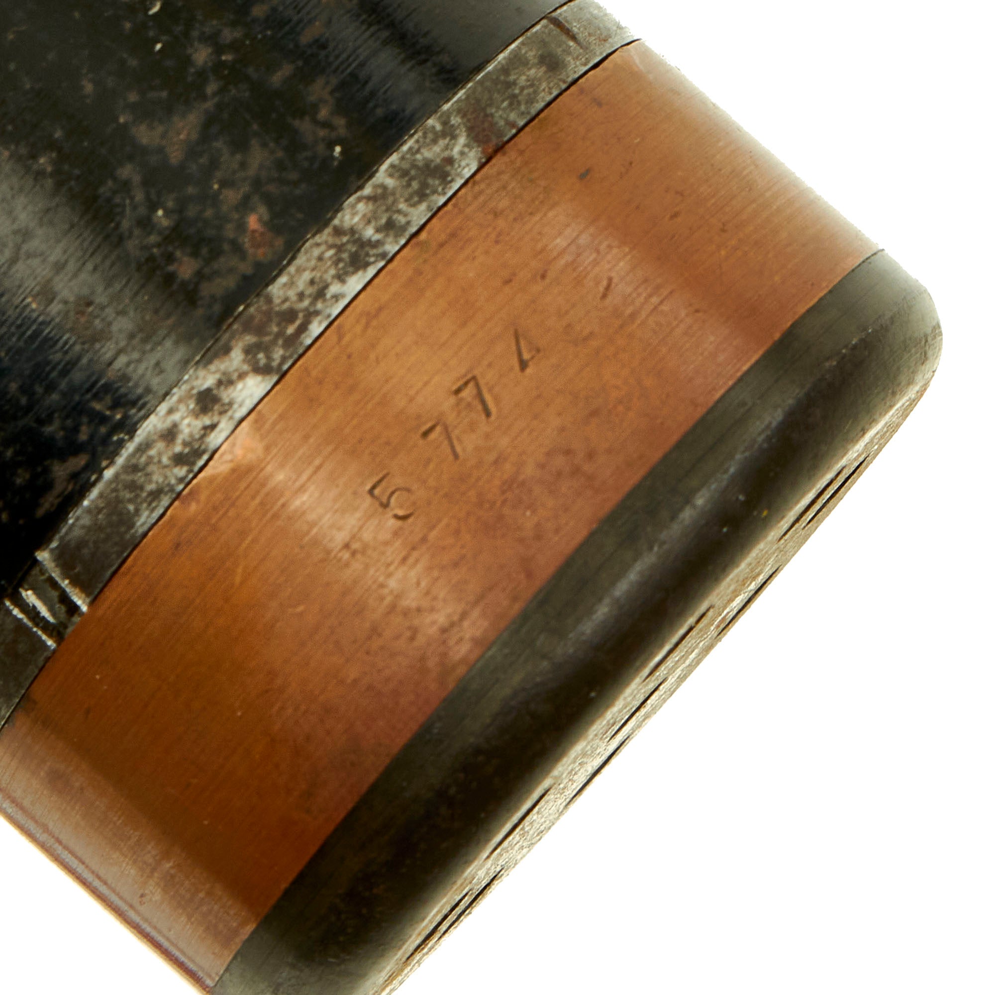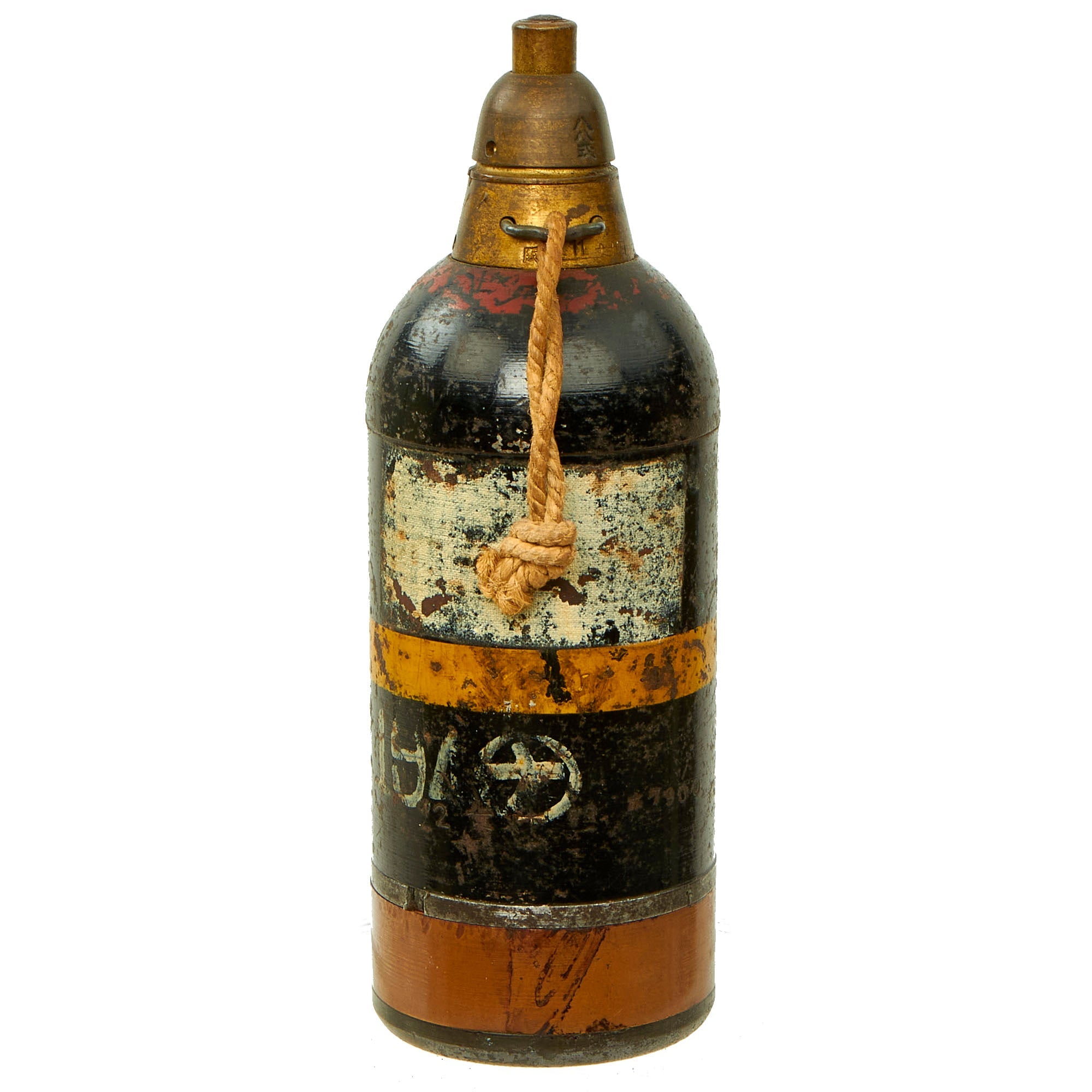 The fuze still has an intact spring in the nose, and is stamped with several Japanese characters. The brass fuze housing itself is dated: 11 七 十 昭. This marking is written right to left, and would be read: SHOWA (current reigning emperor) Juu-Nana (17th year of reign - 1942) 11th month (November).There are also arsenal markings on the body of the round and the same date marking but for the 12th month (December).