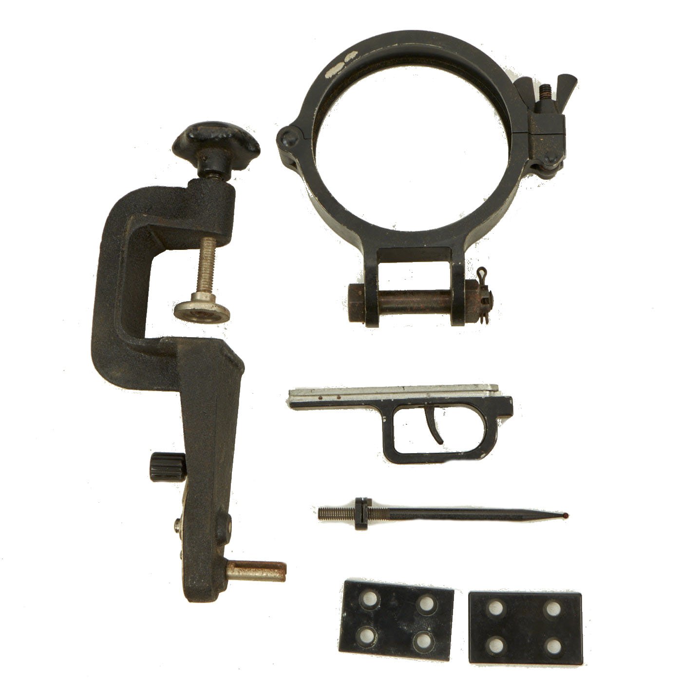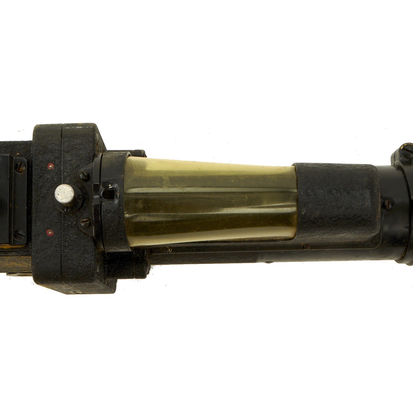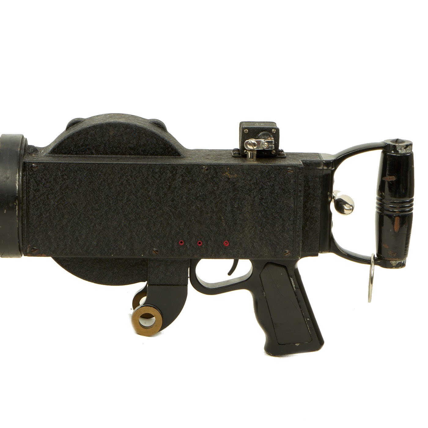 A multi-purpose training device, this "gun" is effectively a camera mounted in an oversized housing, suitable for installation in a wing mount or waist-gun emplacement. When the trigger is pulled, the camera runs, with footage being taken of what the gun is aimed at, as well as an optional stopwatch; after landing, the film can be analyzed by the trainers for proper lead and burst timing. Measuring 29 inches overall with a matte black finish, a transparent housing and reflector array on the "barrel" for the stopwatch, mounting positions for a set of anti-aircraft sights (included), and nomenclature plates on top and on the right side behind the crank.