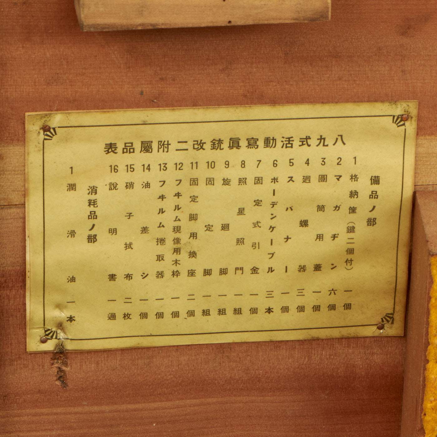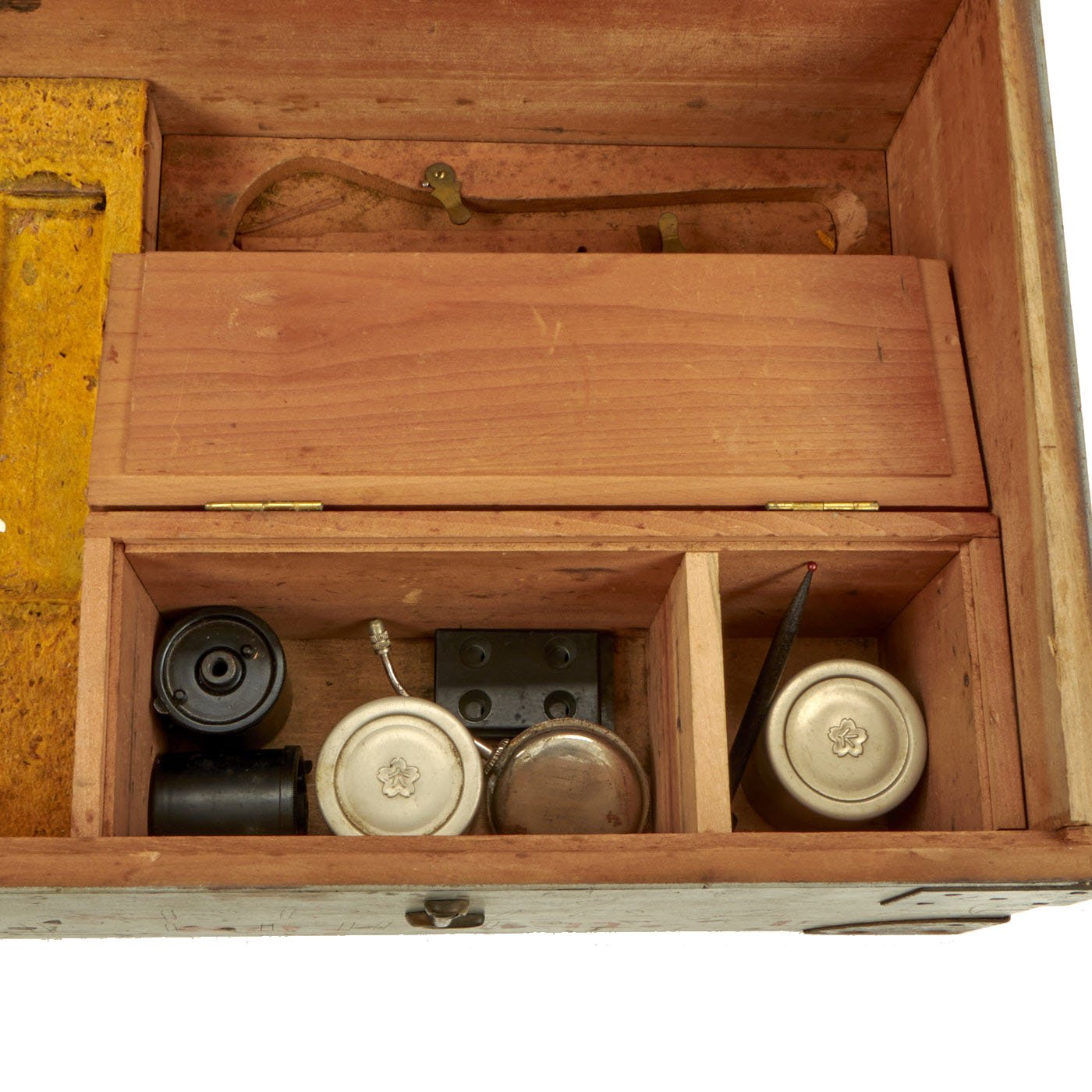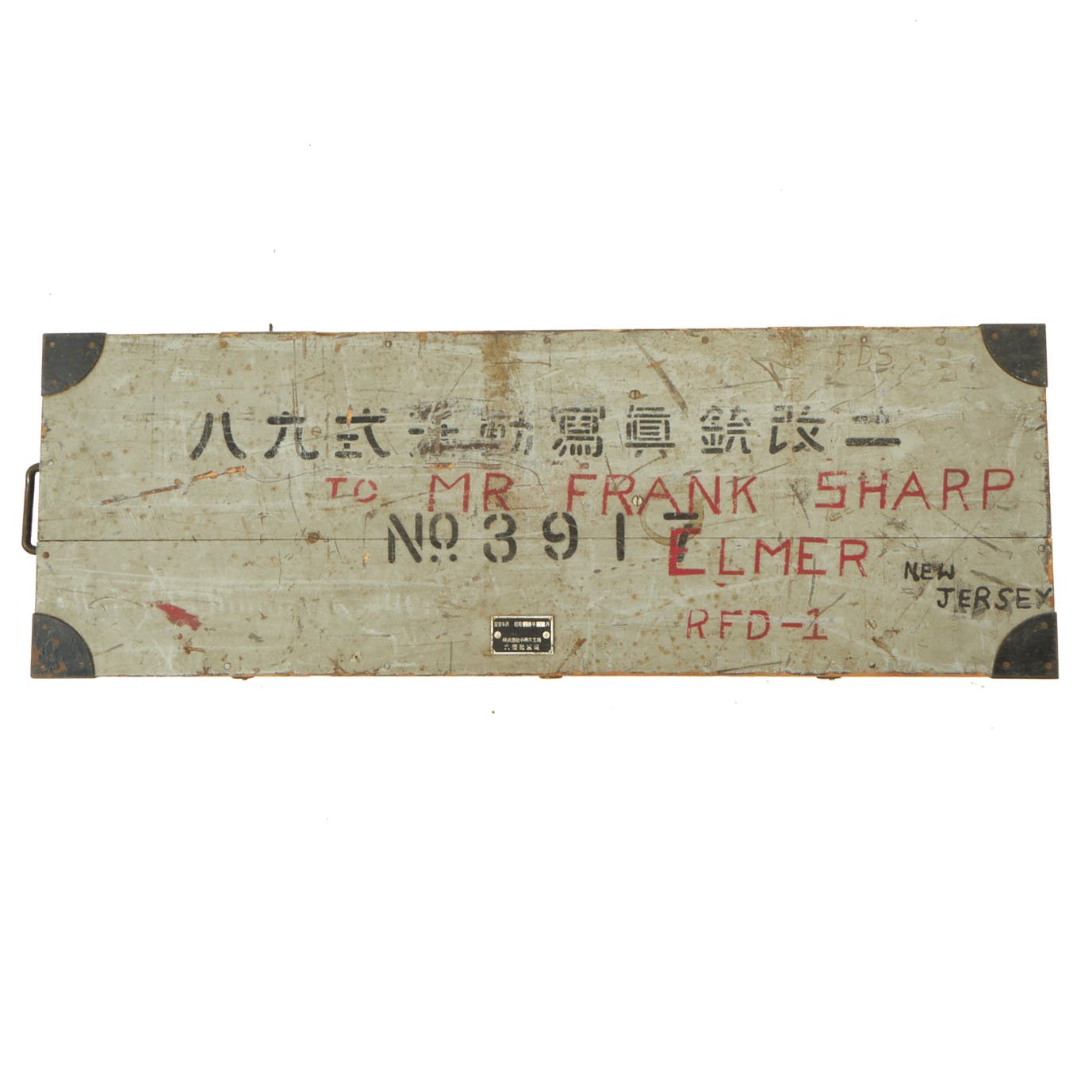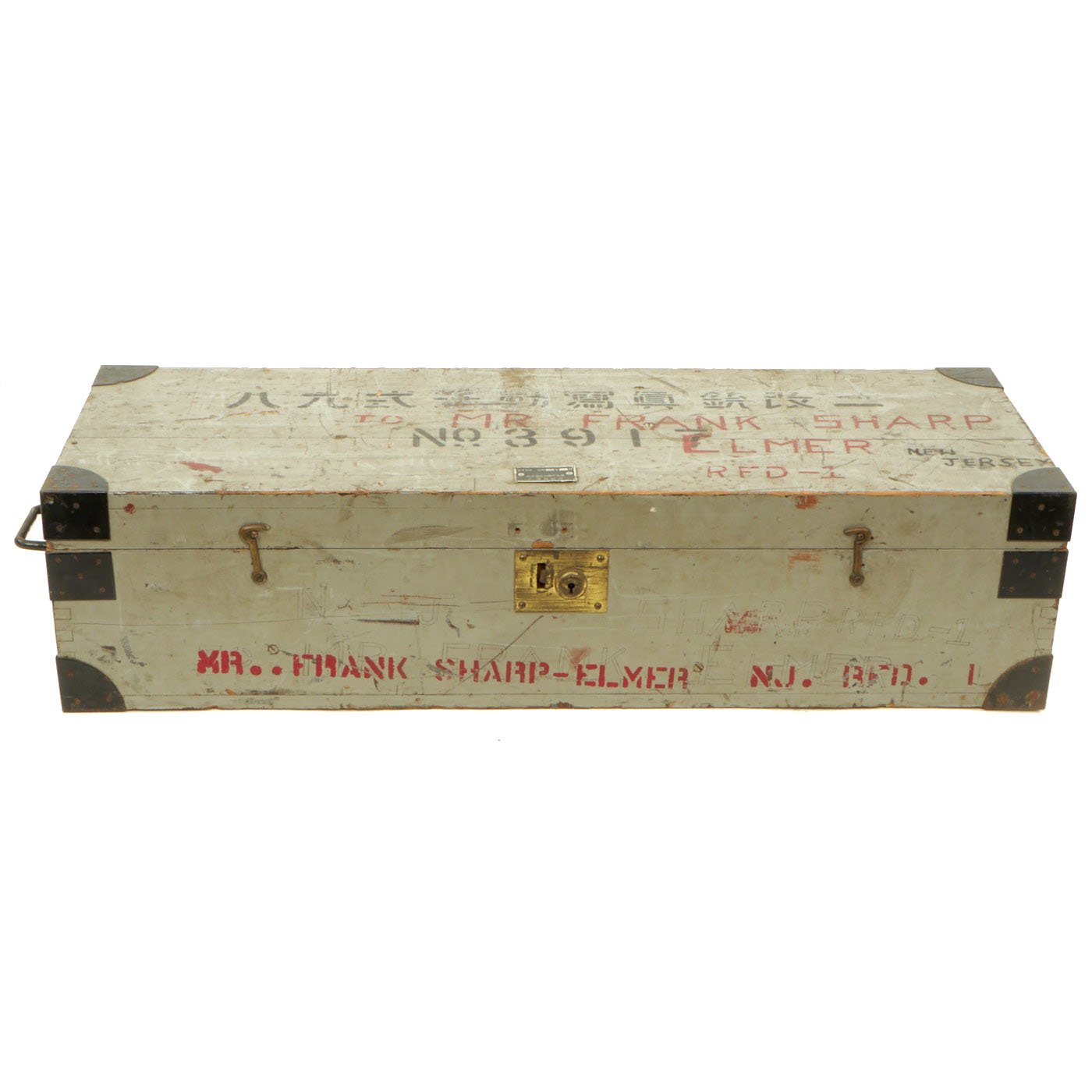 This example of the Japanese WWII Type 89 Rokuohsha Machine Gun Camera is serial number 3917 which is marked on both the gun and transit chest. It has an original manual, multiple parts and accessories. This is the most complete example we have ever encountered or even heard of. Additionally the chest was marked by MR. FRANK SHARP of Elmer, New Jersey as he sent it back from Japan after World War Two as a souvenir of war.