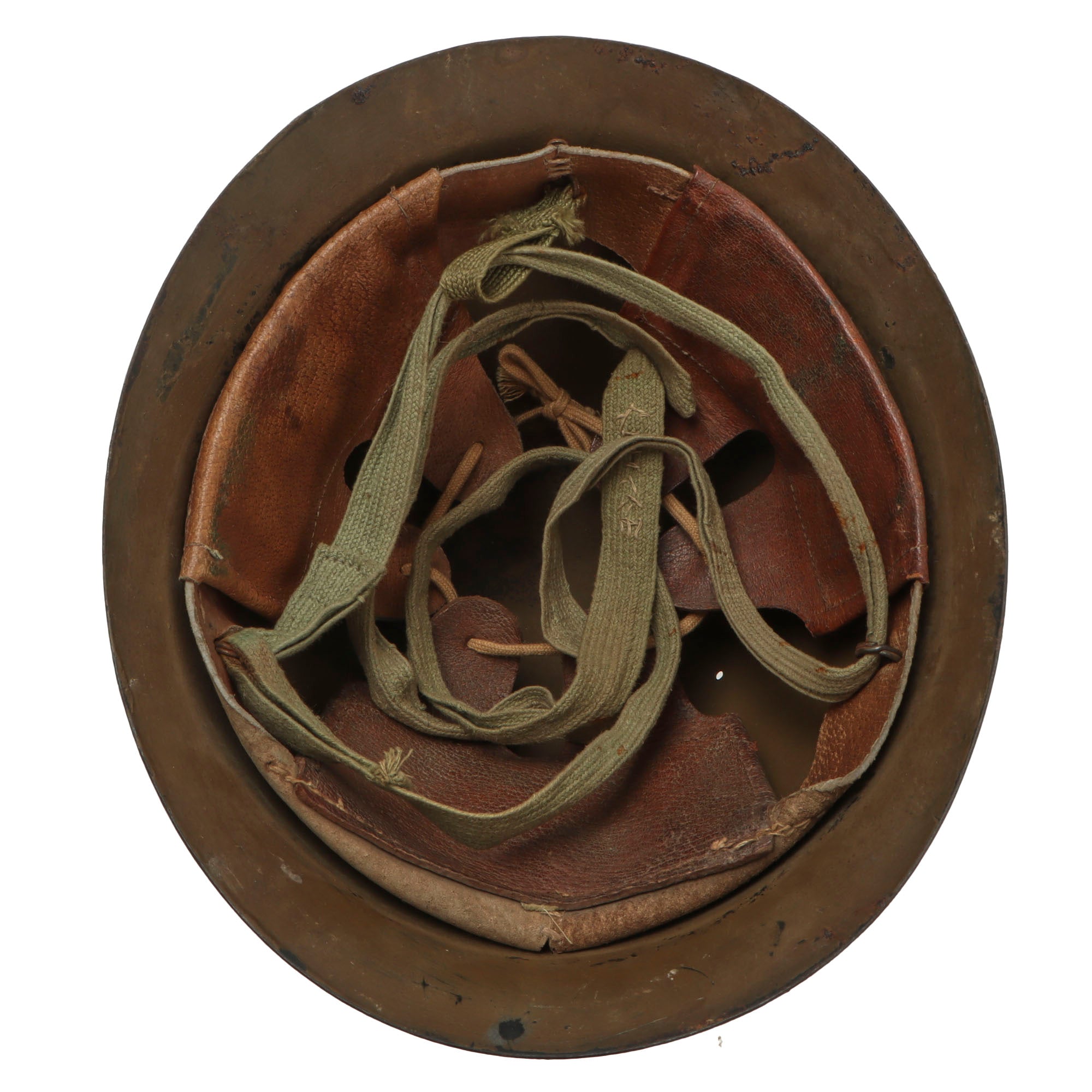 - Original, worn tie down chinstrap. The end of the chinstrap has a lovely hand-stitched name, although we could not transcribe it.