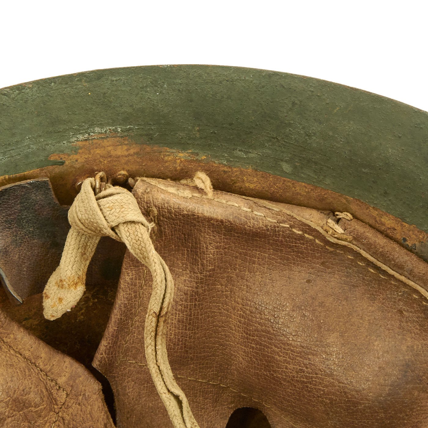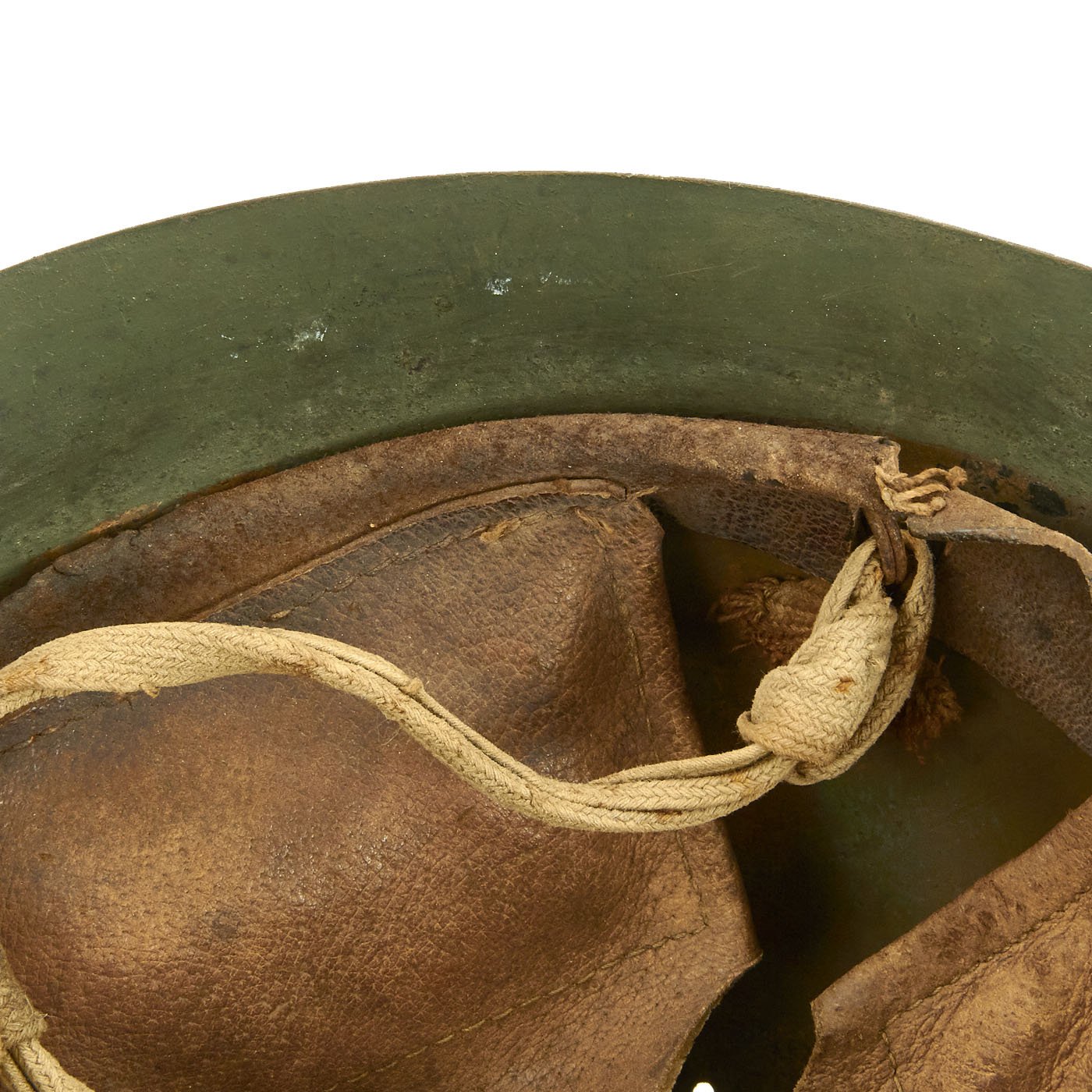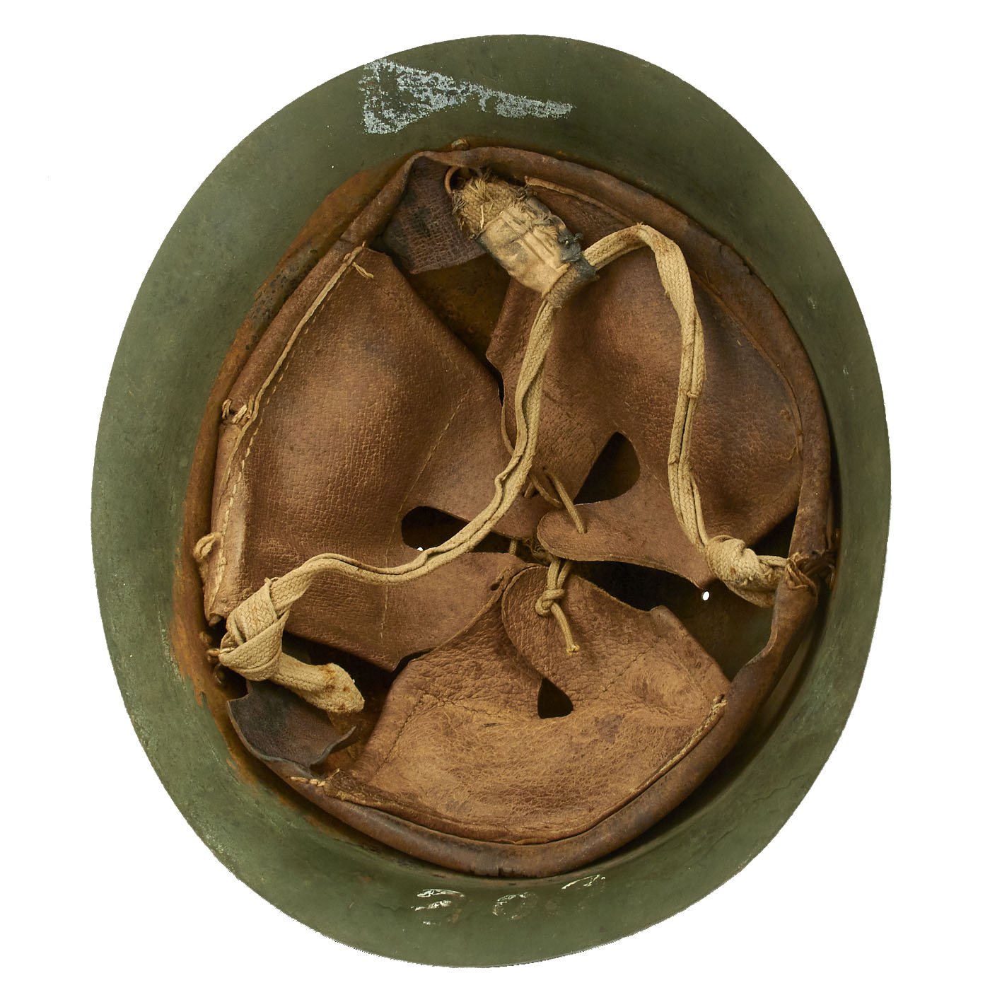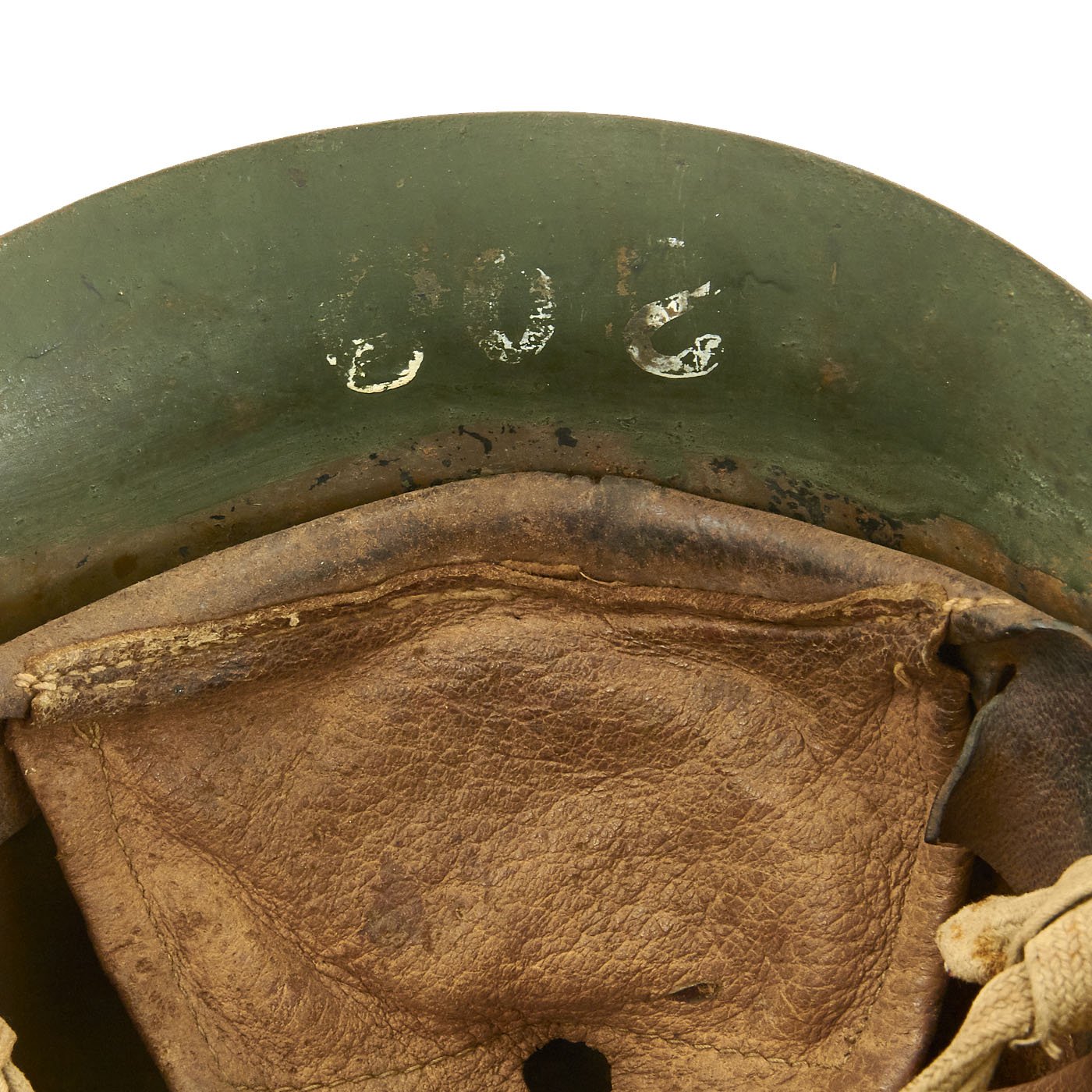 At some time during the WWII period, the exterior paint looks to have become quite degraded, just like the interior of the helmet under the liner. It was painted green to prevent further degradation and to increase the camouflage profile. We do not know if the liner is the original liner, or whether it was replaced when the helmet was repainted.