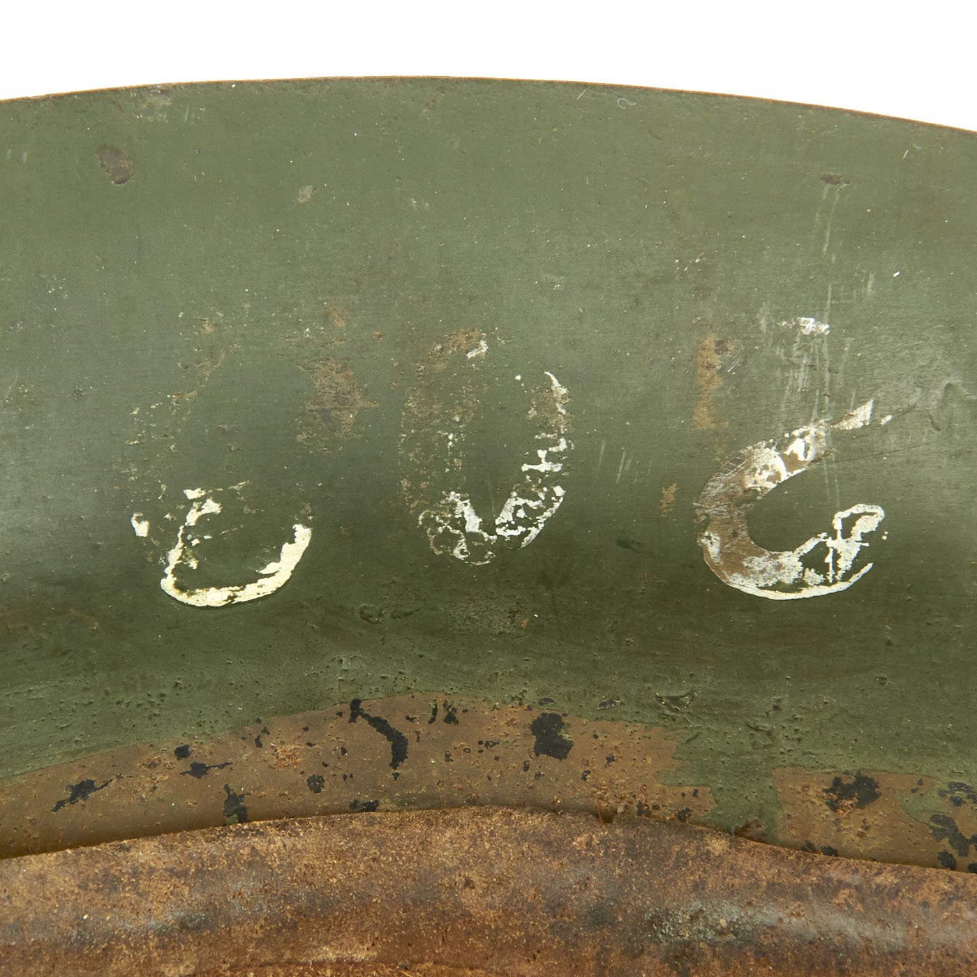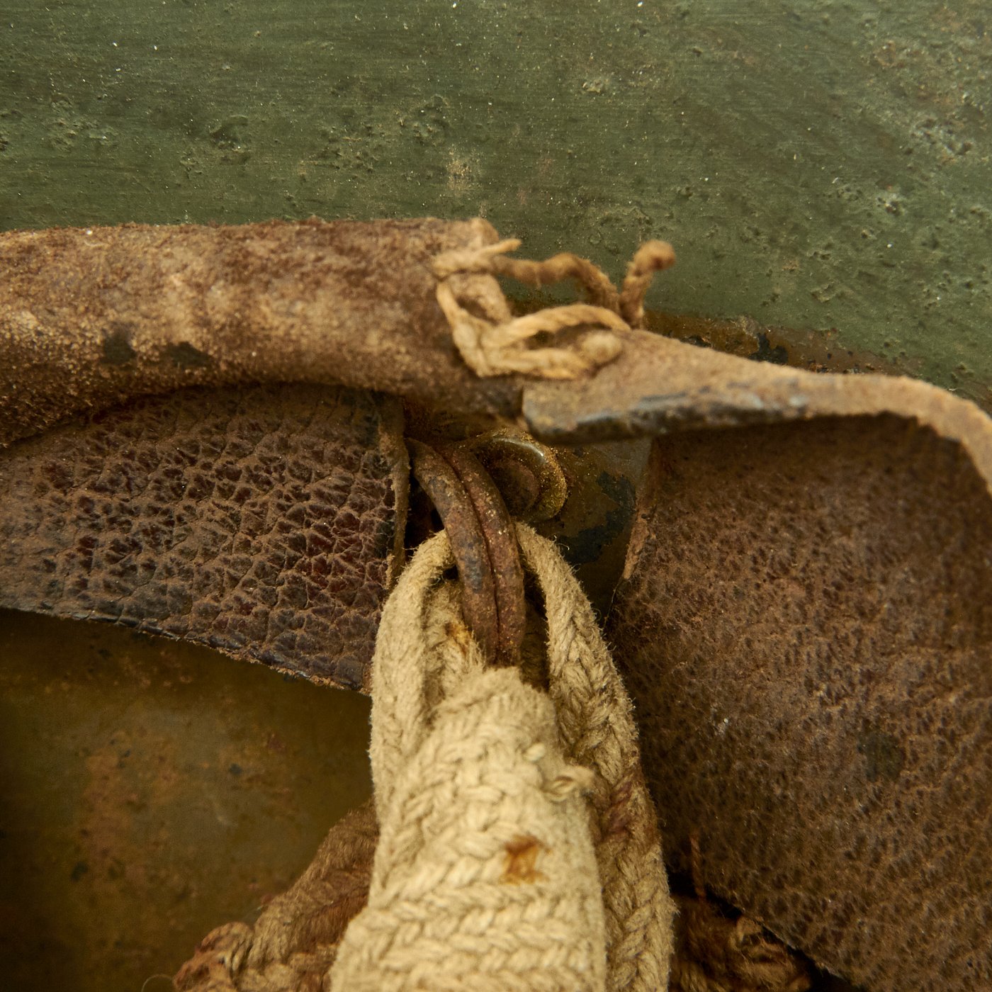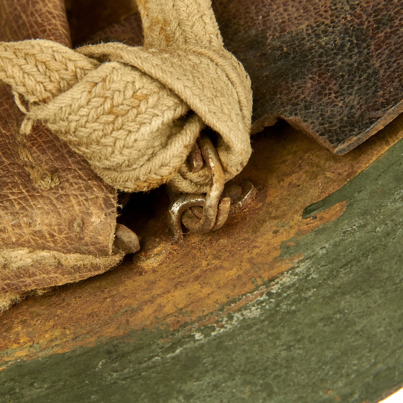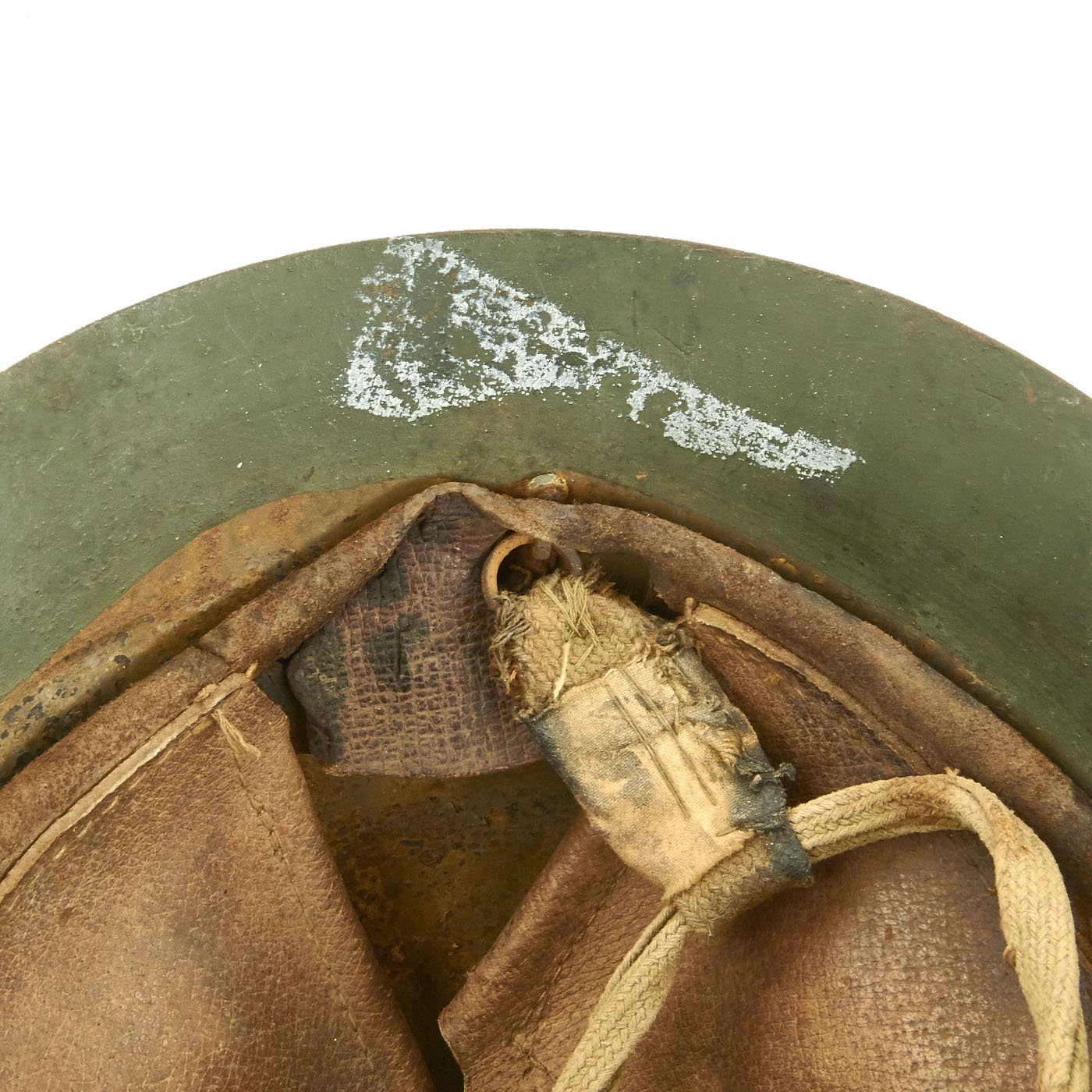 At some time during the WWII period, the exterior paint looks to have become quite degraded, just like the interior of the helmet under the liner. It was painted green to prevent further degradation and to increase the camouflage profile. We do not know if the liner is the original liner, or whether it was replaced when the helmet was repainted.