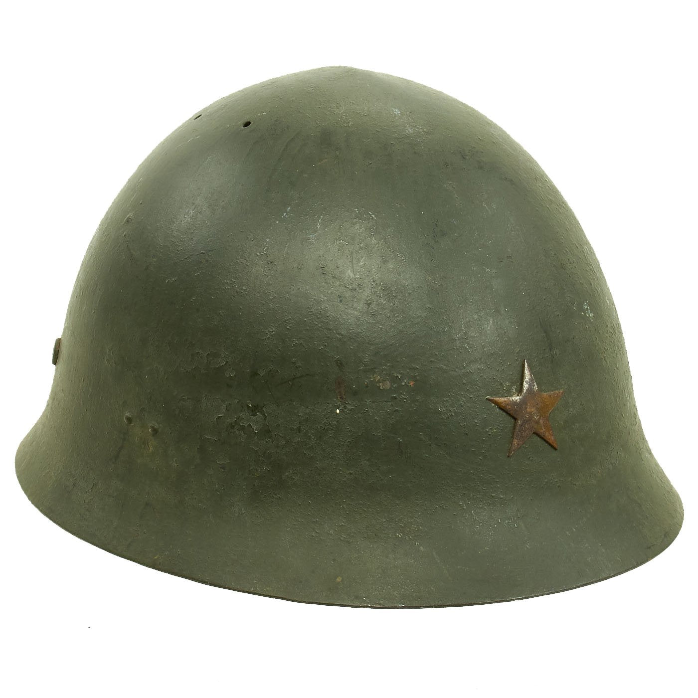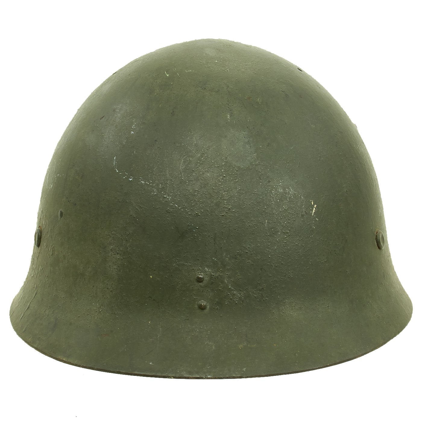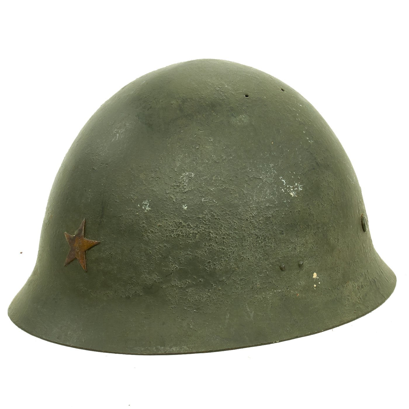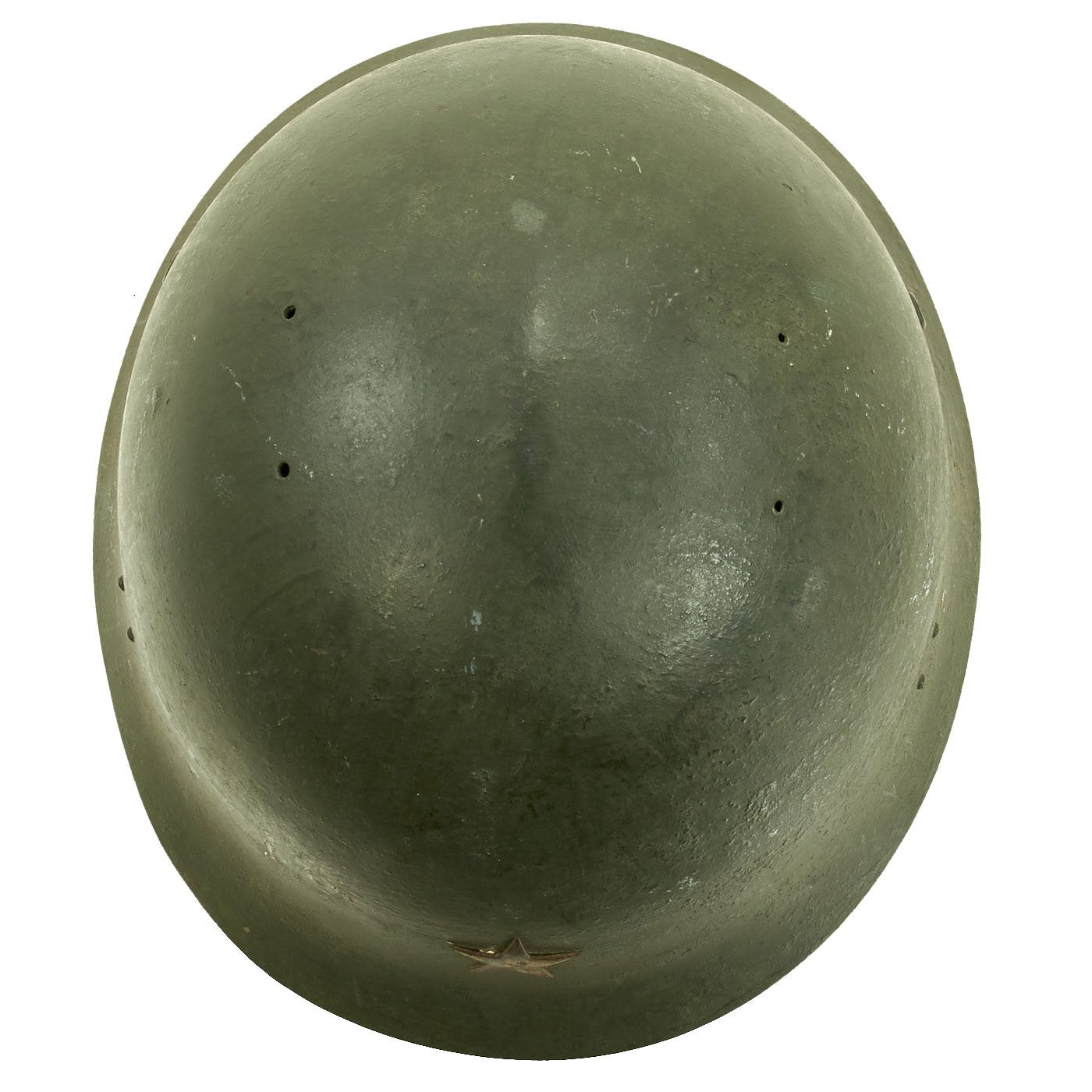 At some time during the WWII period, the exterior paint looks to have become quite degraded, just like the interior of the helmet under the liner. It was painted green to prevent further degradation and to increase the camouflage profile. We do not know if the liner is the original liner, or whether it was replaced when the helmet was repainted.