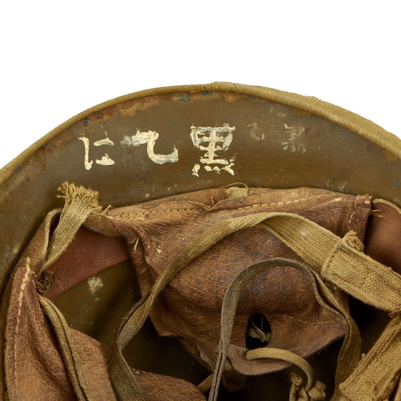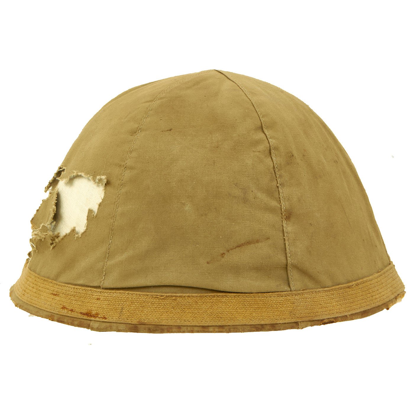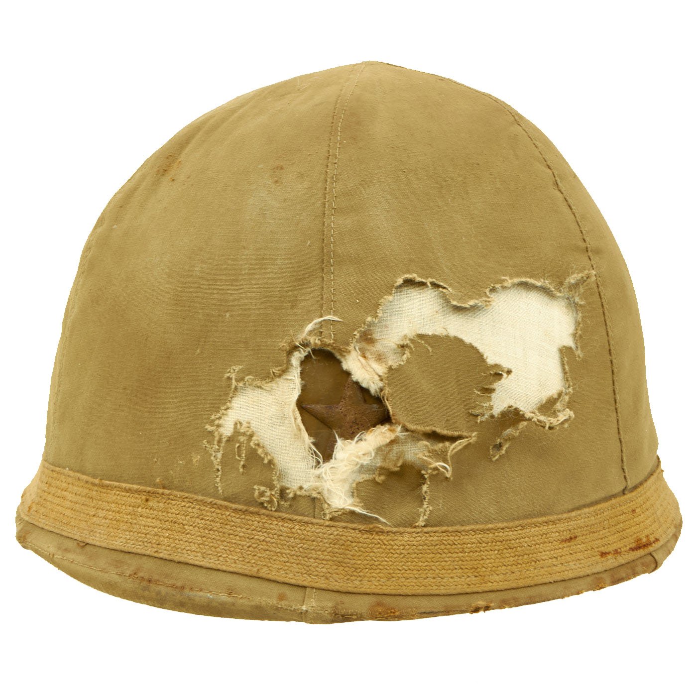 Original Item: Only One Available. This is a very nice combat used example of the classic Type 92 Tetsubo (鉄帽 - "steel cap"), also colloquially called the tetsukabuto ( 鉄 冑 "steel helmet") by troops. This example definitely shows evidence of service, with damage to the padded cover, which we did not remove to avoid further damage. We assume that the paint is in good shape underneath, as we can see from the hole in front over the star.