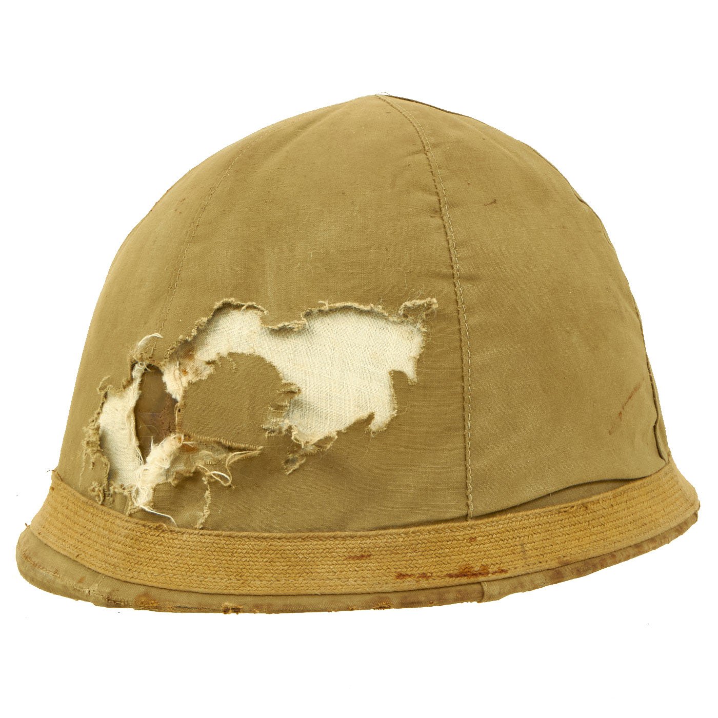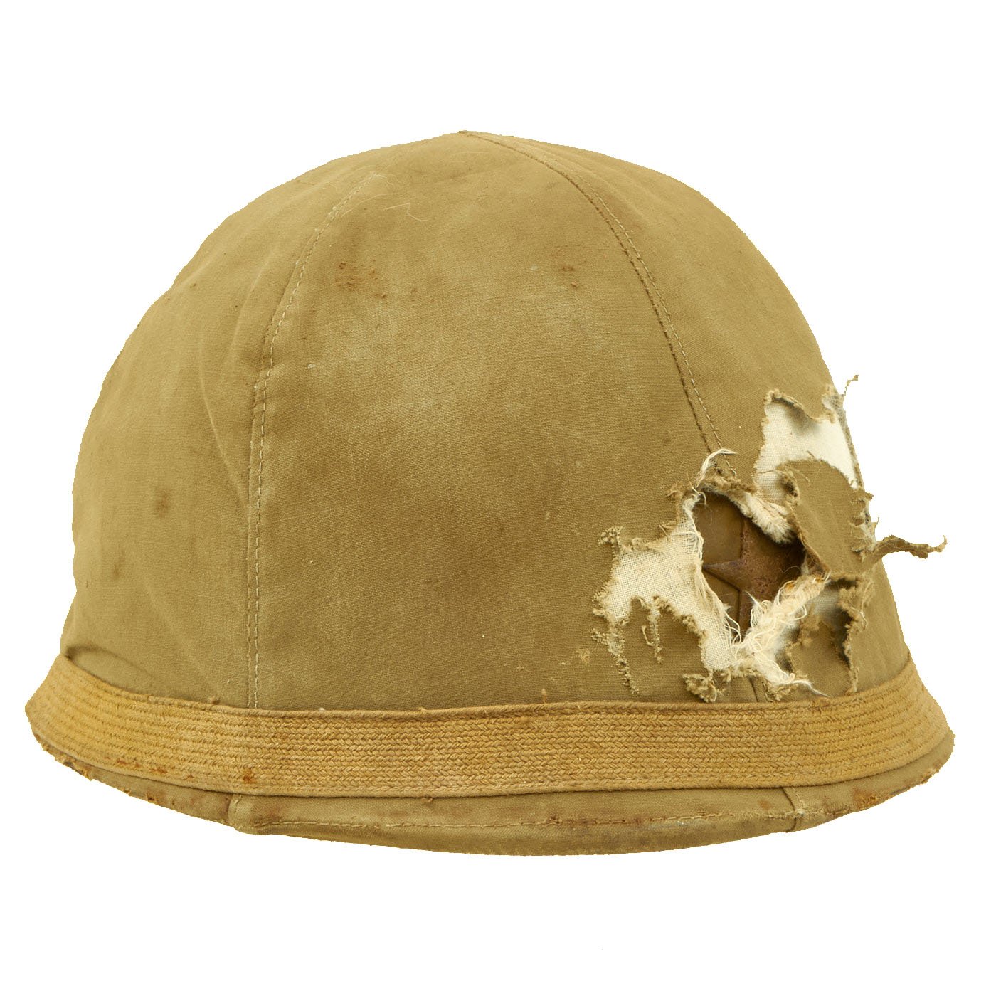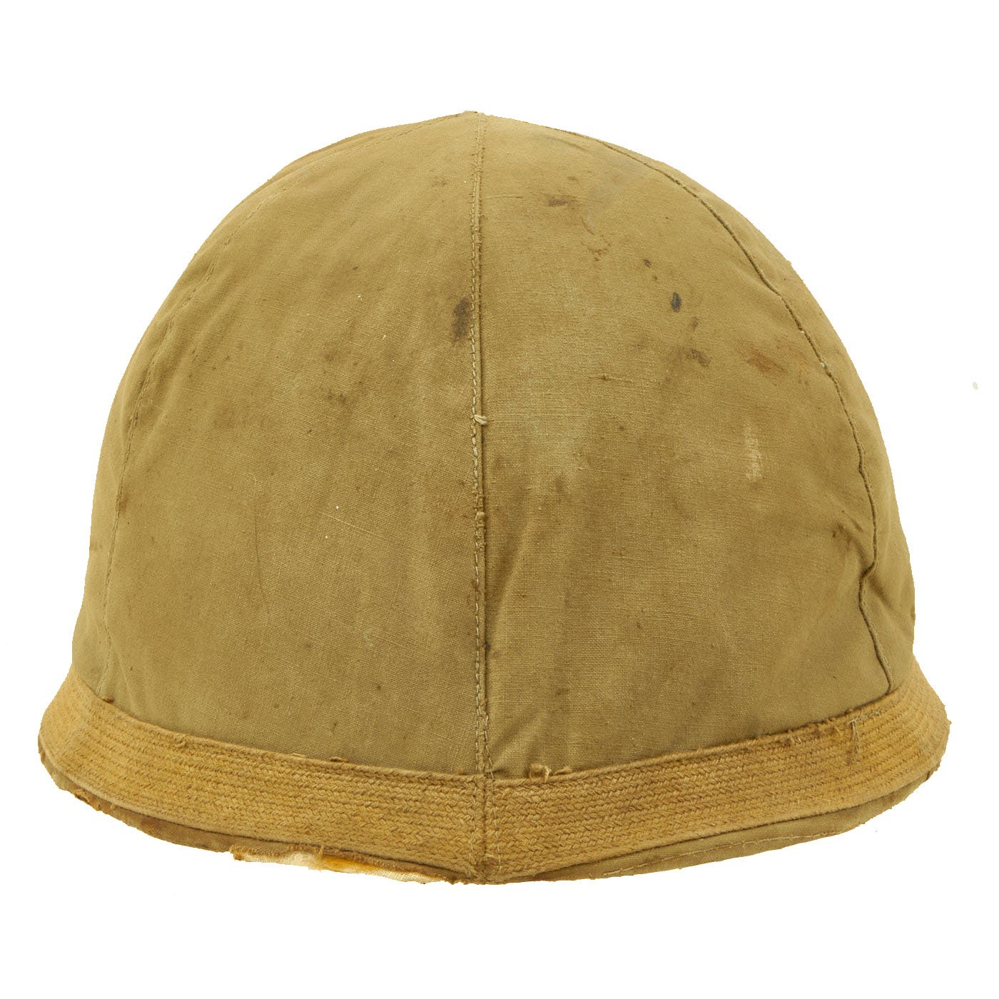 - Original tan padded machine sewn cover, in the correct color with six panel construction. It does have a hole in the front, which is torn through enough to see the metal star on the front of the helmet.