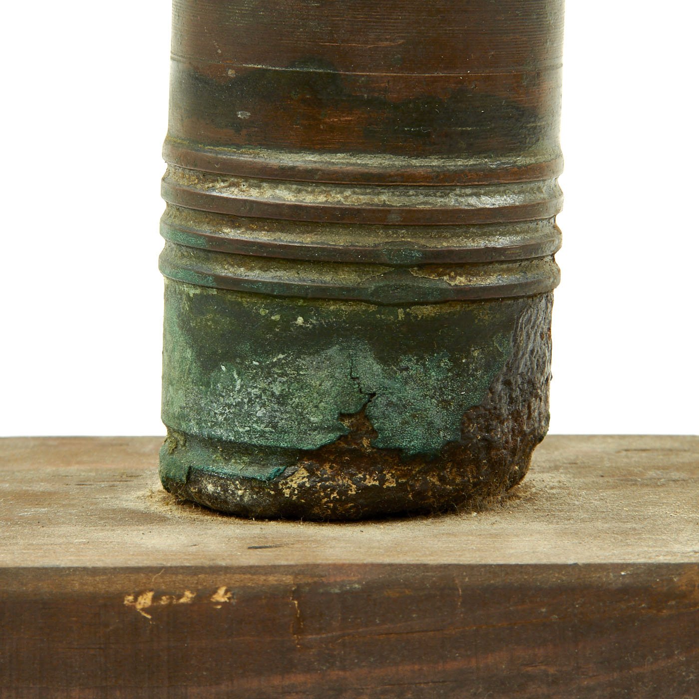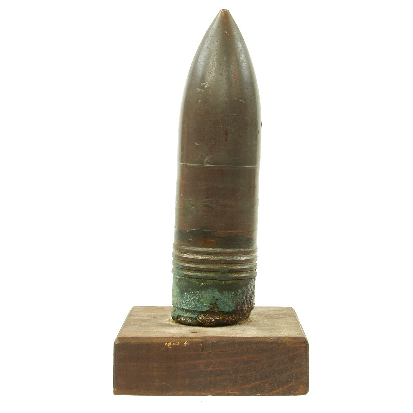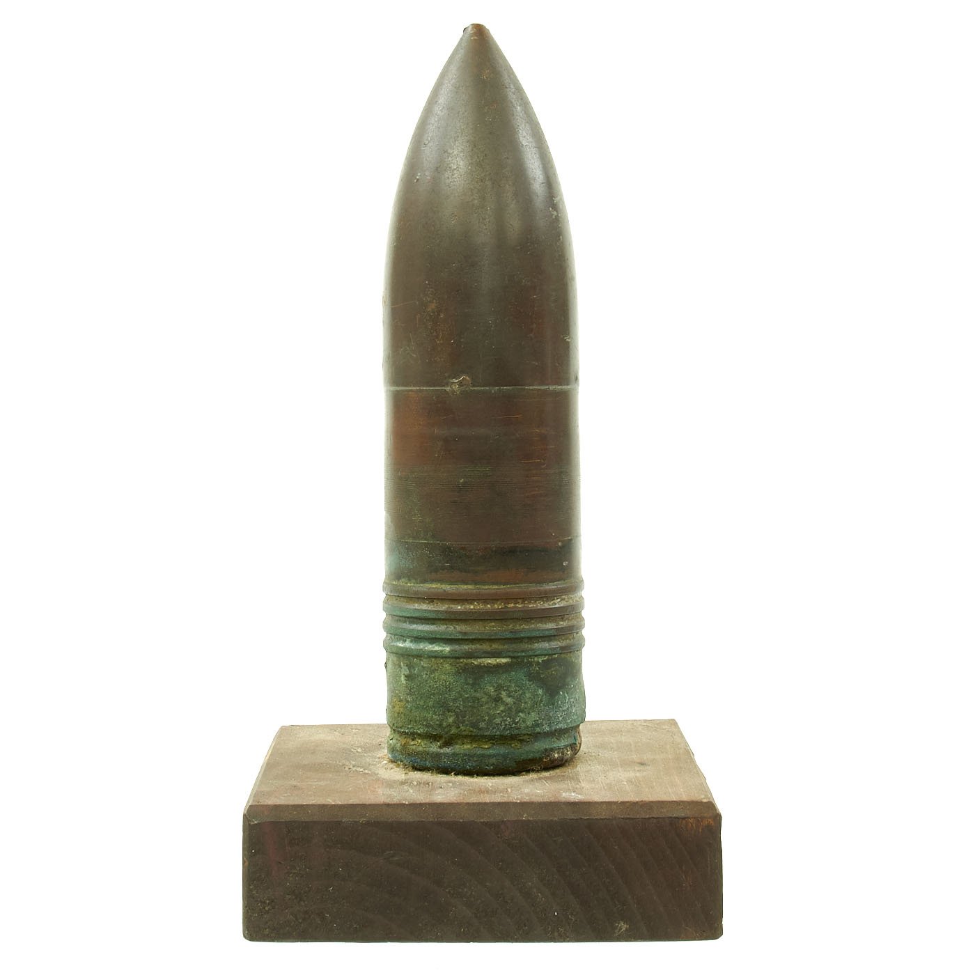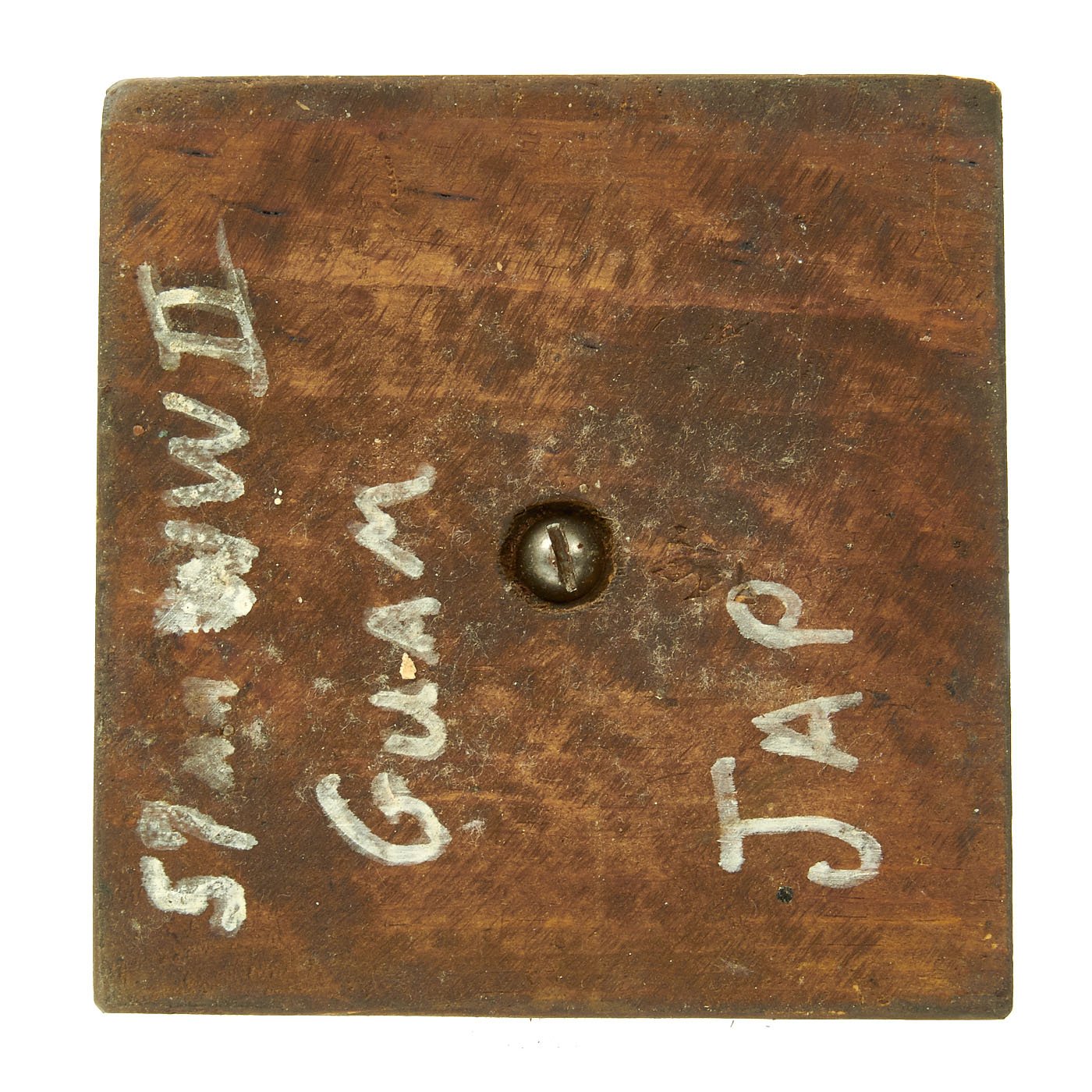This 57mm projectile is in very good condition and is mounted on a wood block underneath which is painted in white 57mm WWII GUAM JAP. This is a classic trophy of war brought back by an American soldier as a remembrance of his service during World War Two in the Pacific Theater of Operations.