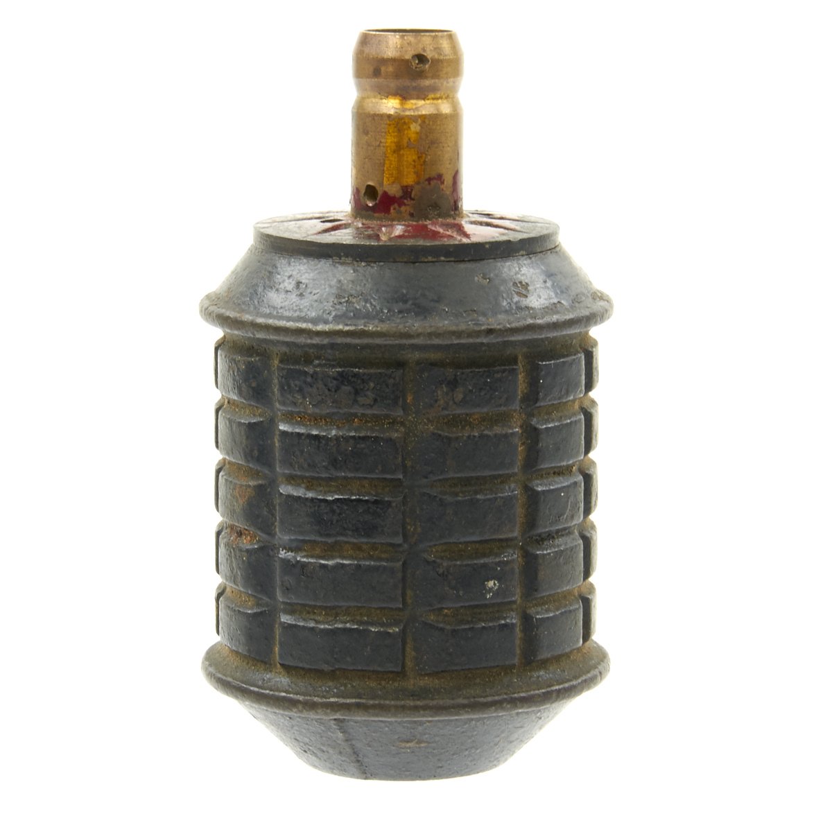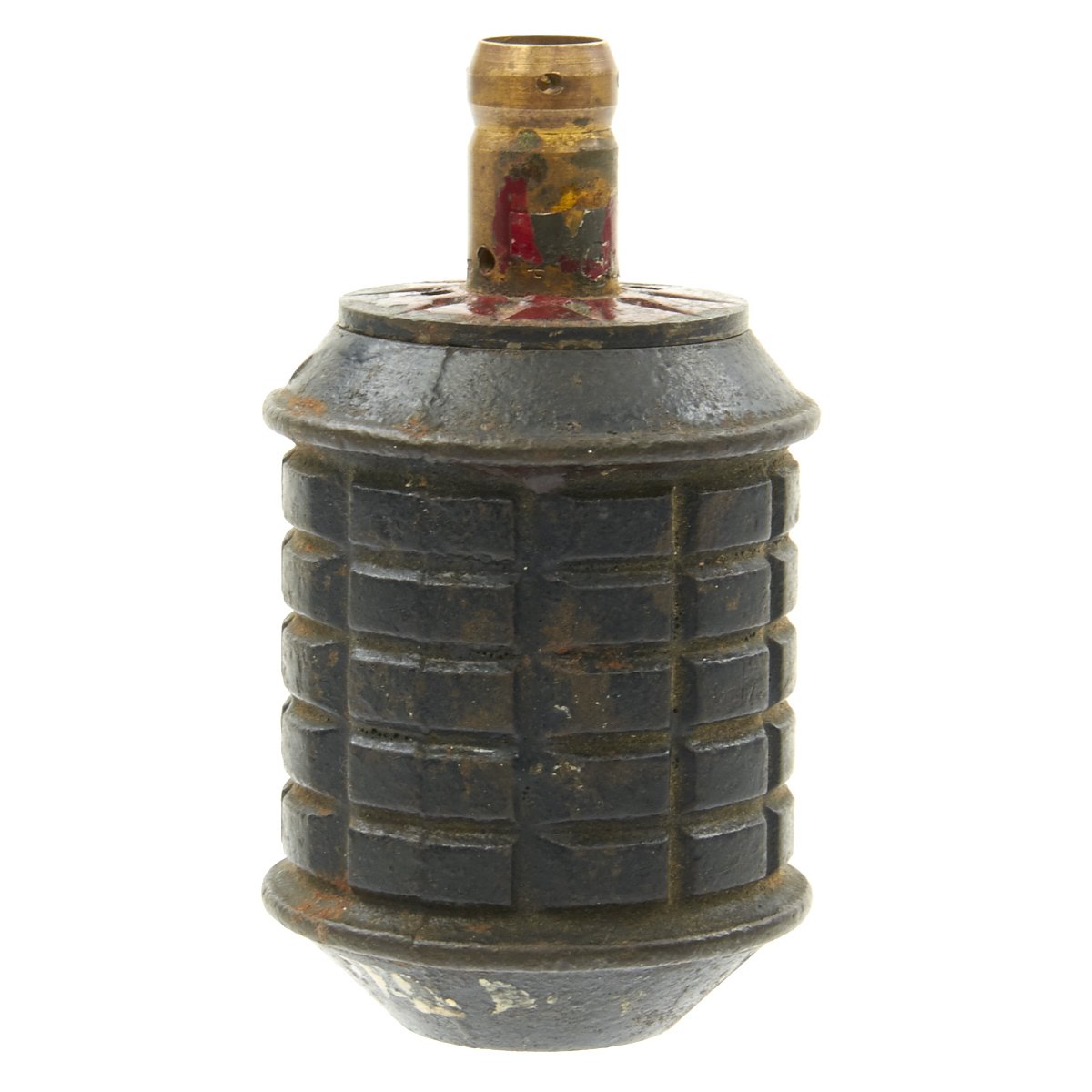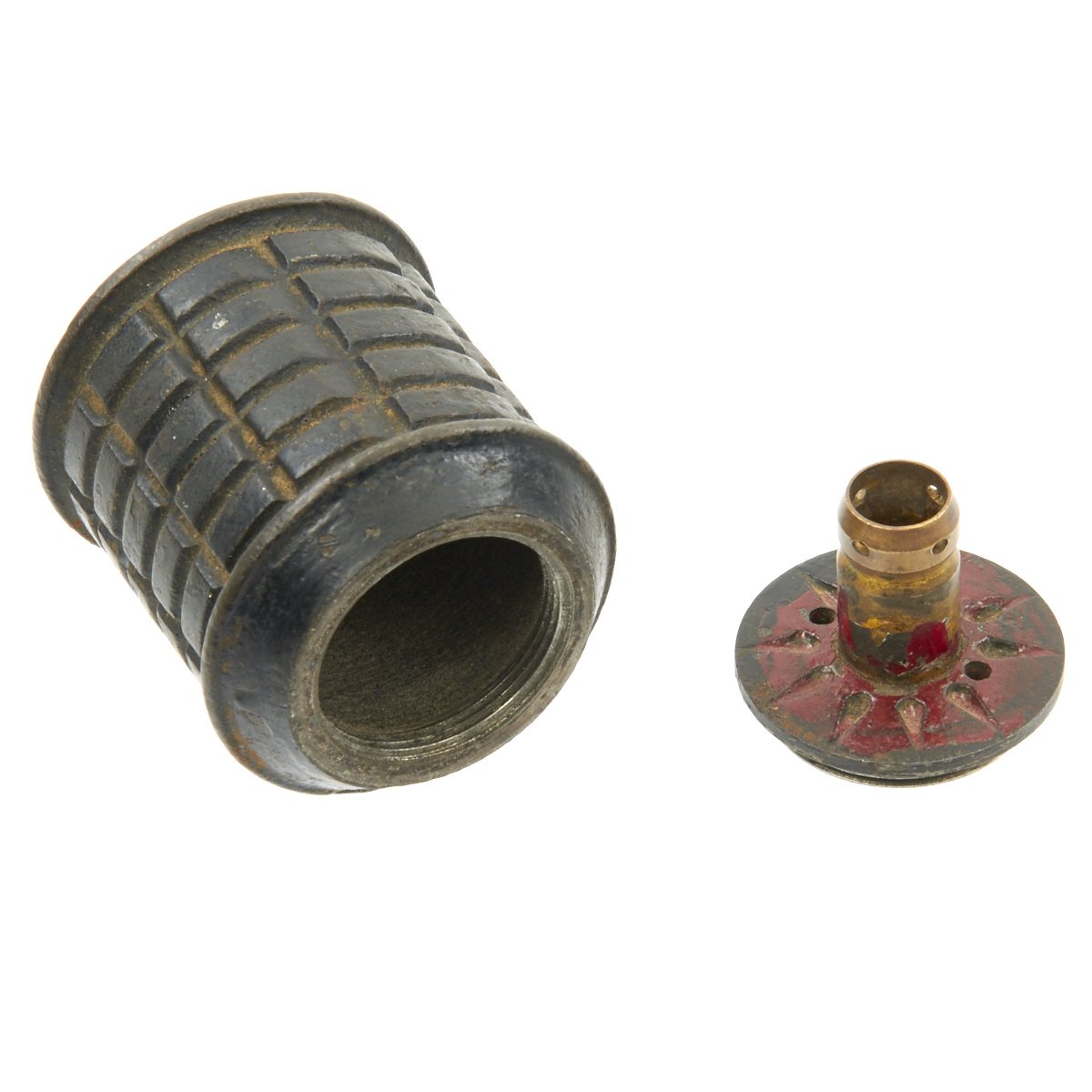 Original Item: Only One Available. This is an excellent inert demilitarized genuine Japanese Type 97 Hand Grenade. This example is offered in excellent condition complete with the fuse still attached to the screw off top. The cap, pin, and string are unfortunately missing. It still retains a lot of the original black paint. The Type 97 Hand Grenade was the standard fragmentation hand grenade of the Imperial Japanese Army and Imperial Japanese Navy SNLF during the Second Sino-Japanese War and World War II.