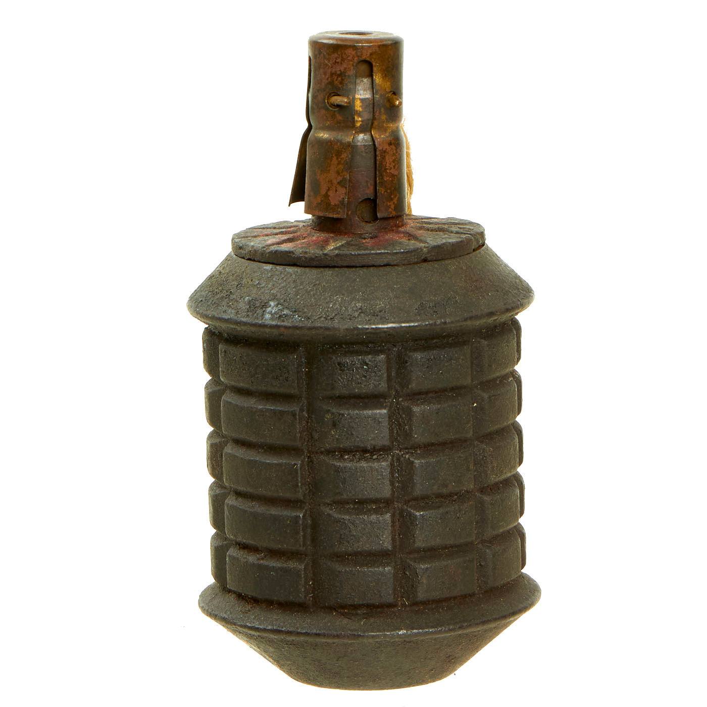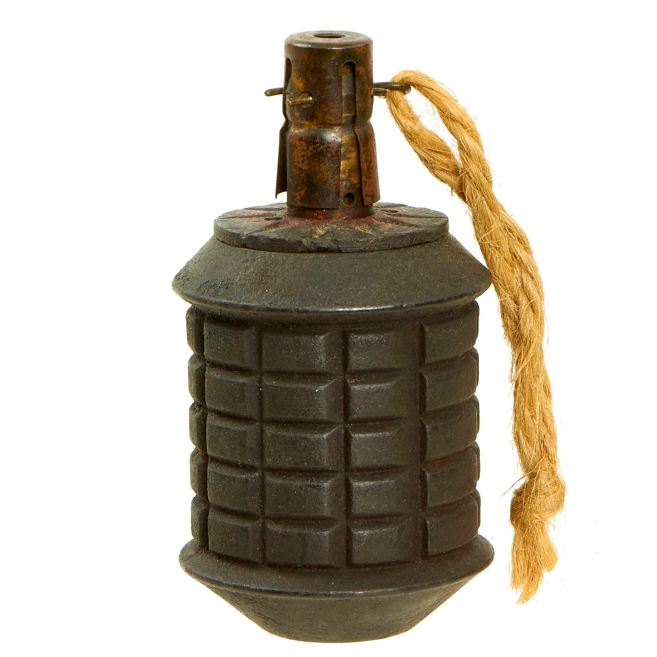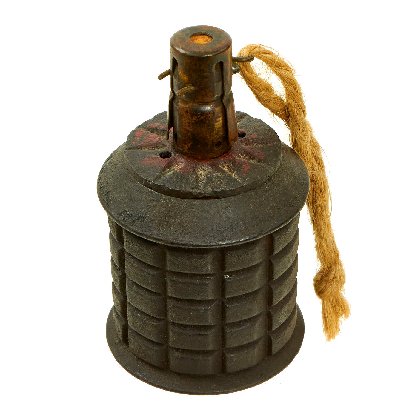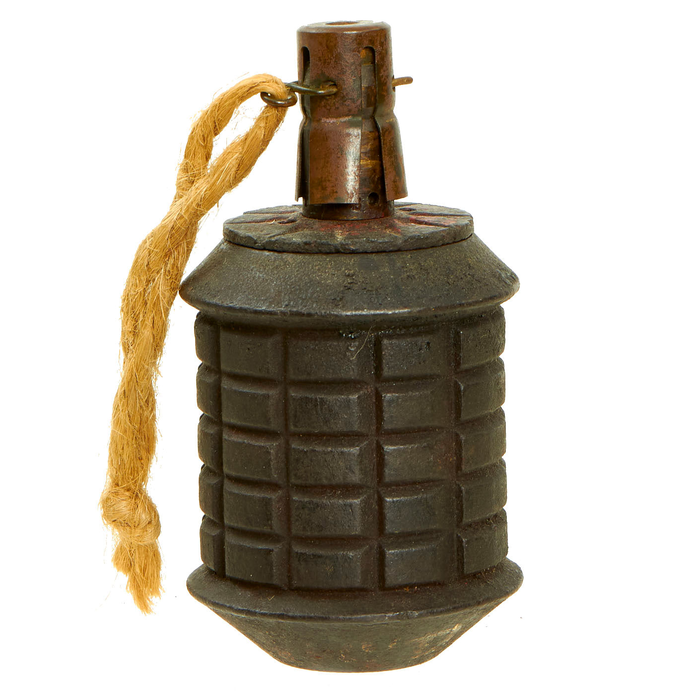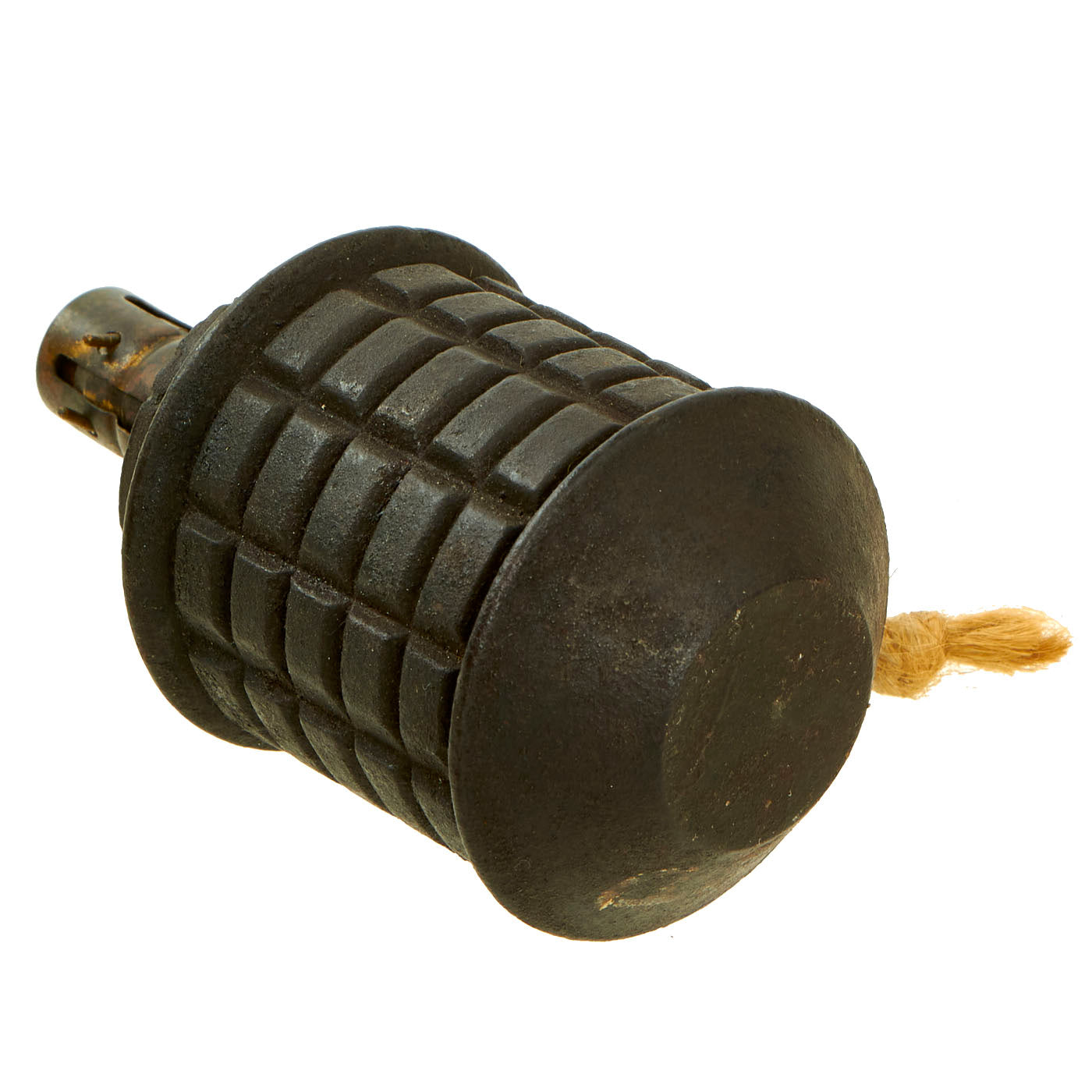 Original Item: Only One Available. This is a very nice inert demilitarized genuine Japanese Type 97 Hand Grenade. This example is offered in very good condition, still has a fuse top and cap, but no detonator tube. This is still attached to the screw off top, which can be removed to inspect the interior.