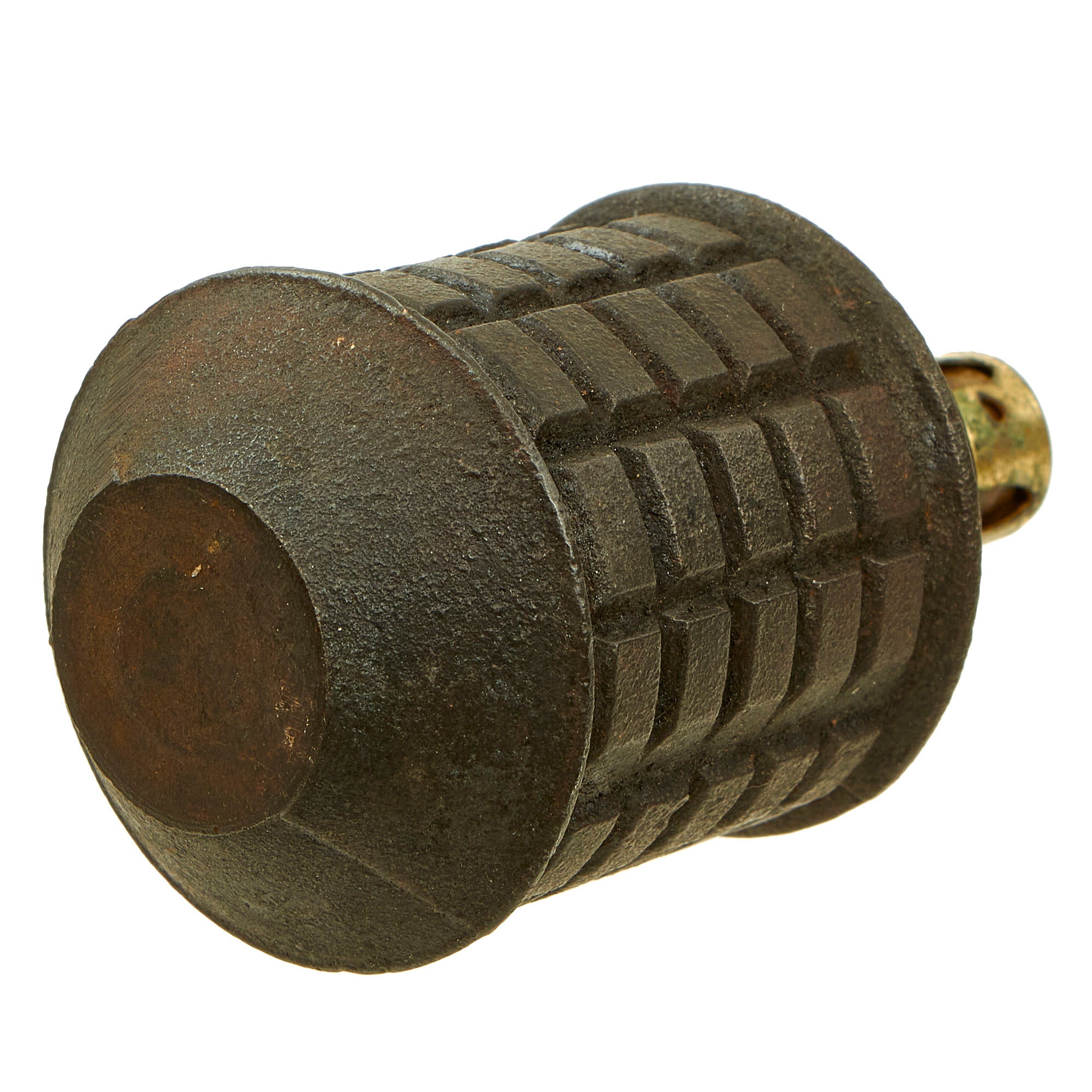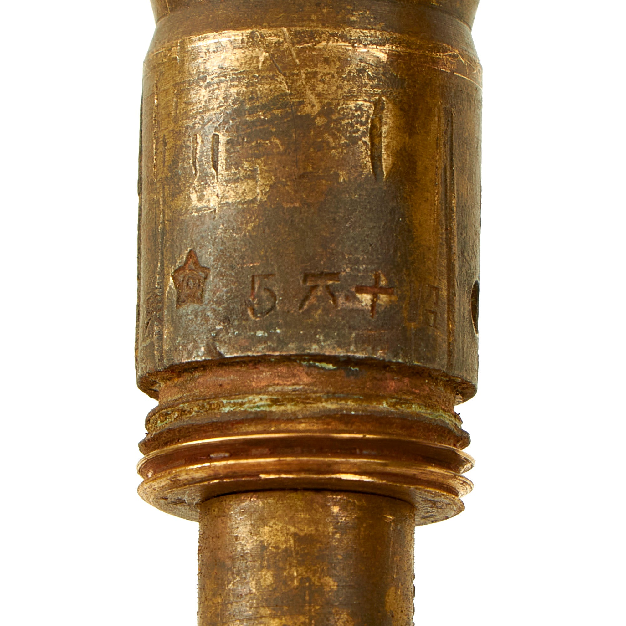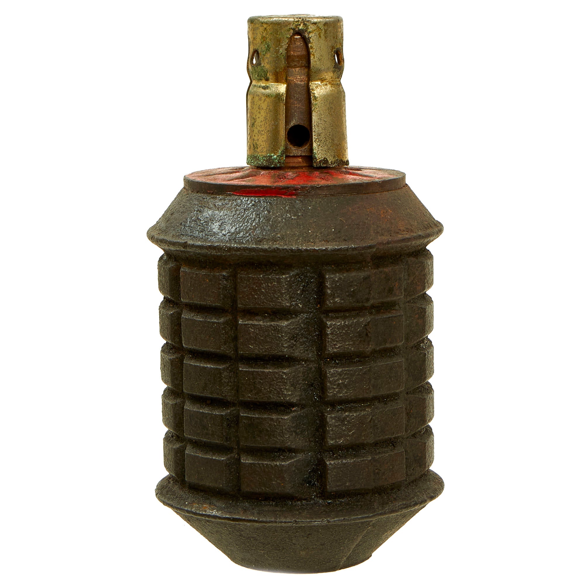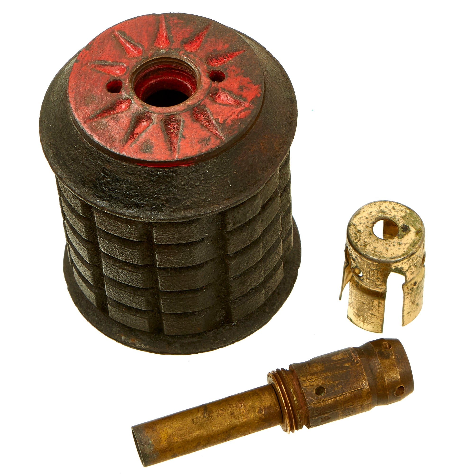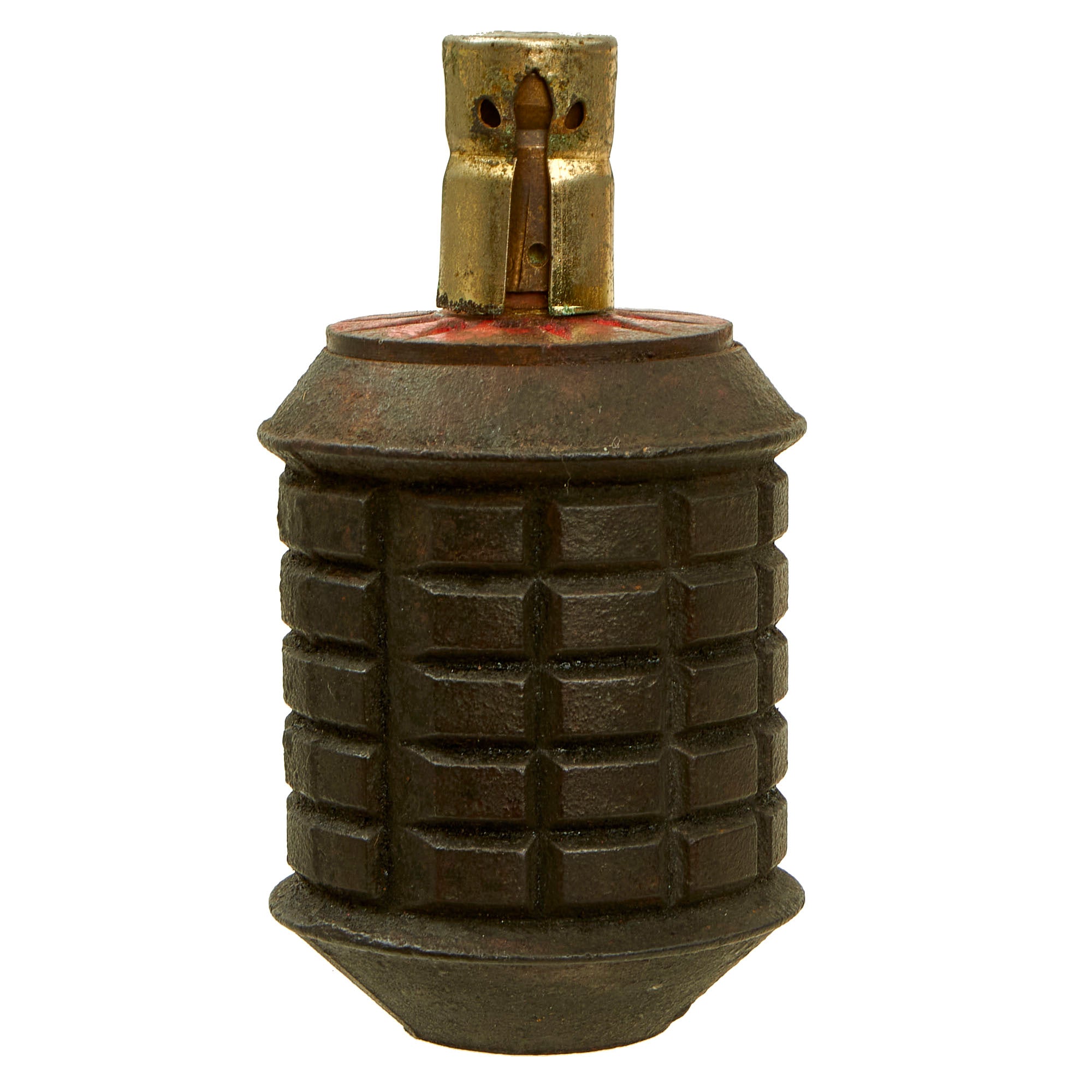 The grenade body still retains most of the original black paint, with the top still showing some of the original red paint. The fuse on this example is actually marked with a Japanese date: 5 六 十 昭. This marking is written right to left, and would be read: SHOWA (current reigning emperor) Juu-Roku (16th year of reign - 1941) 3rd month (March). The fuze still retains a cover, but is missing the pull pin with string.