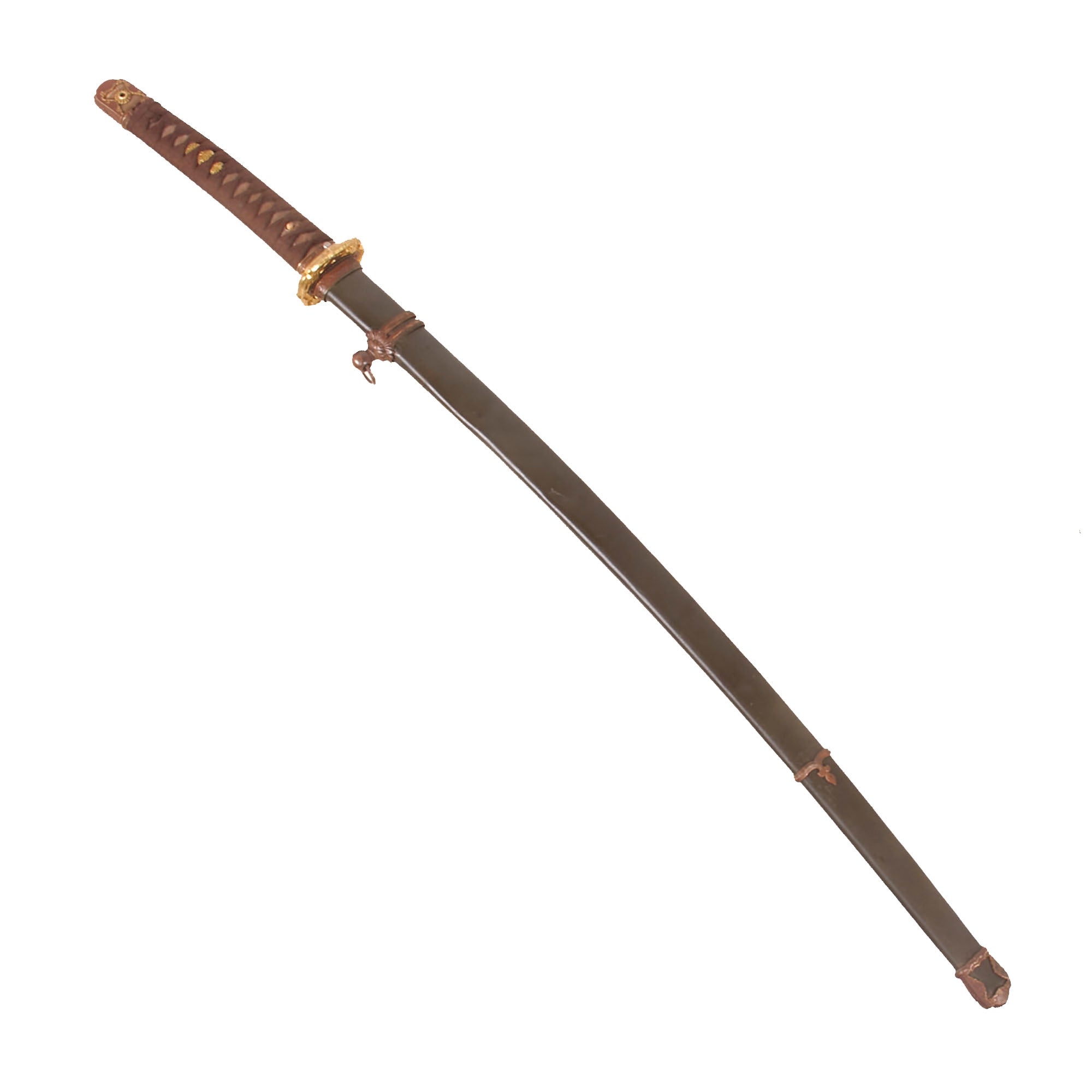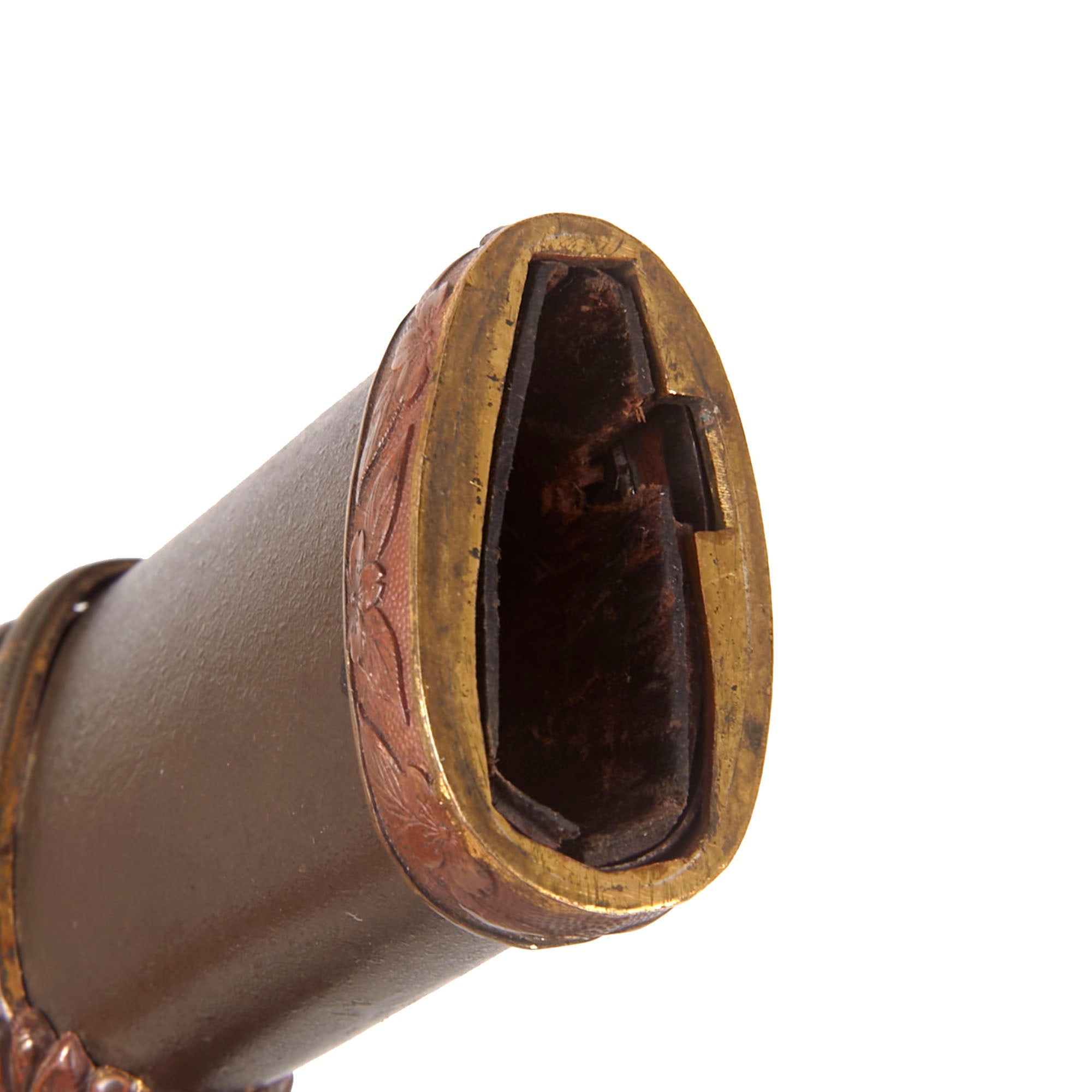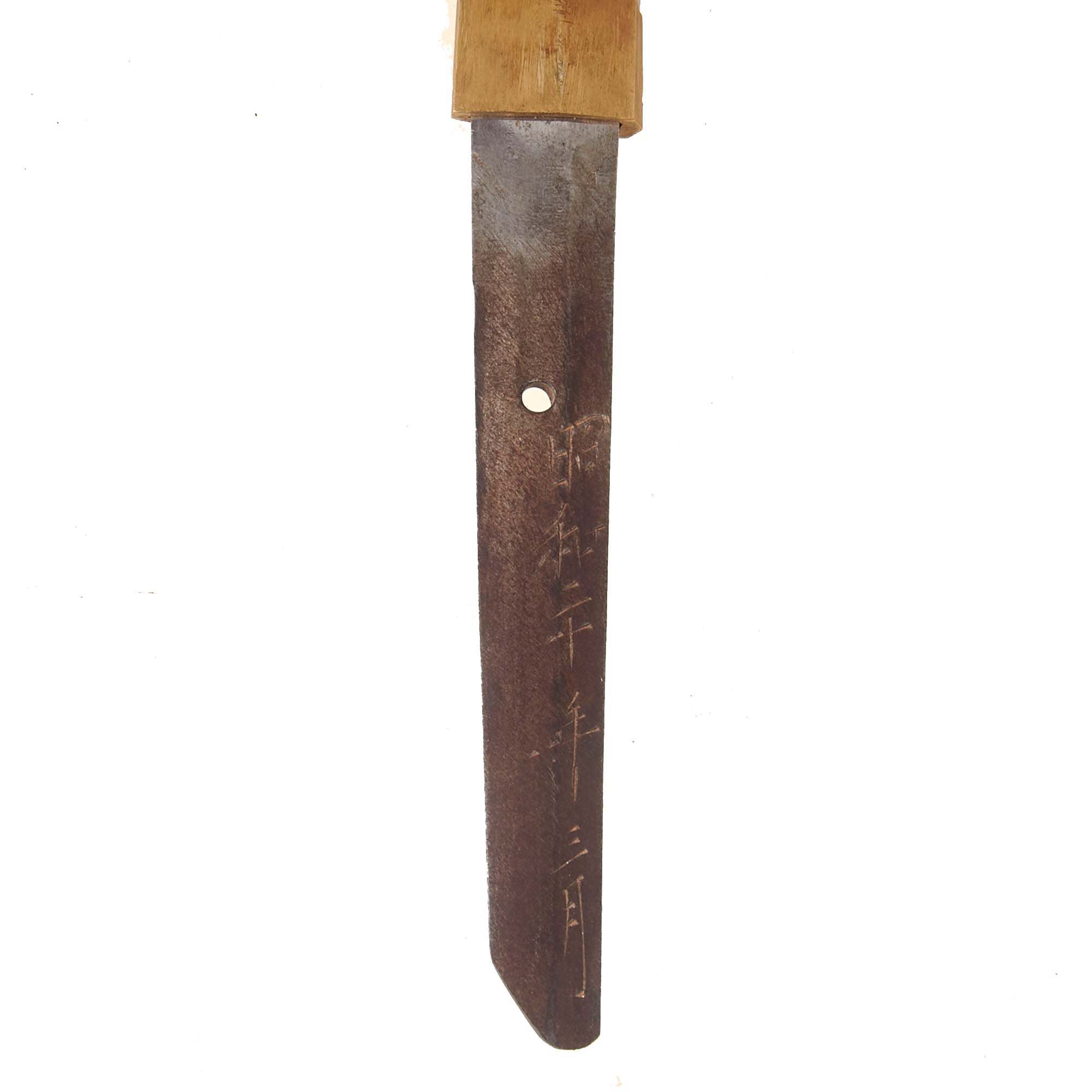 The Scabbard (SAYA) is steel over wood, and in very good condition, with most of the original textured olive brown paint intact. It does however have dents on both sides, so it looks to have seen some real use in the field. These do not interfere with sheathing the blade. The brass hardware still retains some of the original brown finish and gilding, but only on the SAYAJIRI scabbard tip and KOIGUCHI throat, which is missing one of the two securing screws. The scabbard has the correct single hanger loop of the Type 98 style. The top fitting is inlet for the scabbard lock on the hilt, which as mentioned previously is broken.