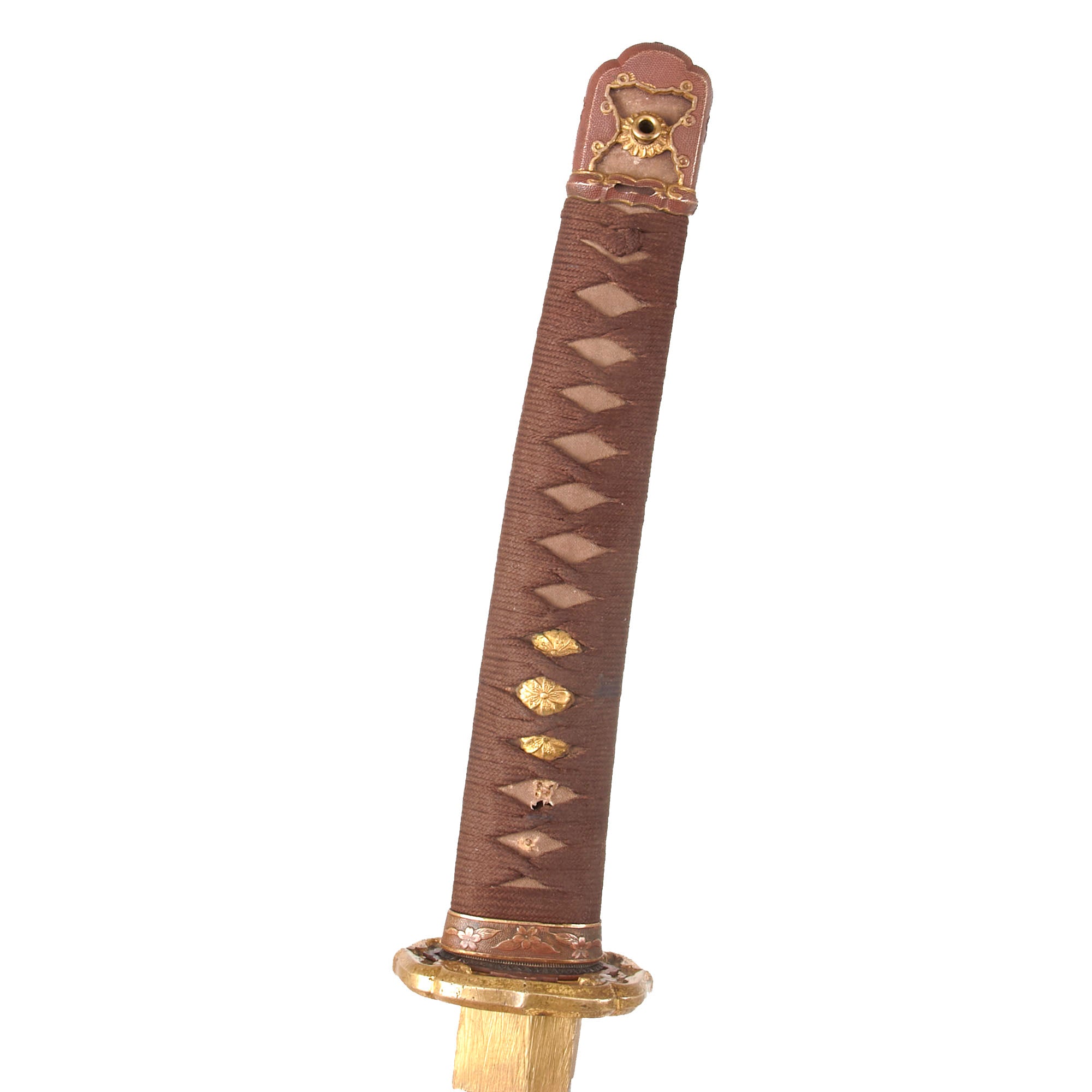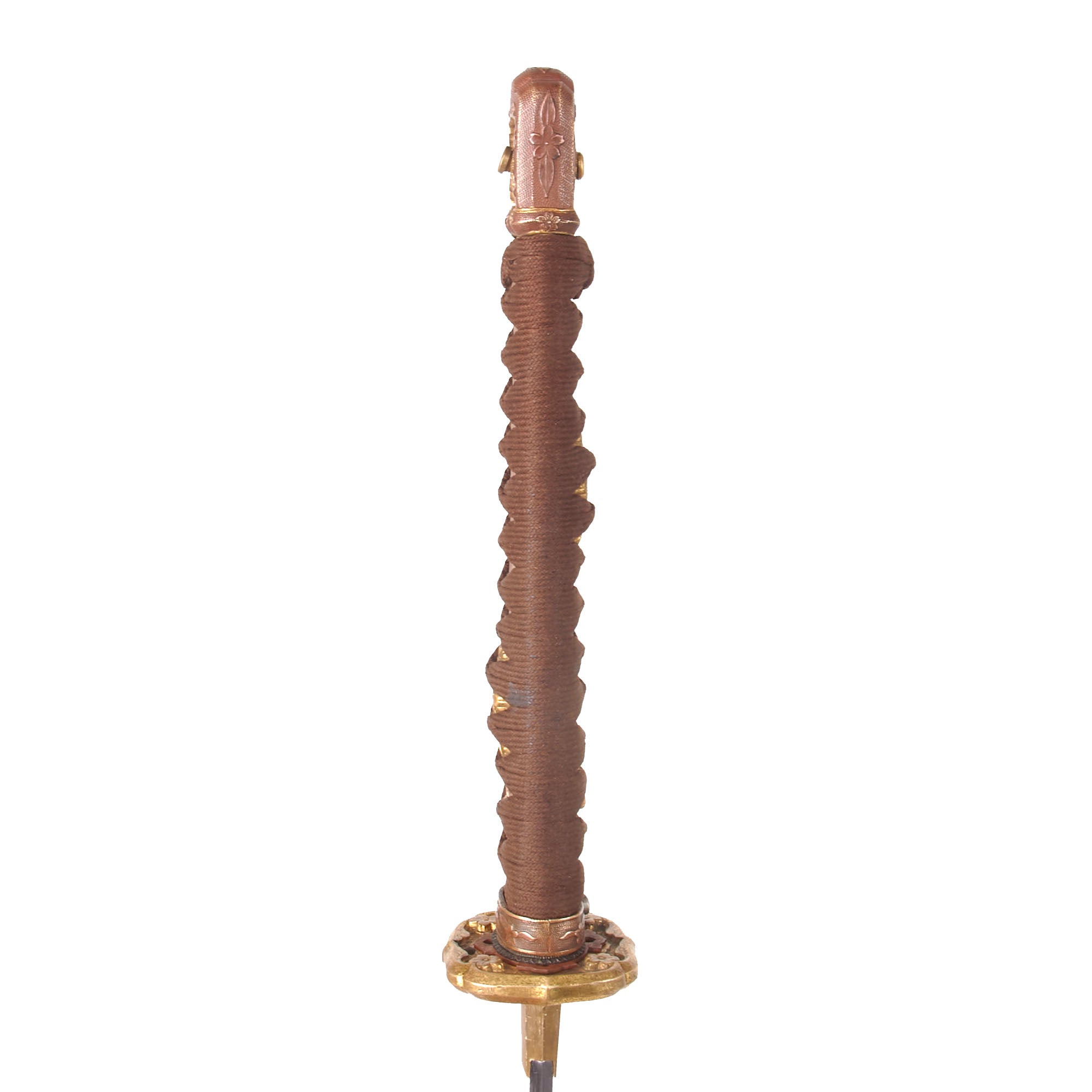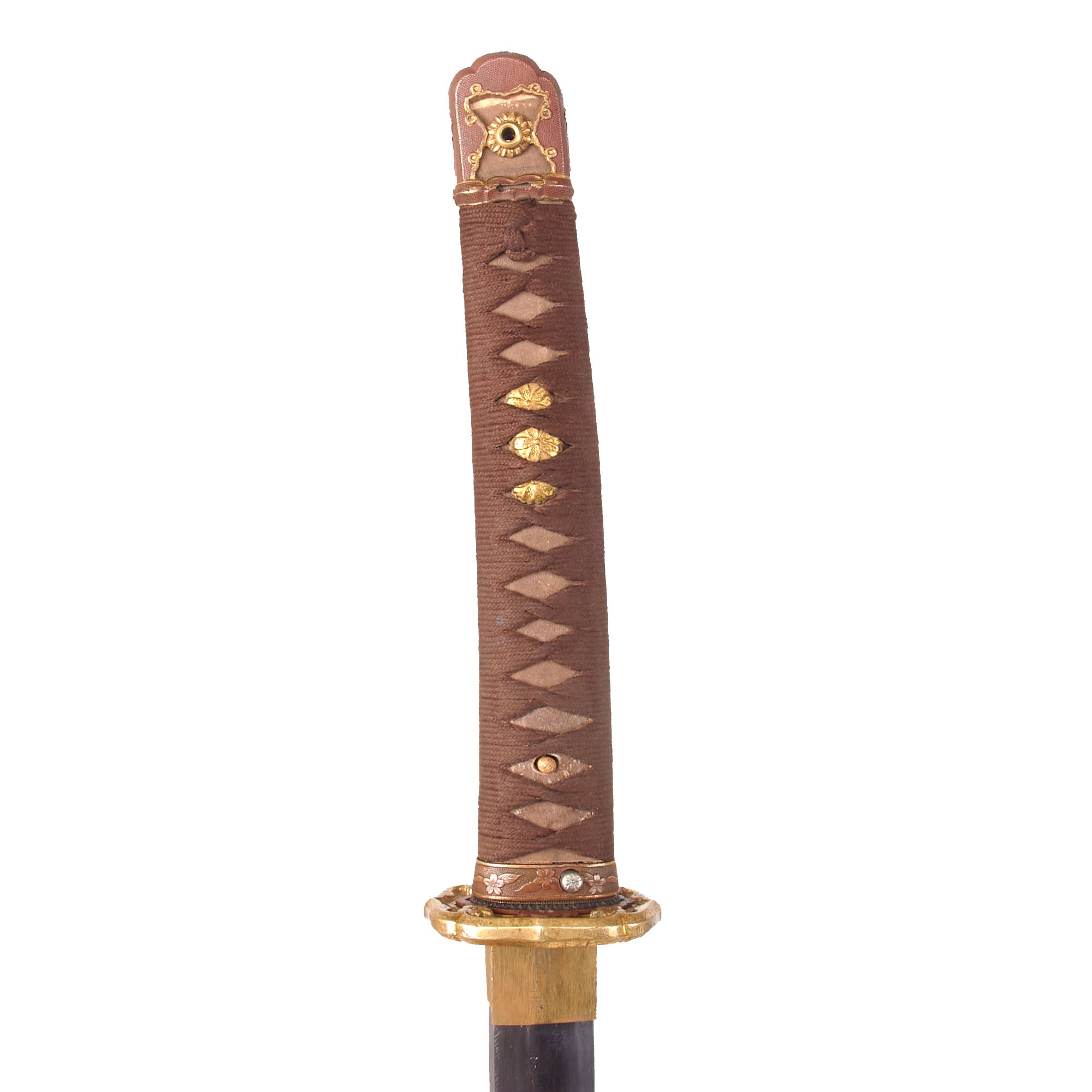 The handle (tsuka) has an very nice grip, which in this case is light brown sharkskin, not the usual synthetic ray skin (Sa-Me). This is mostly intact, and has the, and has a complete brown Ito (cloth binding), which shows very light staining from use in the field. There is a single wooden securing peg (mekugi) still present, which looks to be post war replacement. There is no loop on the end of the tsuka, so it was probably removed long ago.