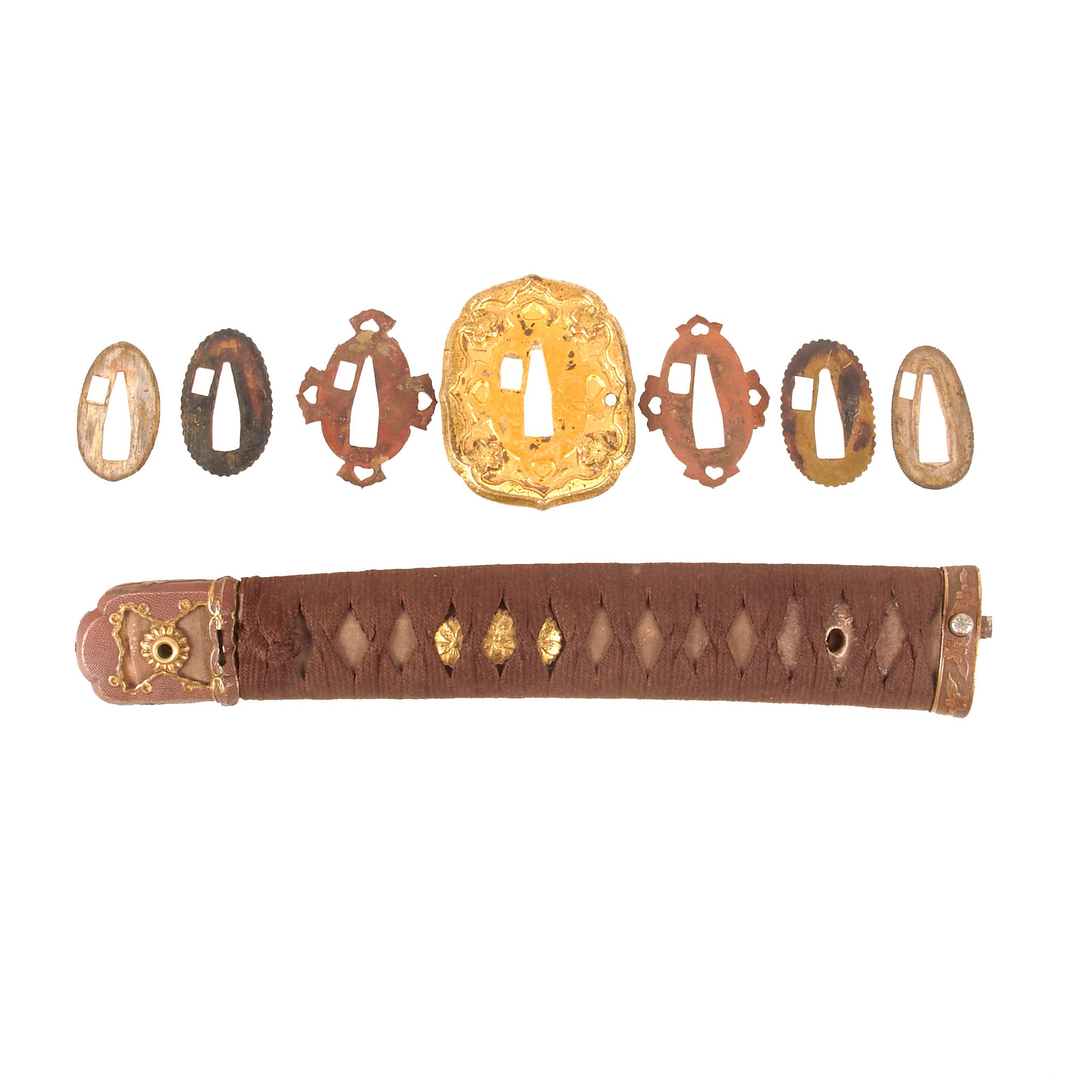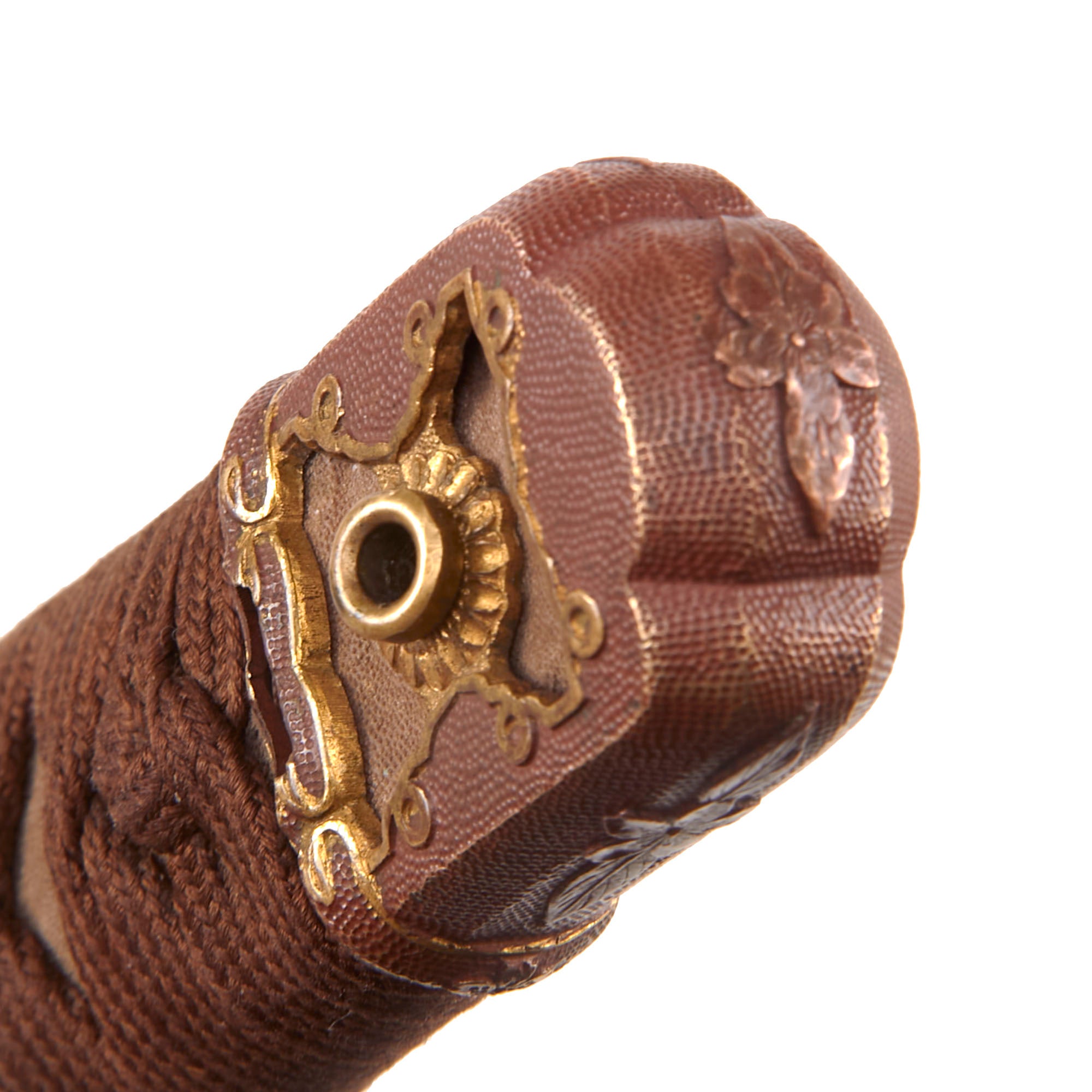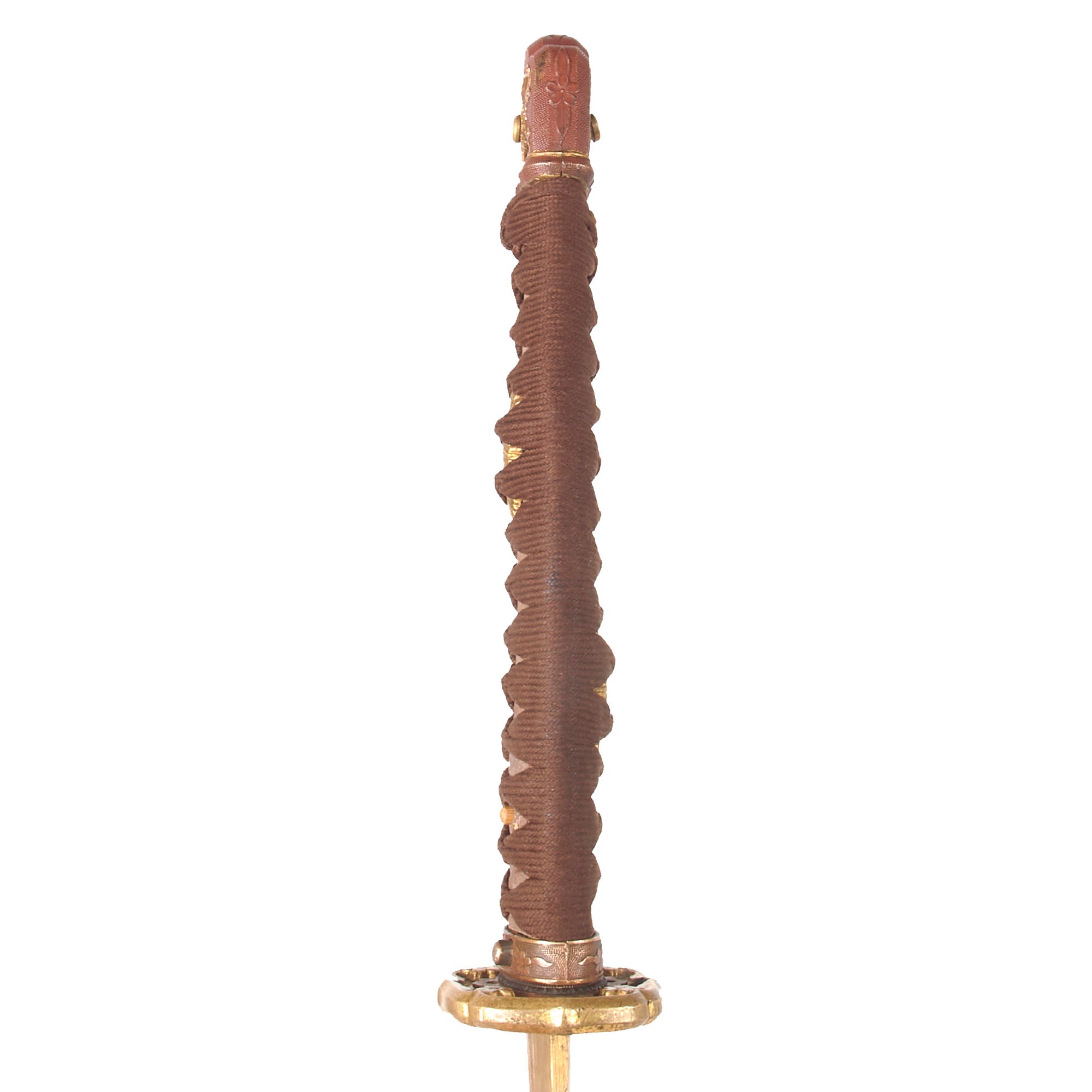 The handle (tsuka) has an very nice grip, which in this case is light brown sharkskin, not the usual synthetic ray skin (Sa-Me). This is mostly intact, and has the, and has a complete brown Ito (cloth binding), which shows very light staining from use in the field. There is a single wooden securing peg (mekugi) still present, which looks to be post war replacement. There is no loop on the end of the tsuka, so it was probably removed long ago.