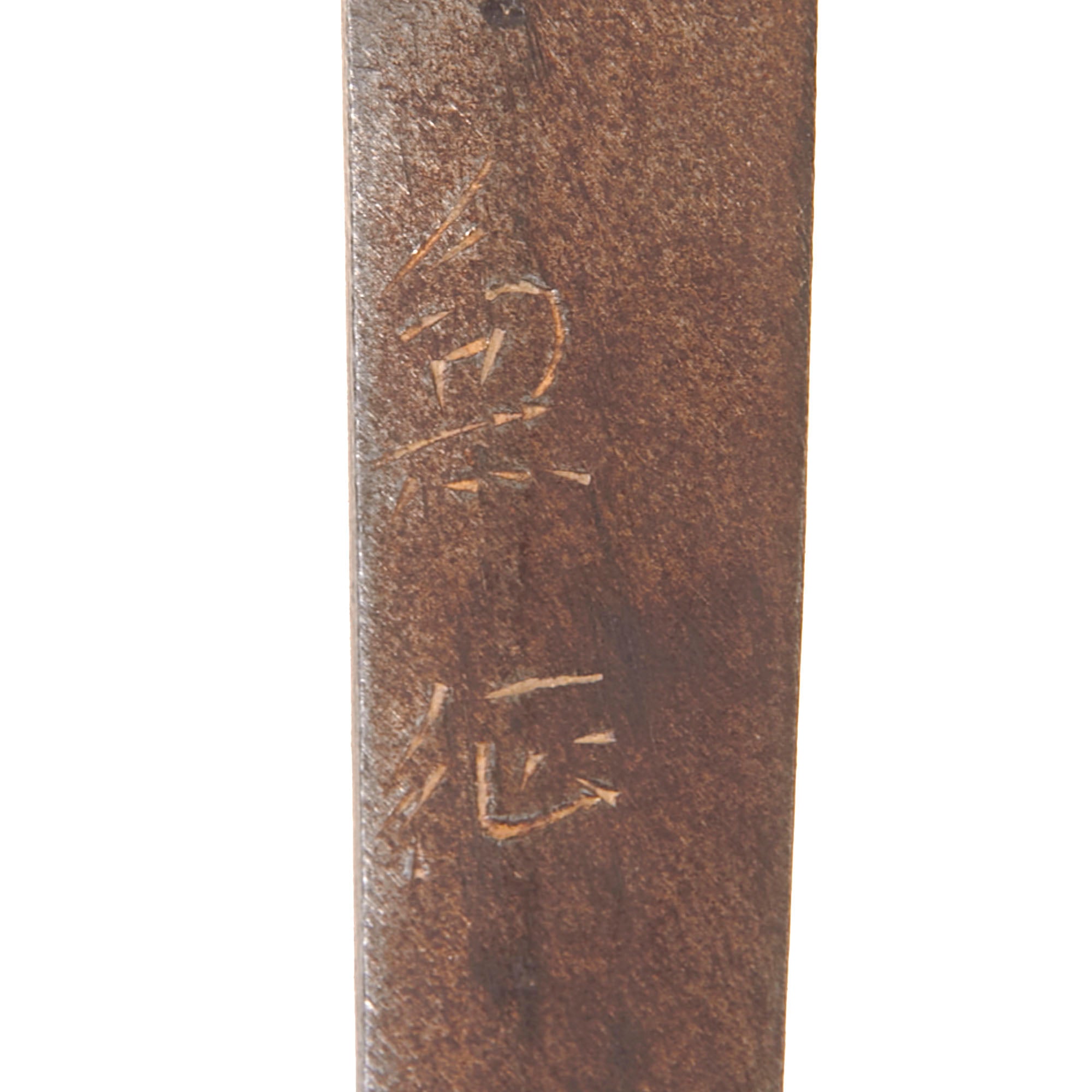 The blade on this example looks to have been arsenal forged, and the tang of the blade is signed (Mei) with the characters 兼 征, which is read as KANEYUKI. There is very little information out there on this maker, which looks to only have made late war blades such as this. They were active during the Showa Period and worked at Seki arsenal in Gifu, Mino Province (美濃国), who stamped the blade with a civil inspection proof 岐 (Gifu) inside a cherry blossom. The other side of the tang bears the date when the blade was produced, in the standard long form indicating years into the current emperor's reign: 昭 和 二 十 年 三 月. This would be read: SHOWA (current reigning emperor) Ni-Juu Nen (20th year of reign - 1945) San-Gatsu (3rd Month - March).