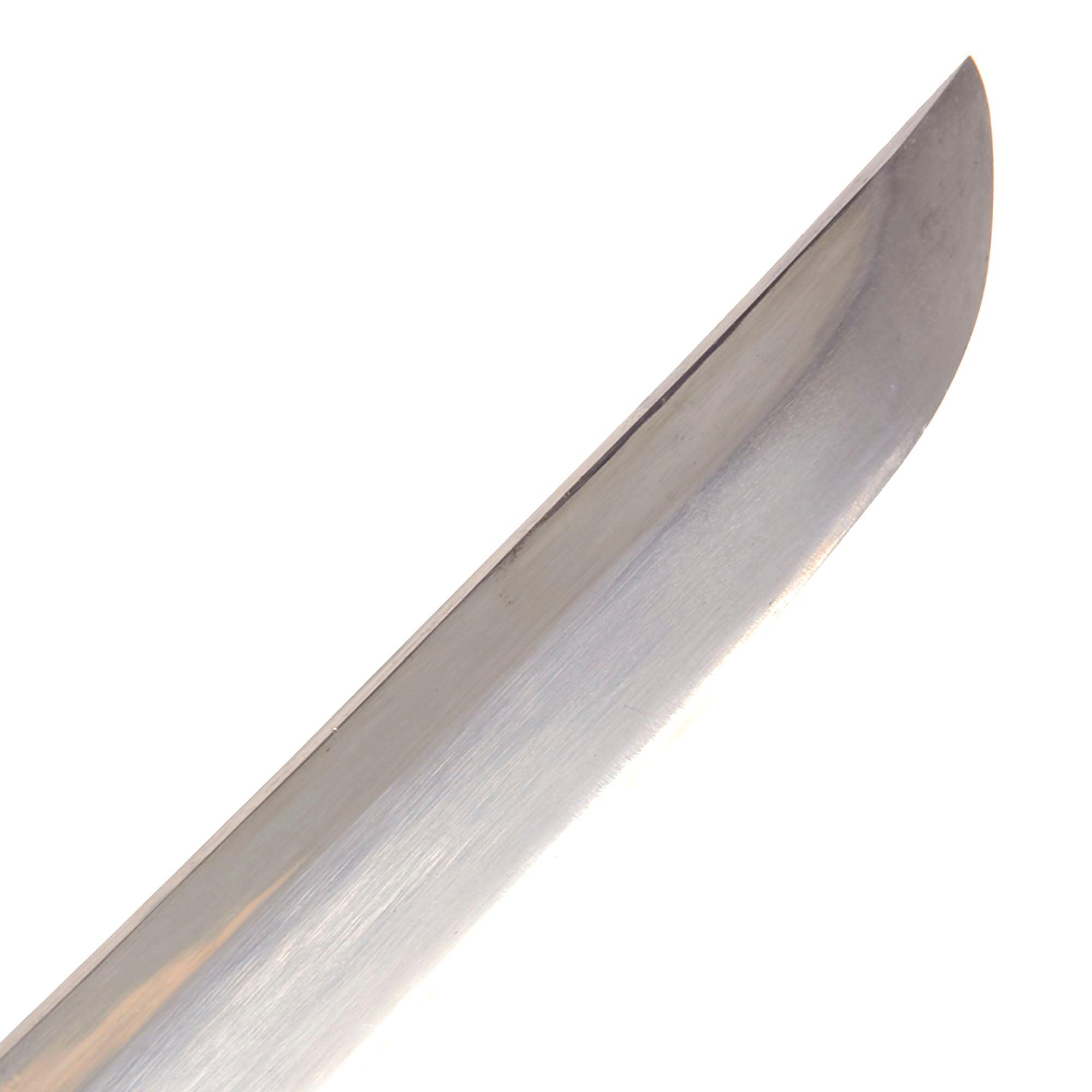 The blade has a proper kissaki (tip) with a faint but clear yokote (division between body and tip) and boshi (tip temper line) which is the Ō-MARU (大丸 - large round turnback) shape. The main edge Temper line (HAMON - 刃文) is faintly visible, and is a very attractive SUGUHA (直刃 -straight) shape, which is most likely from oil tempering. This is standard for arsenal forged blades.