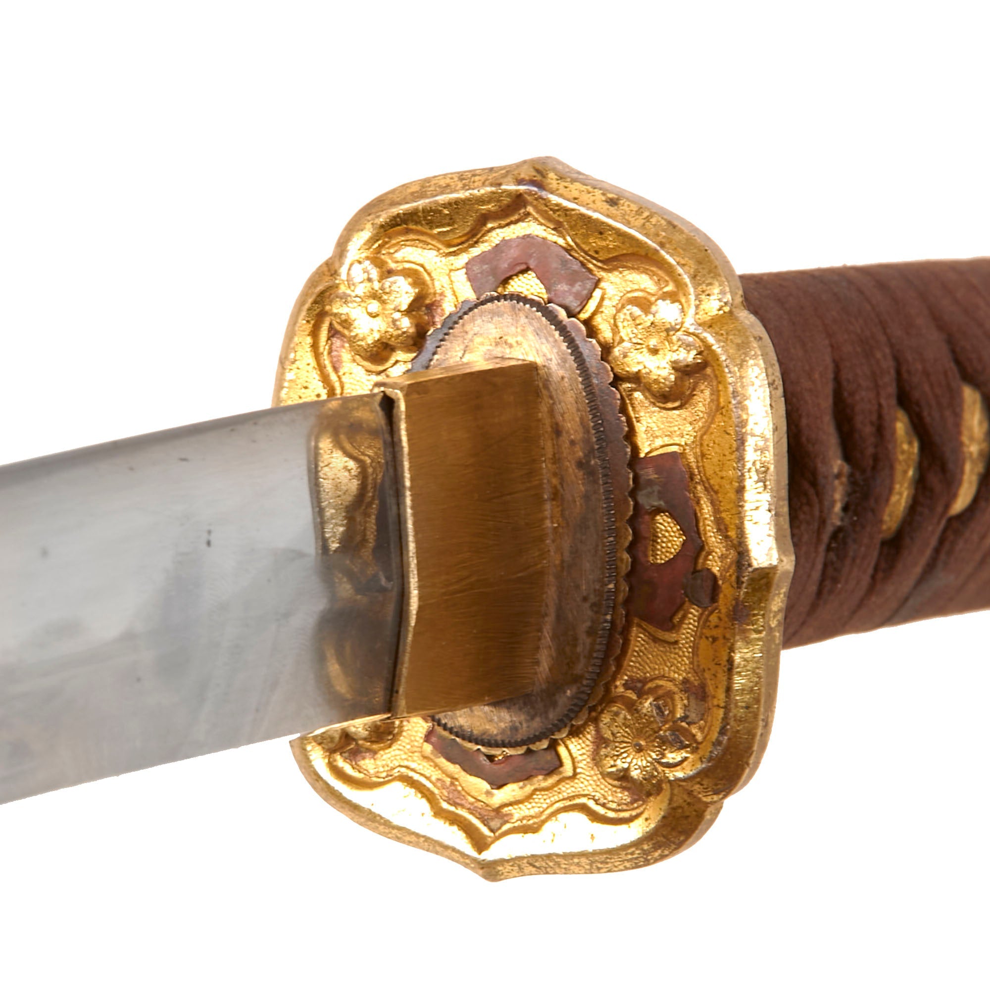 The blade mountings are the classic WWII era Type 98 Army Shin-Gunto style, brass with gilt accents, which have partly worn away. It has the typical rounded brass "quince" (mokko gata) shaped tsuba (cross guard) with brass Imperial Army cherry blossom menuki (grip decoration), and a nice Kabuto-Gane (Pommel Cap). The cross guard and pommel cap have matching cherry blossom motifs, which are also found on the scabbard fittings, and the fuchi (grip collar). There are six metal seppa (spacers) around the tsuba to keep the fit tight. All are inlet for the scabbard lock, which has had the end clip break off, and is no longer functional. The blade collar (habaki) looks to be plated copper or bronze alloy.