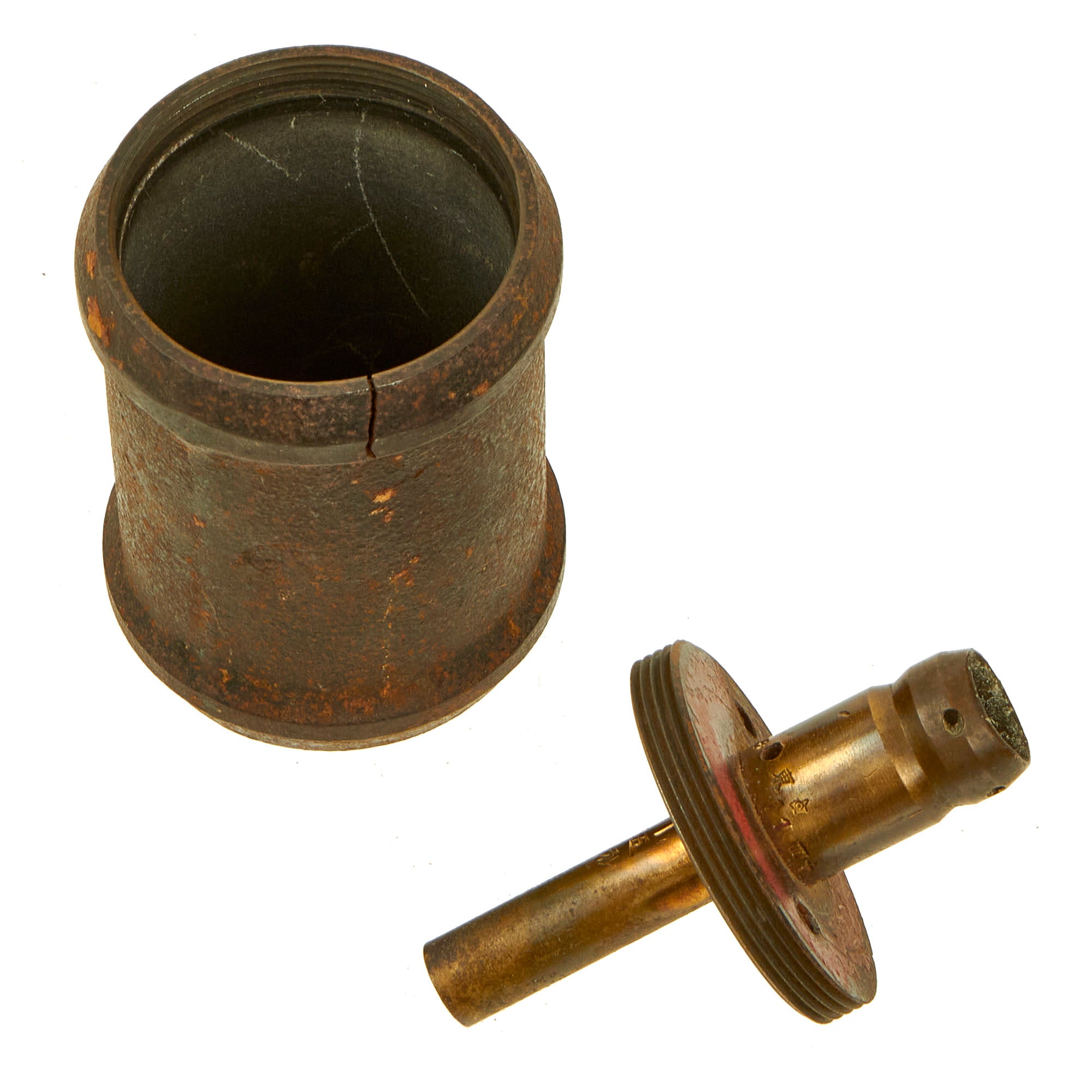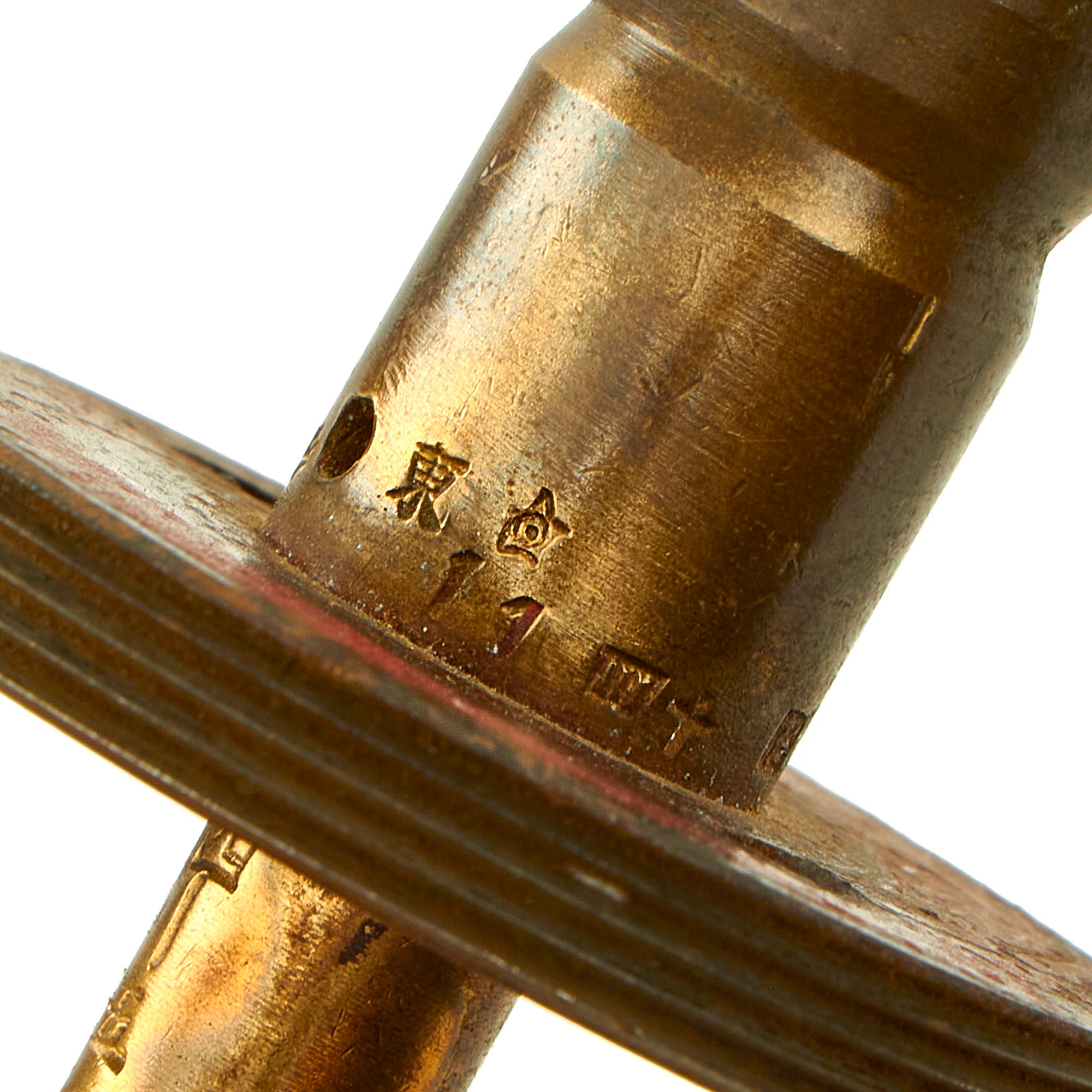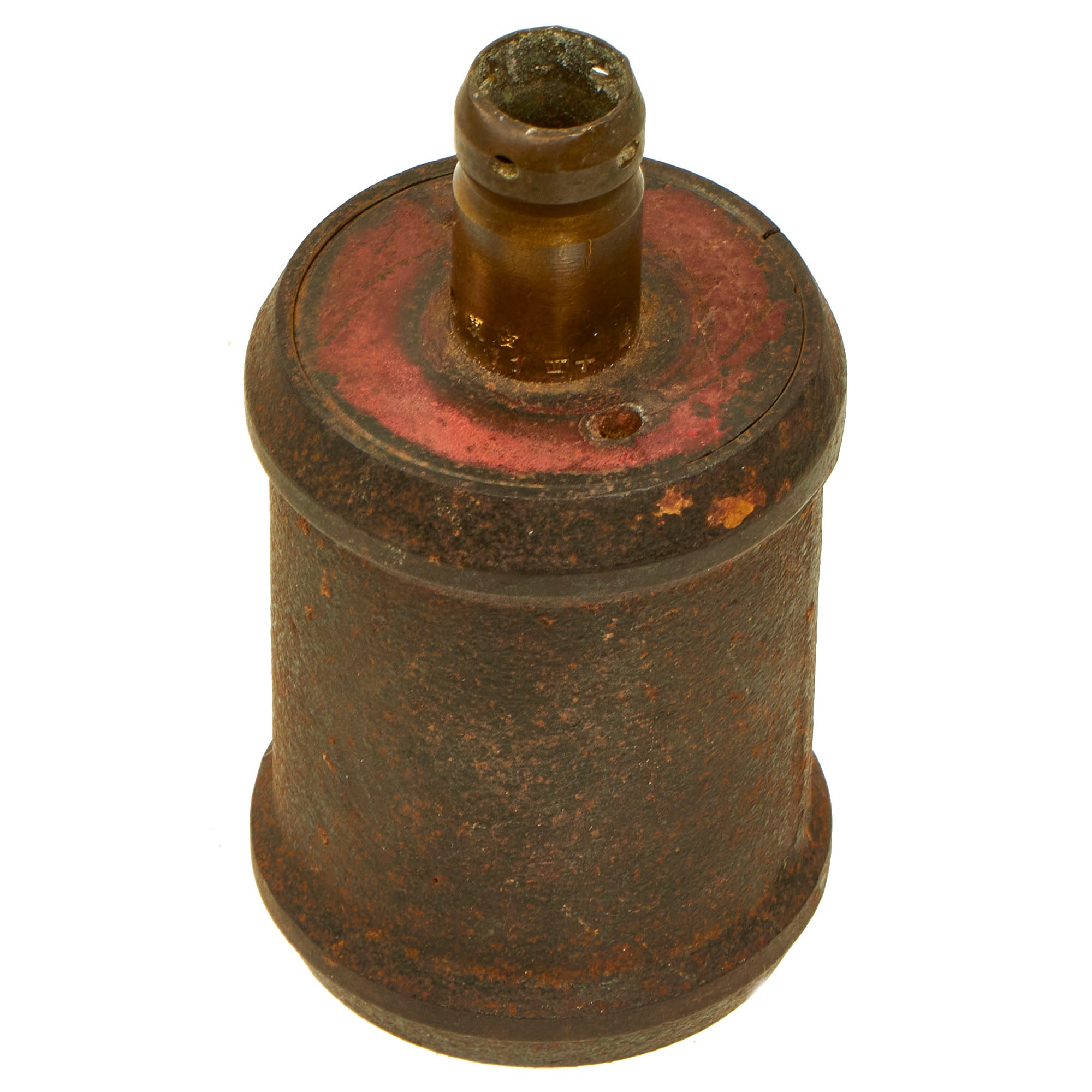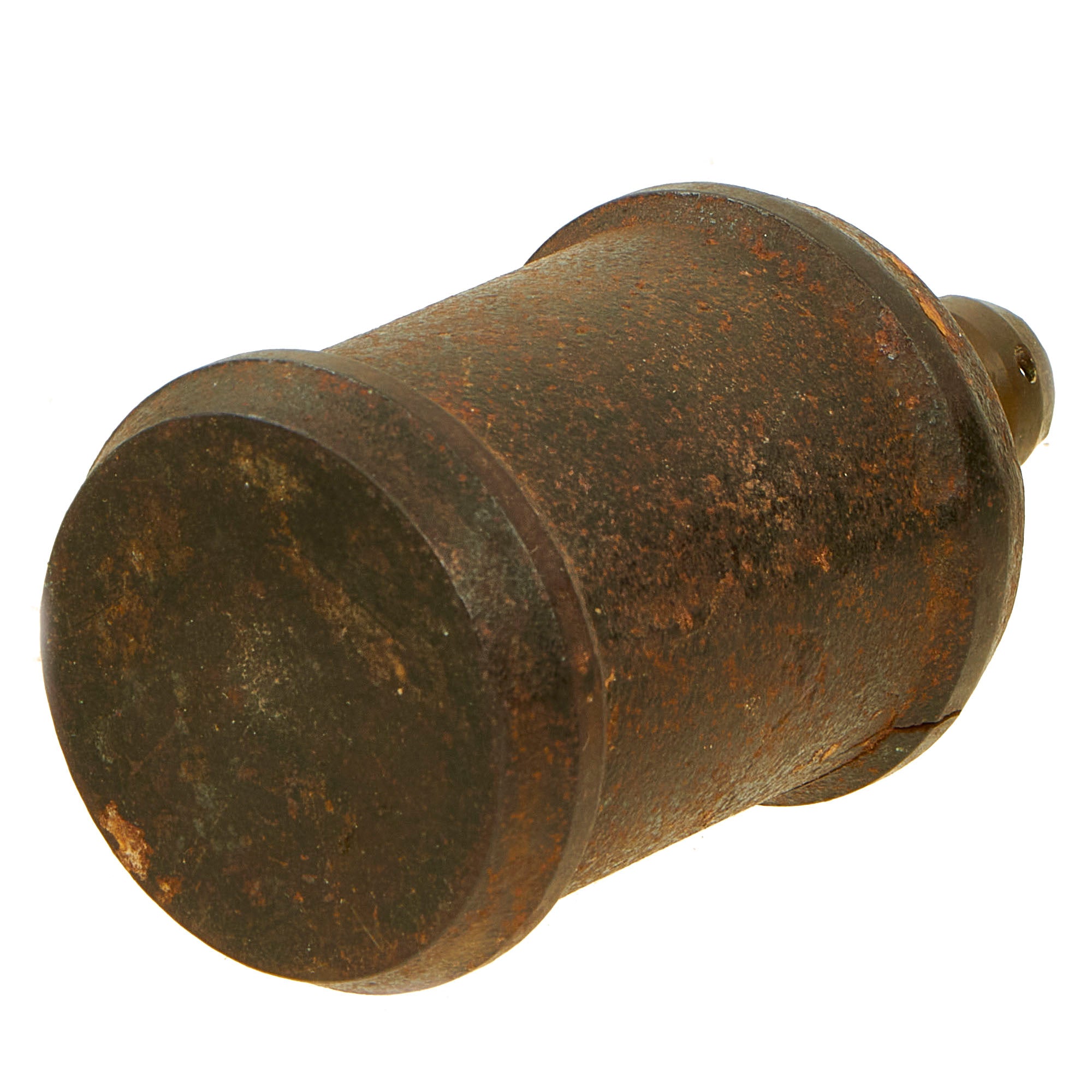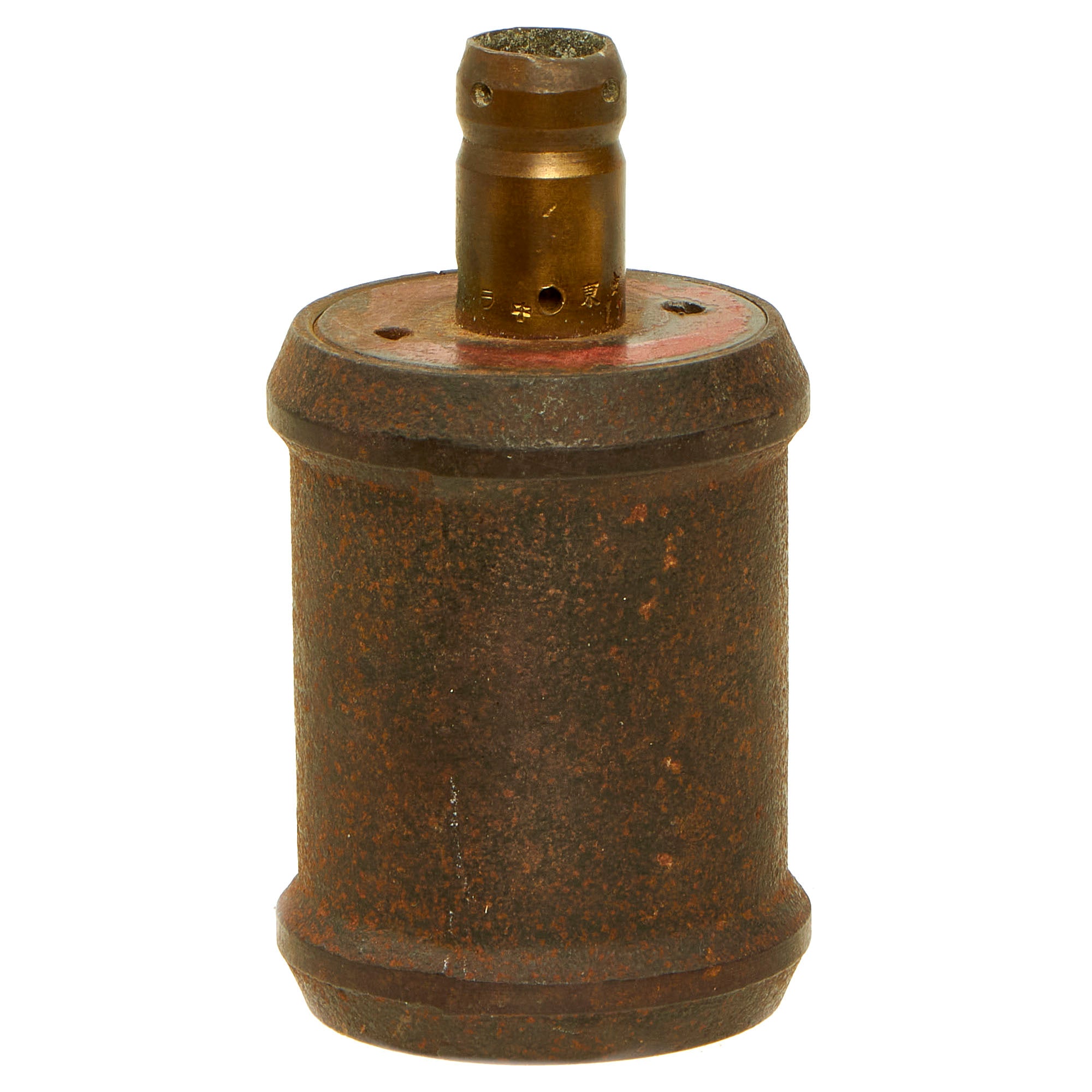 Original Item: Only One Available. This is an exceptionally rare inert demilitarized genuine Japanese Type 99 Hand Grenade. This example is offered in good condition complete with fuse, original top cap, but is missing the cup and fuse cover assembly. Unfortunately the detonator tube is missing as well. This example disassembles for inspection, with the top cap able to unscrew, revealing the explosives cavity, now empty. The fuse base on this example is actually marked with a Japanese date: 11 四 十 昭. This marking is written right to left, and would be read: SHOWA (current reigning emperor) Juu-Roku Nen (14th year of reign - 1939) 11th month (November).