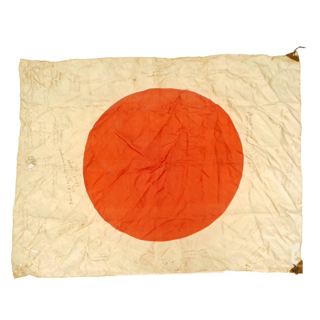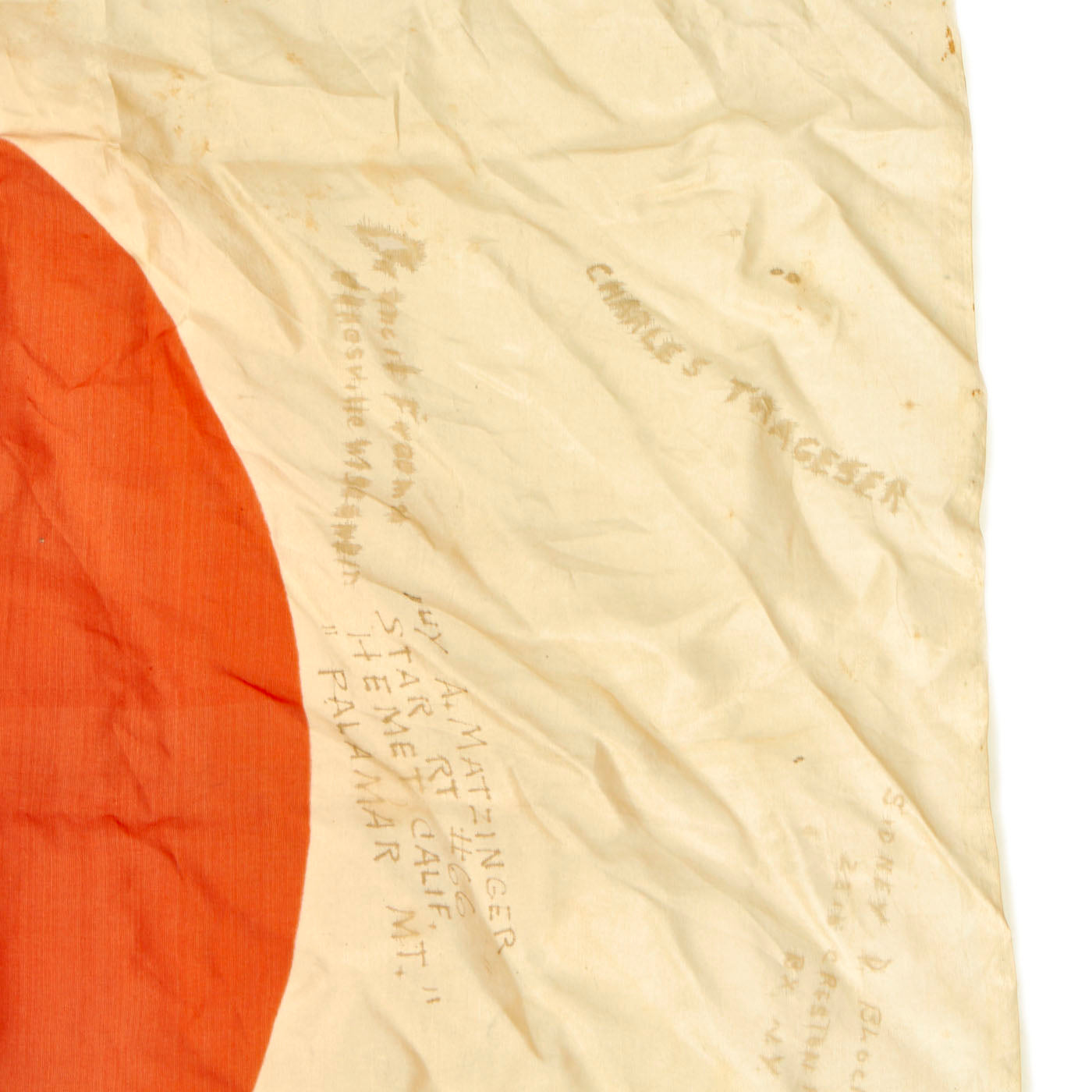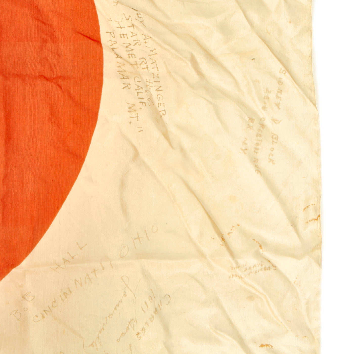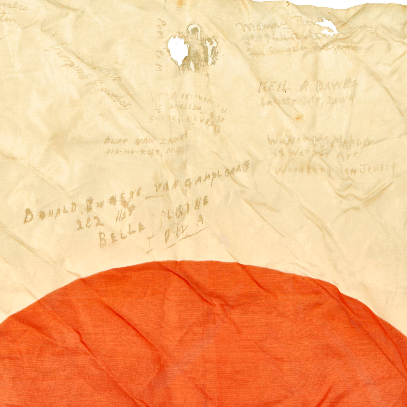 Original Item: One-of-a-kind. Just purchased at a large military auction! This is a lovely US GI Bring Back from WWII: an original Japanese WWII "Meatball" National flag, captured and personalized by the soldiers or Marines that captured it. They added their names and hometowns, often including their street address as well! We counted, and there are at least 30 names on this flag! Many are written in cursive script, and are difficult to read, but it just shows that many different people signed this flag. The locations listed literally come from all over the country. There is unfortunately no information regarding what unit these brave men were with, but it may be possible to find out after some research.