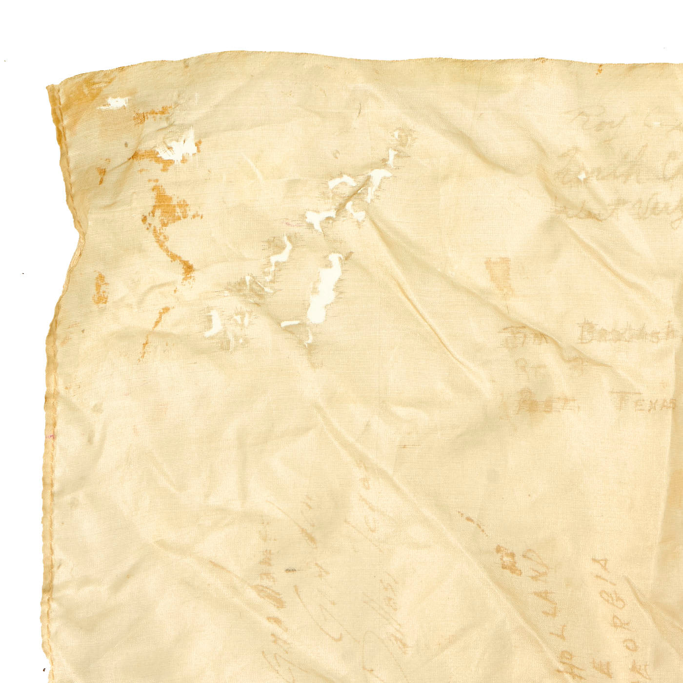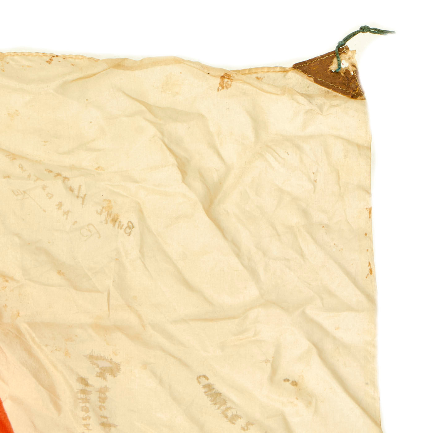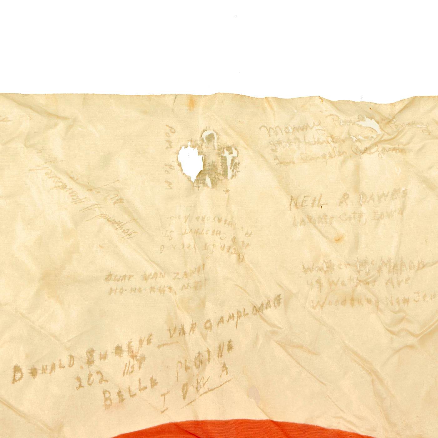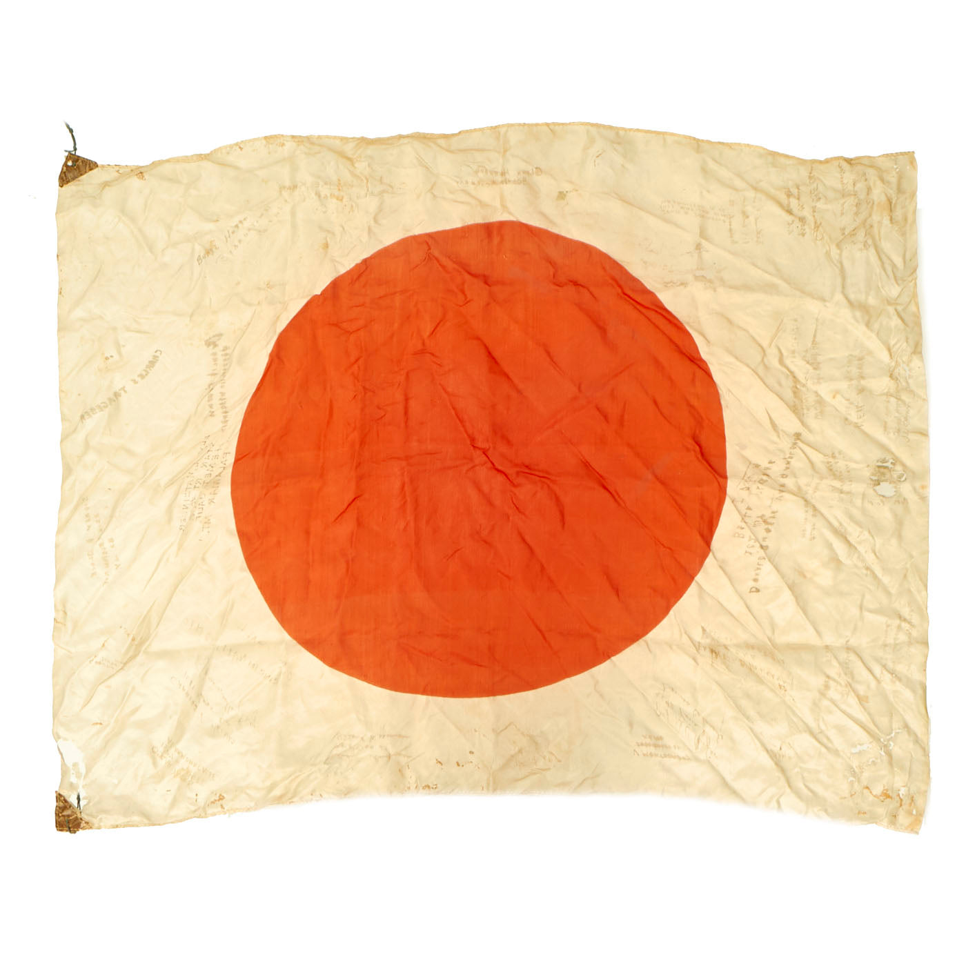 Original Item: One-of-a-kind. Just purchased at a large military auction! This is a lovely US GI Bring Back from WWII: an original Japanese WWII "Meatball" National flag, captured and personalized by the soldiers or Marines that captured it. They added their names and hometowns, often including their street address as well! We counted, and there are at least 30 names on this flag! Many are written in cursive script, and are difficult to read, but it just shows that many different people signed this flag. The locations listed literally come from all over the country. There is unfortunately no information regarding what unit these brave men were with, but it may be possible to find out after some research.