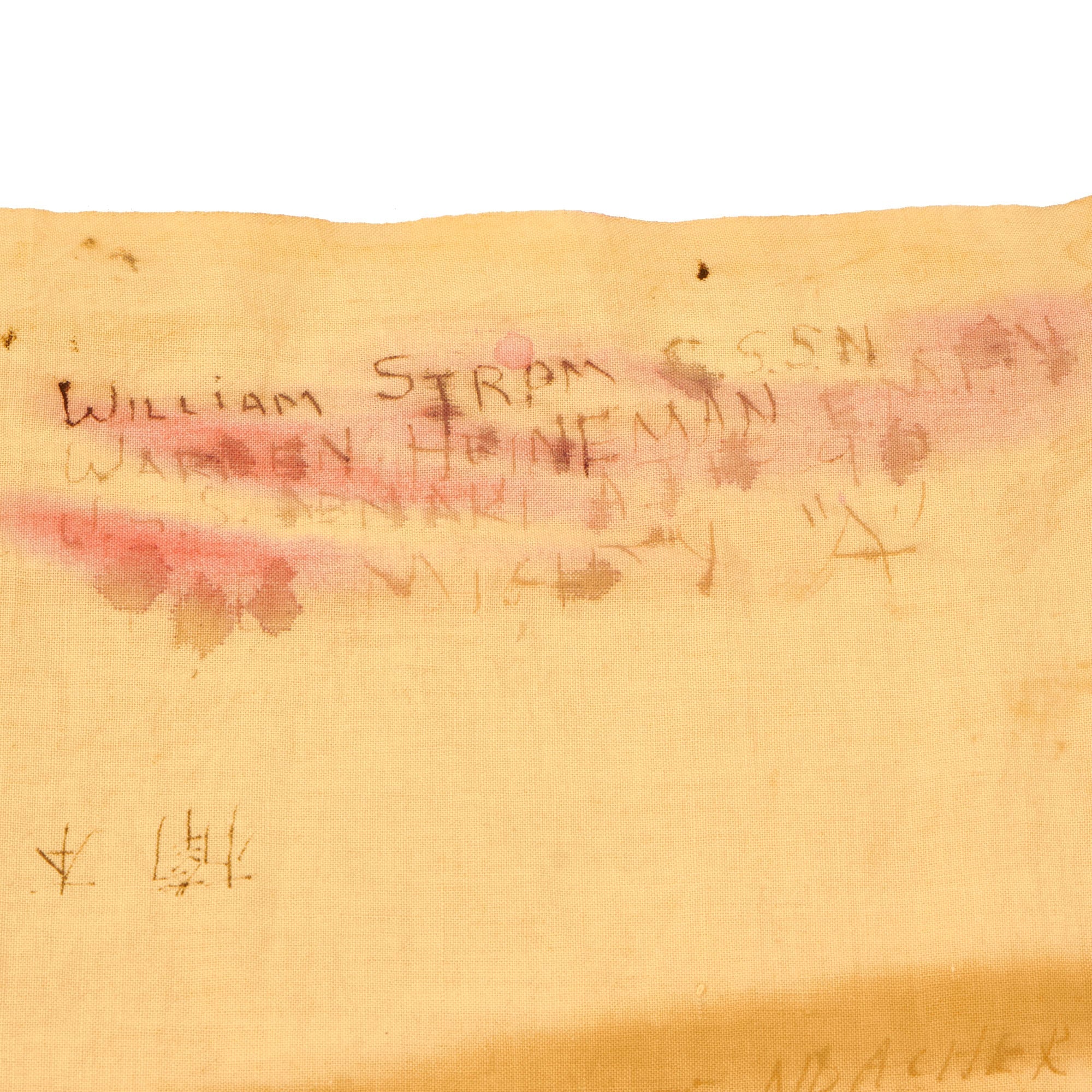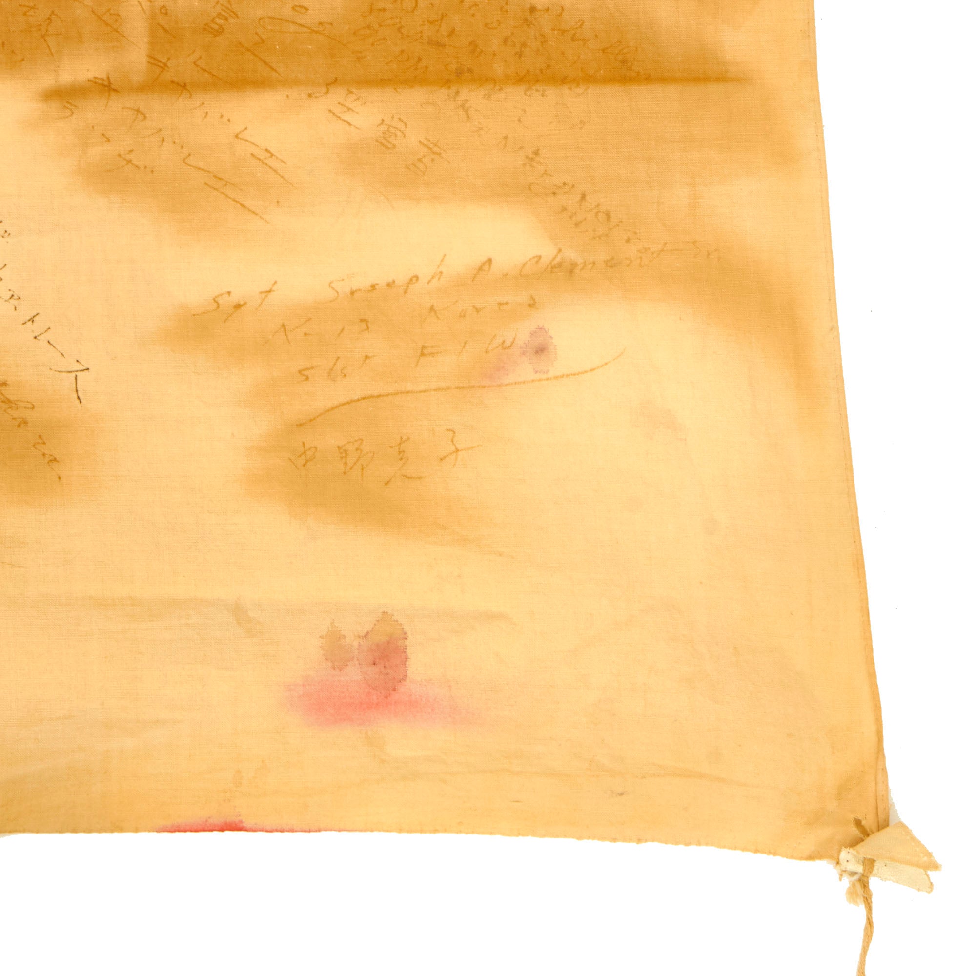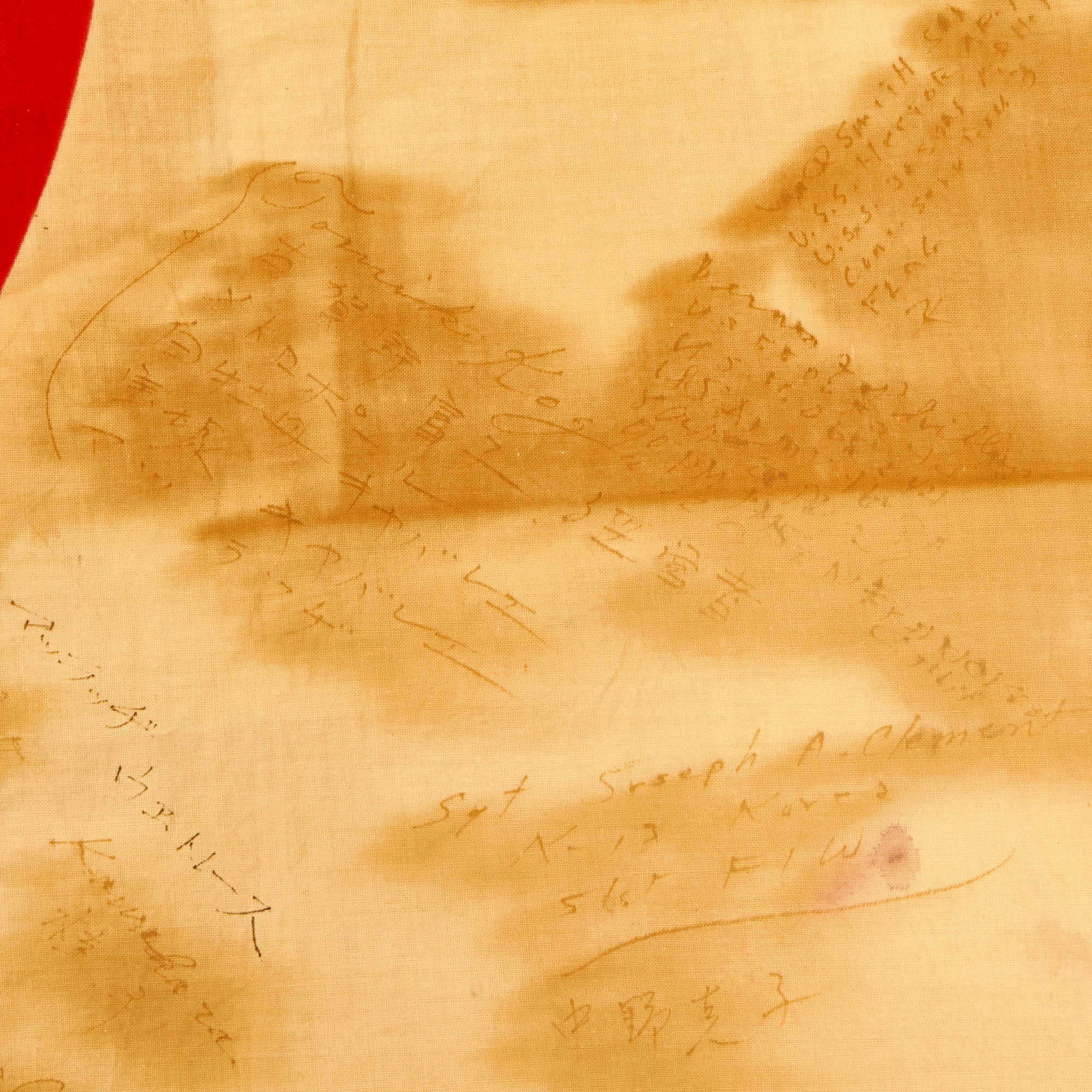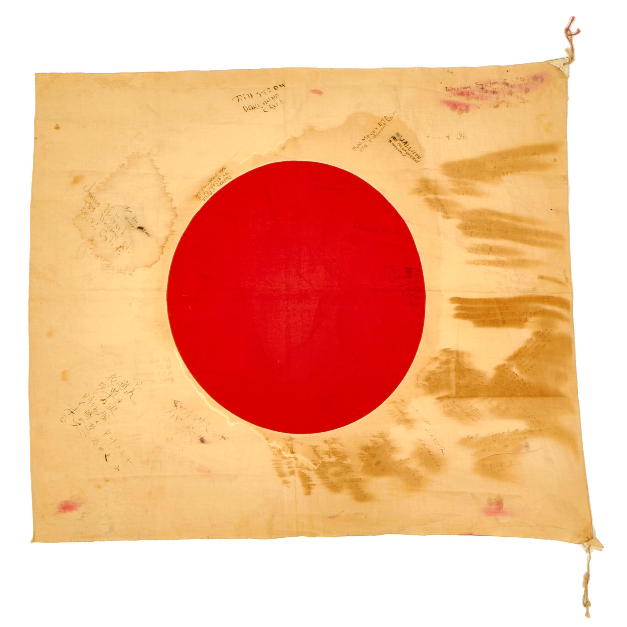 Original Item: One-of-a-kind. Just purchased at a large military auction! This is a lovely USGI Bring Back from WWII: an original Japanese WWII "Meatball" National flag, captured and personalized by the soldiers that captured it. They added their names and hometowns, often including their street address as well! We counted, and there are at least 15 names on this flag! Many are written in cursive script, and are difficult to read, but it just shows that many different people signed this flag. The locations listed literally come from all over the country. There is unfortunately no information regarding what unit these brave men were with, but it may be possible to find out after some research.