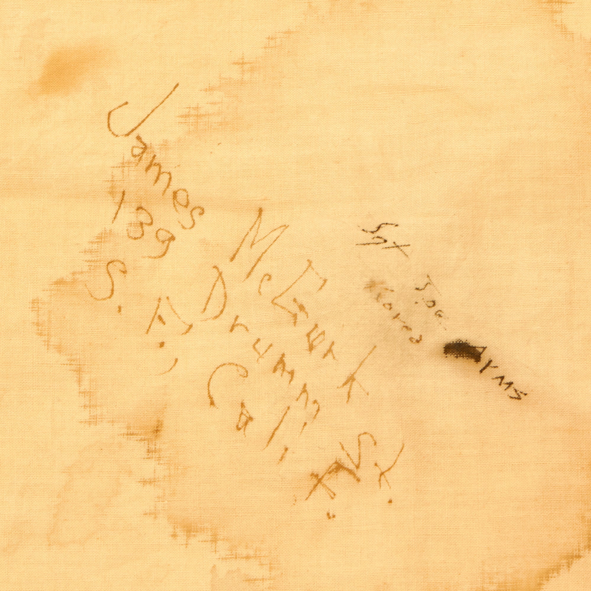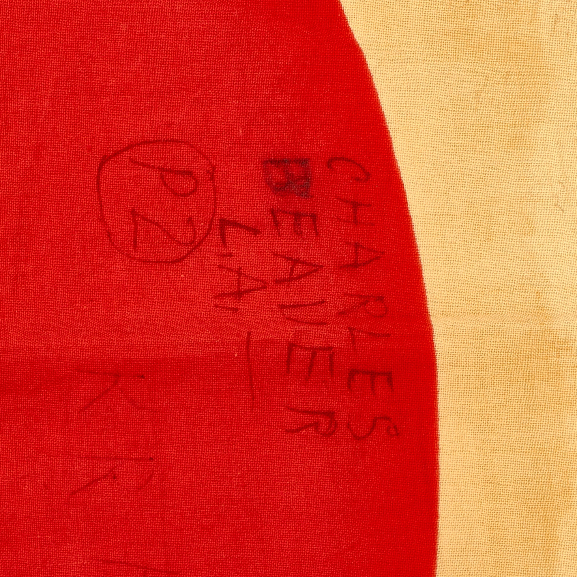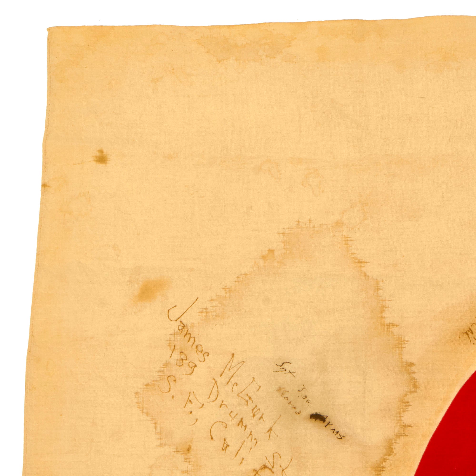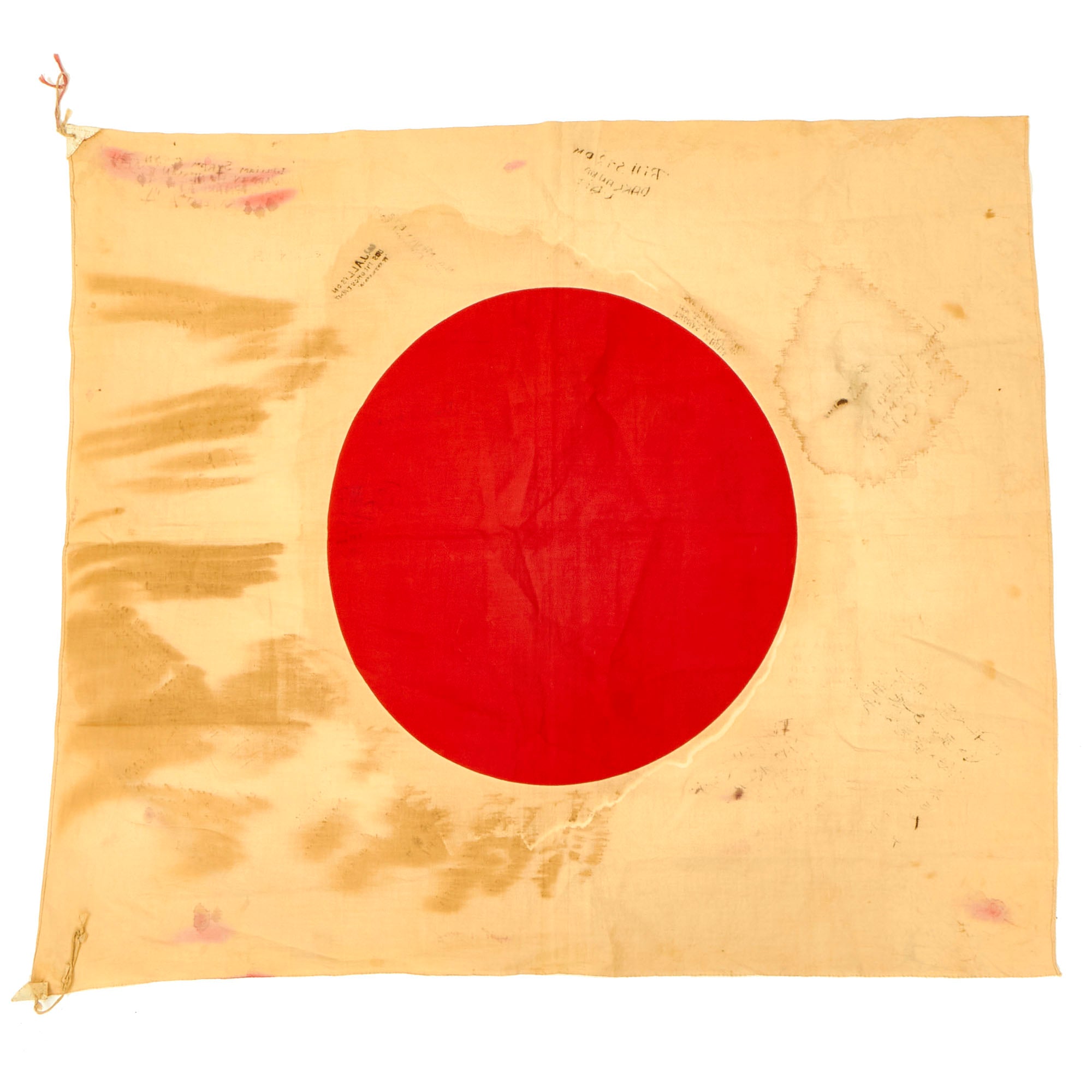 The flag measures approximately 29"H x 34"W, and looks to be made from cotton. The body of the flag is aged white, with a red "sun round" dyed into the middle. It has canvas corner reinforcements, though they are now worn, with the hanging ties still intact. This flag definitely has seen some wear from service, but is still in very good condition. It has the expected age toning, and areas where the fabric has torn due to wear. This is a size that could have been used as a good luck flag, but may also have been flown as a national flag.
