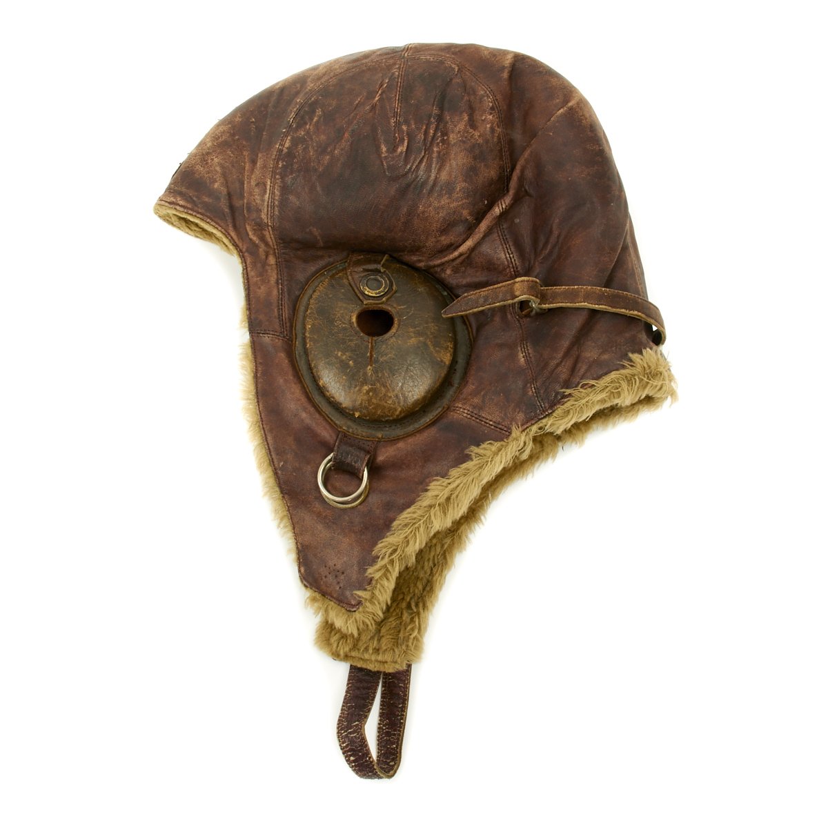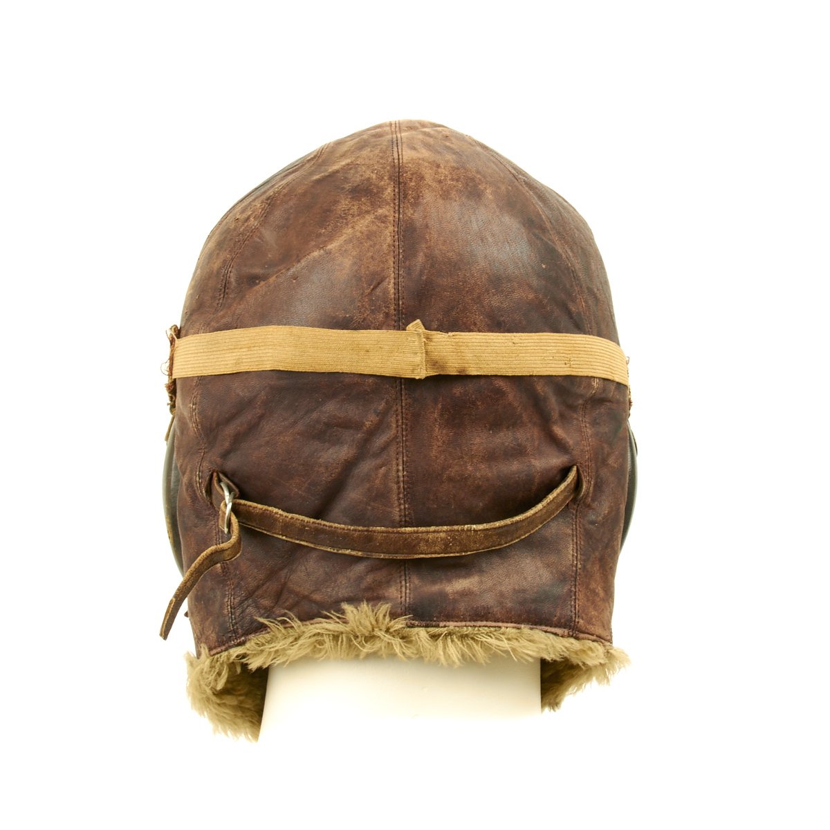 Original Items: Only One Set Available. Made of a rich deep red-brown leather, this helmet is in excellent condition. It is constructed of 8 separate pieces of leather, with a 5 pointed Japanese Army Star on the front. The ear cups are complete, and made of hardened leather, each having holes in the center for mounting the communication equipment and receivers. All straps are fully functional, all the buckles and tabs work perfectly. The data stamp (written in Kanji) is stamped into the earpiece and is clearly legible.