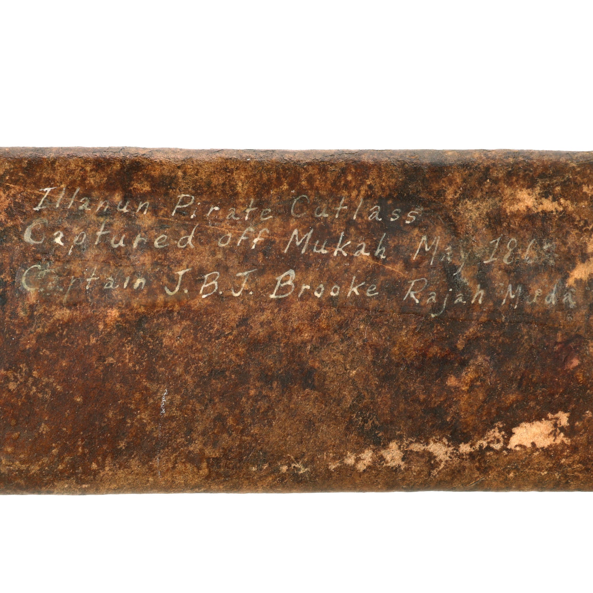 This is a tremendous Illanun Pirate Cutlass which was captured by the Captain, John Brooke Johnson Brooke, who led the Sarawak forces during the battle. The delightful makeshift scabbard of the cutlass is inscribed: