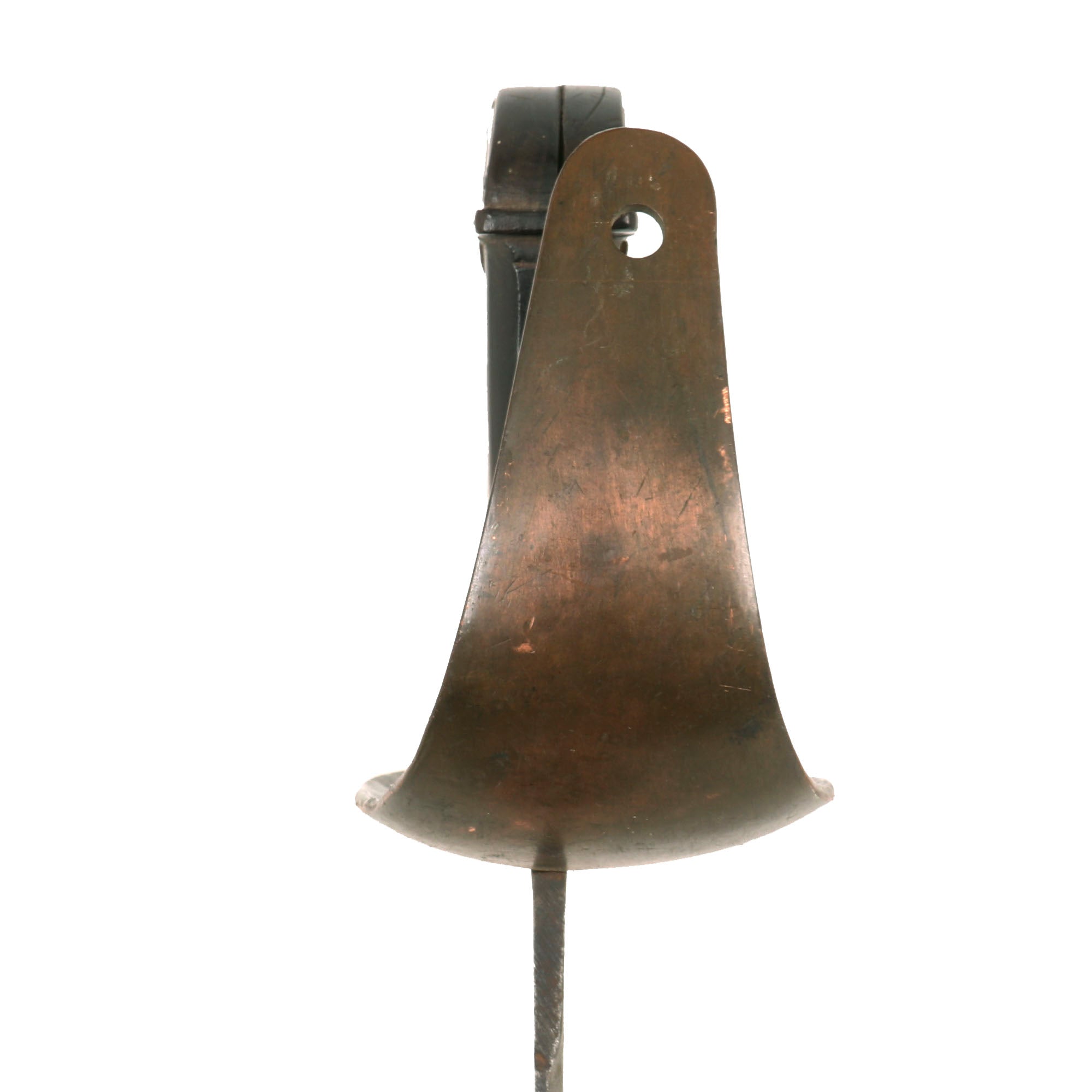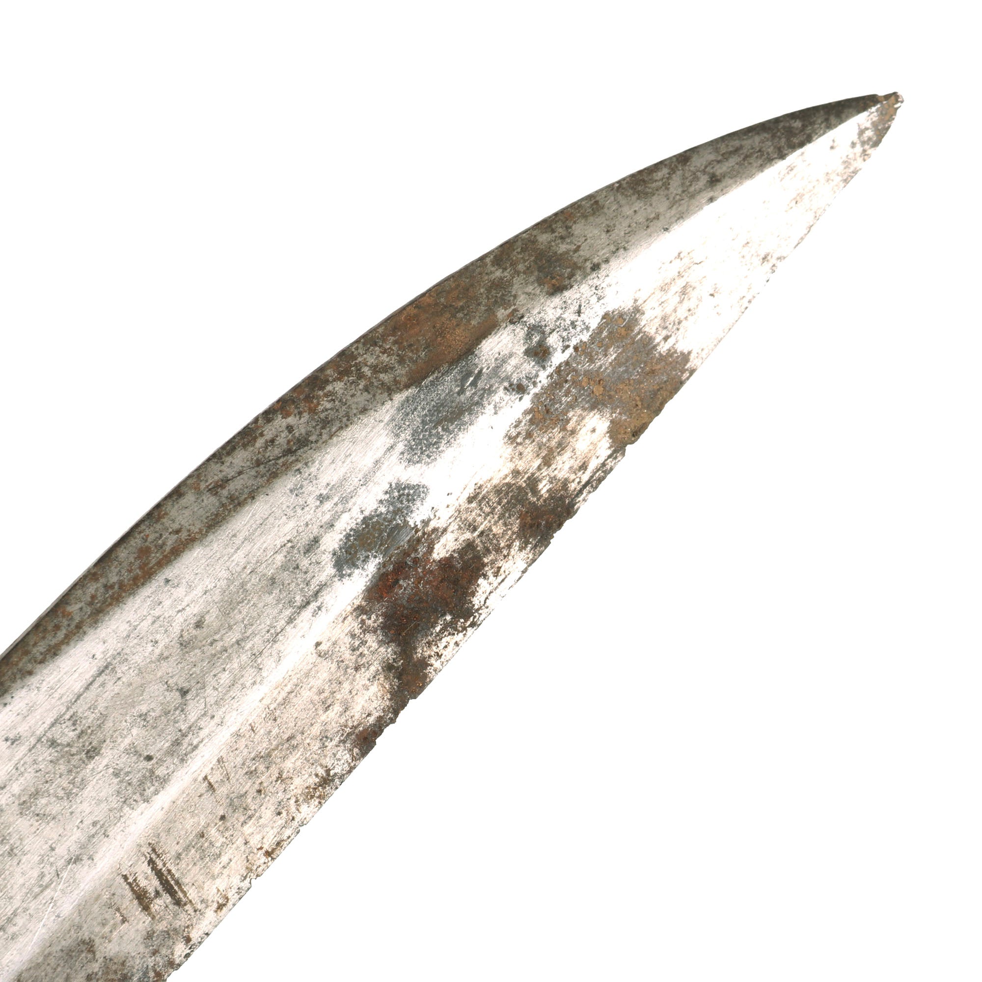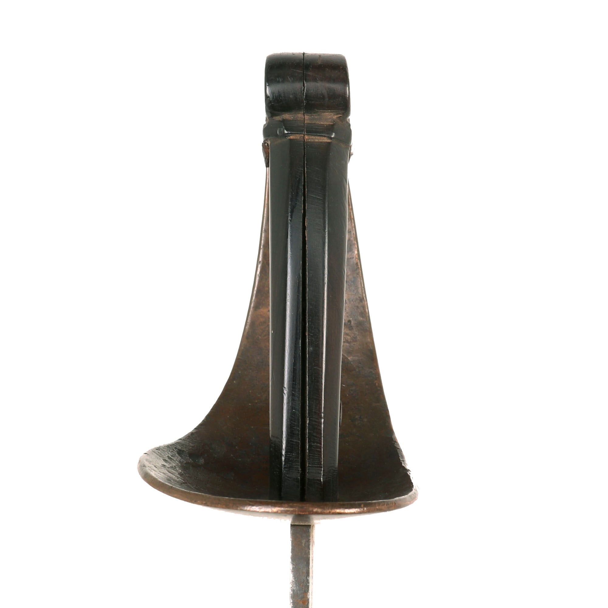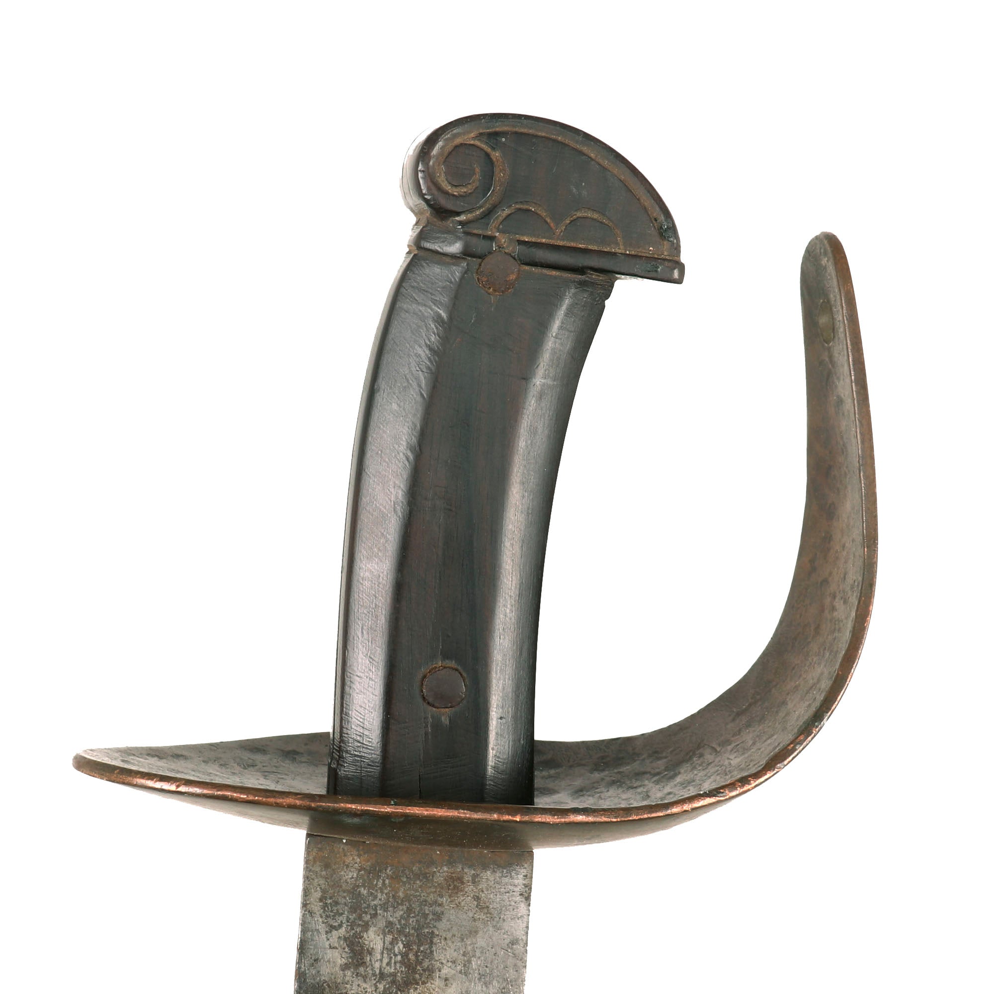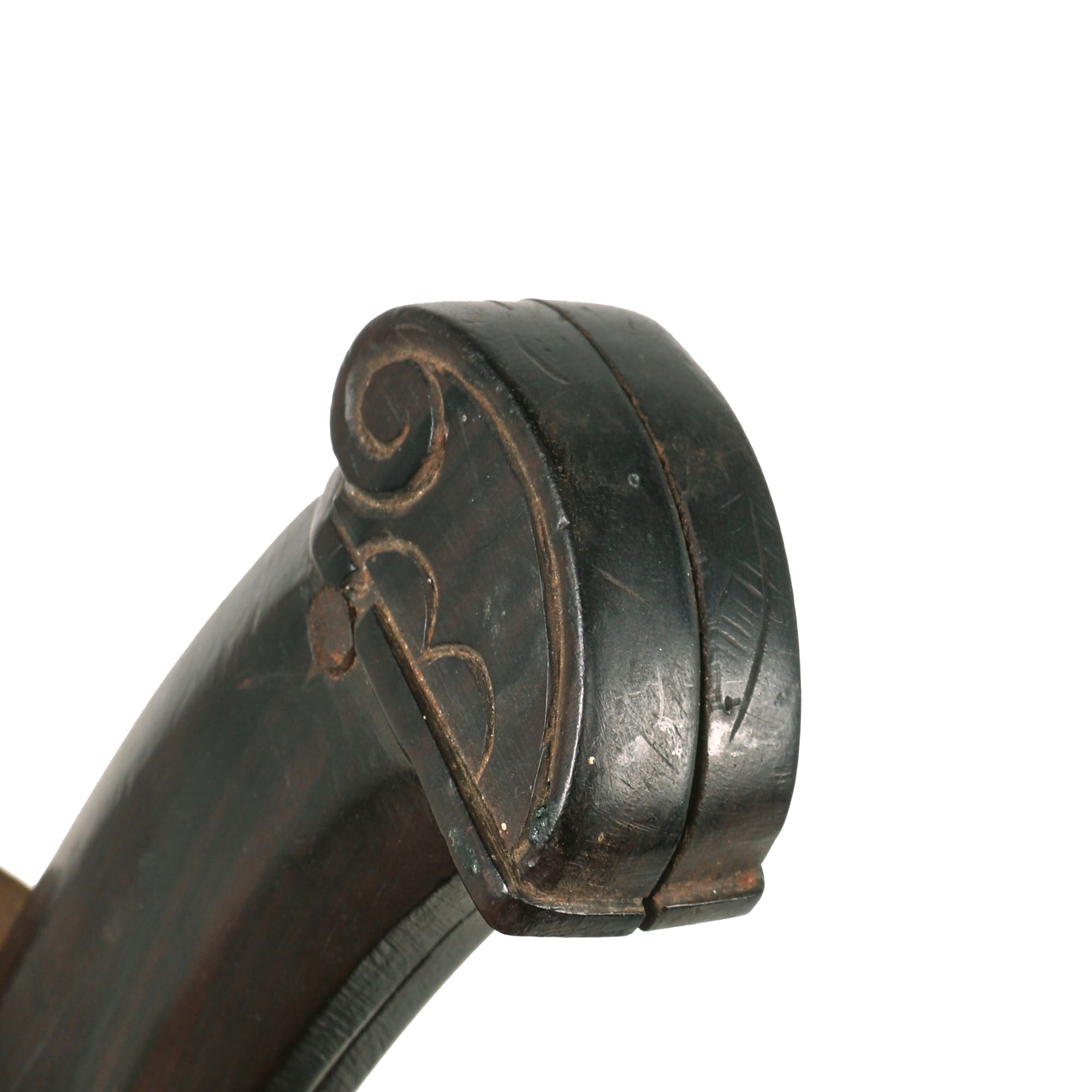 The cutlass has a 20½” blade with a very interesting design. There are some chips in the edge of the blade The guard appears to have originally had a connection between the hole at the end of the guard and the pommel, but there is now just a space there. The wooden handle is carved with a depiction of waves, and the guard is now a bit loose on the blade. There is some cracking in the handle as shown. The cutlass is roughly 24¾” overall. The makeshift scabbard of the cutlass is made of wood bound in leather, measuring 20¾”.