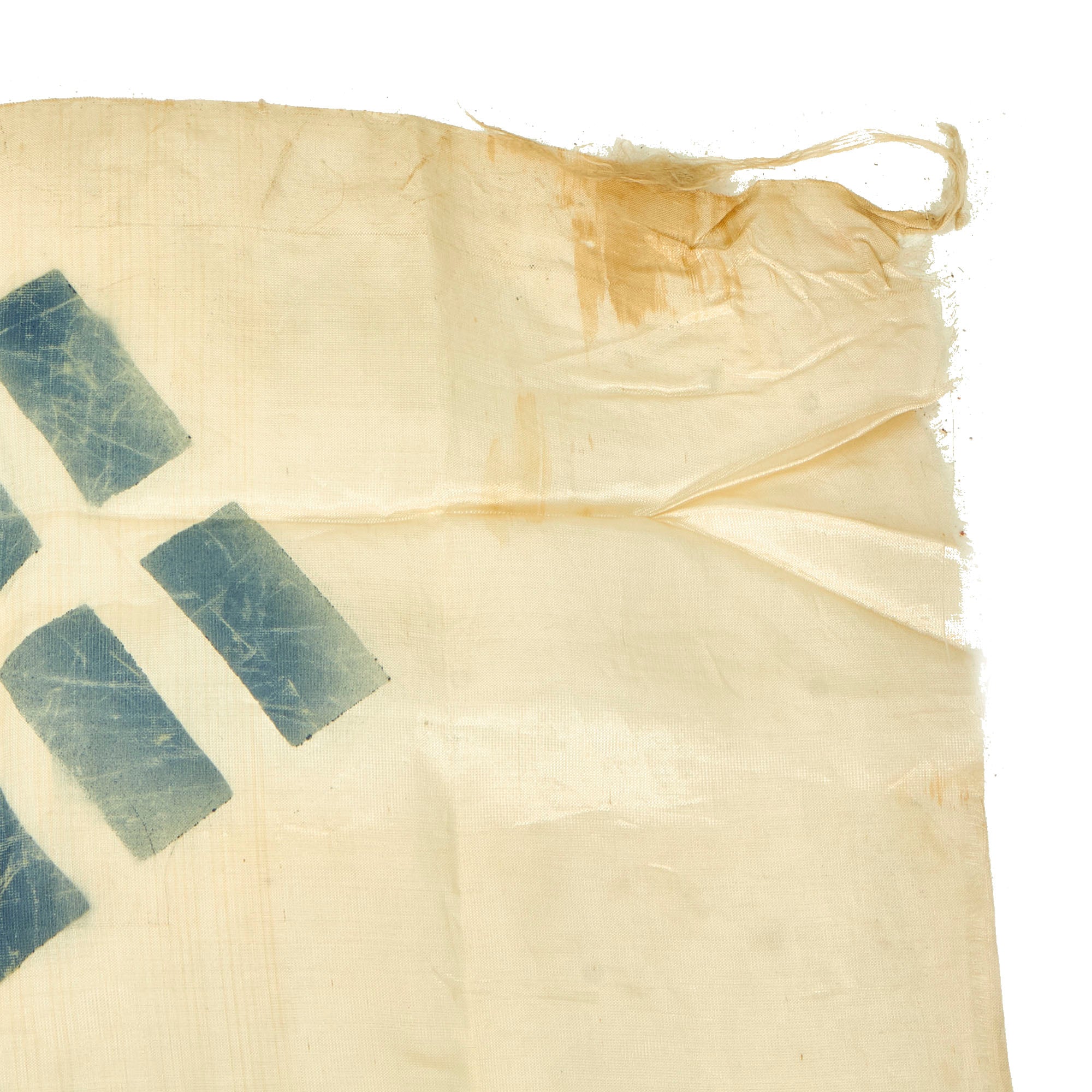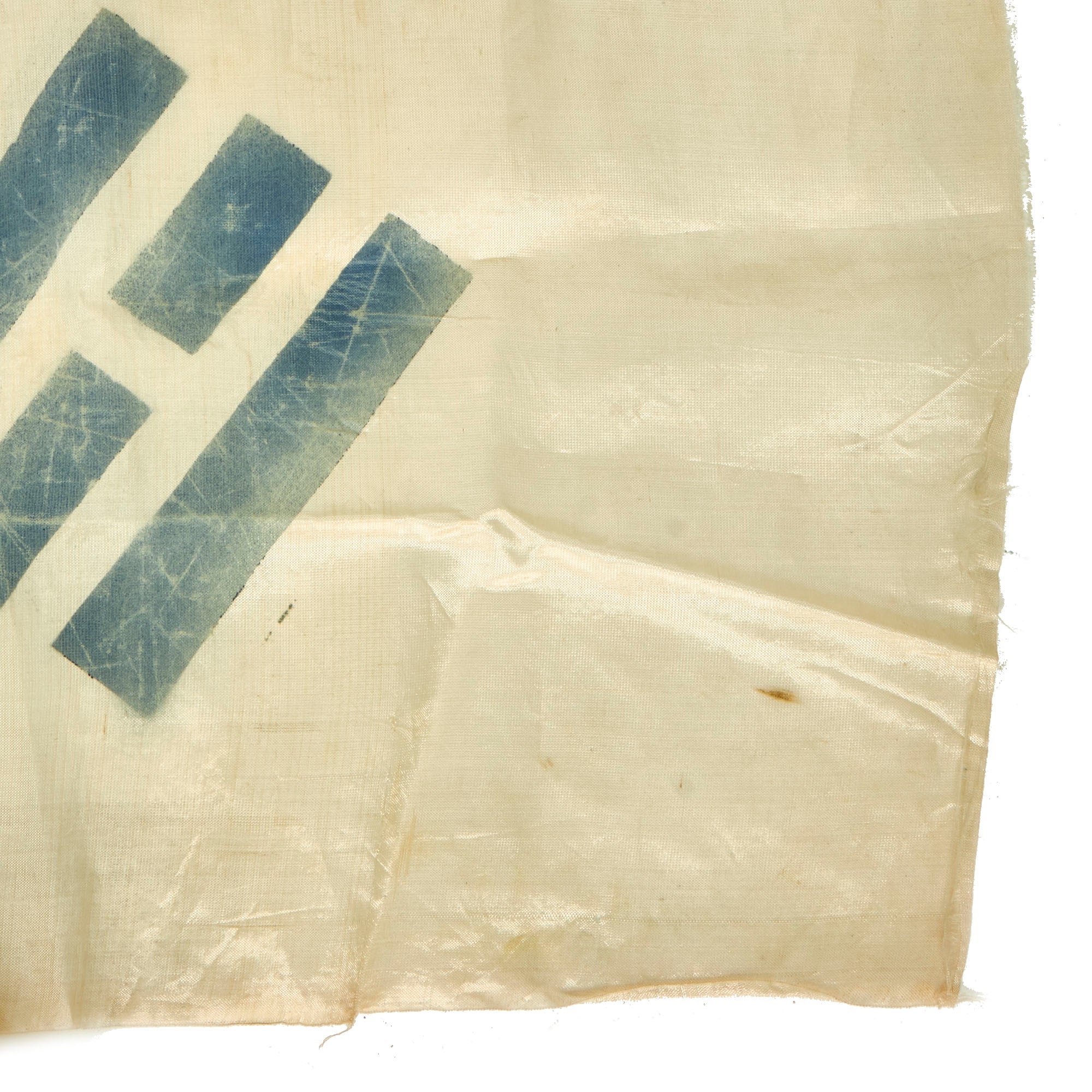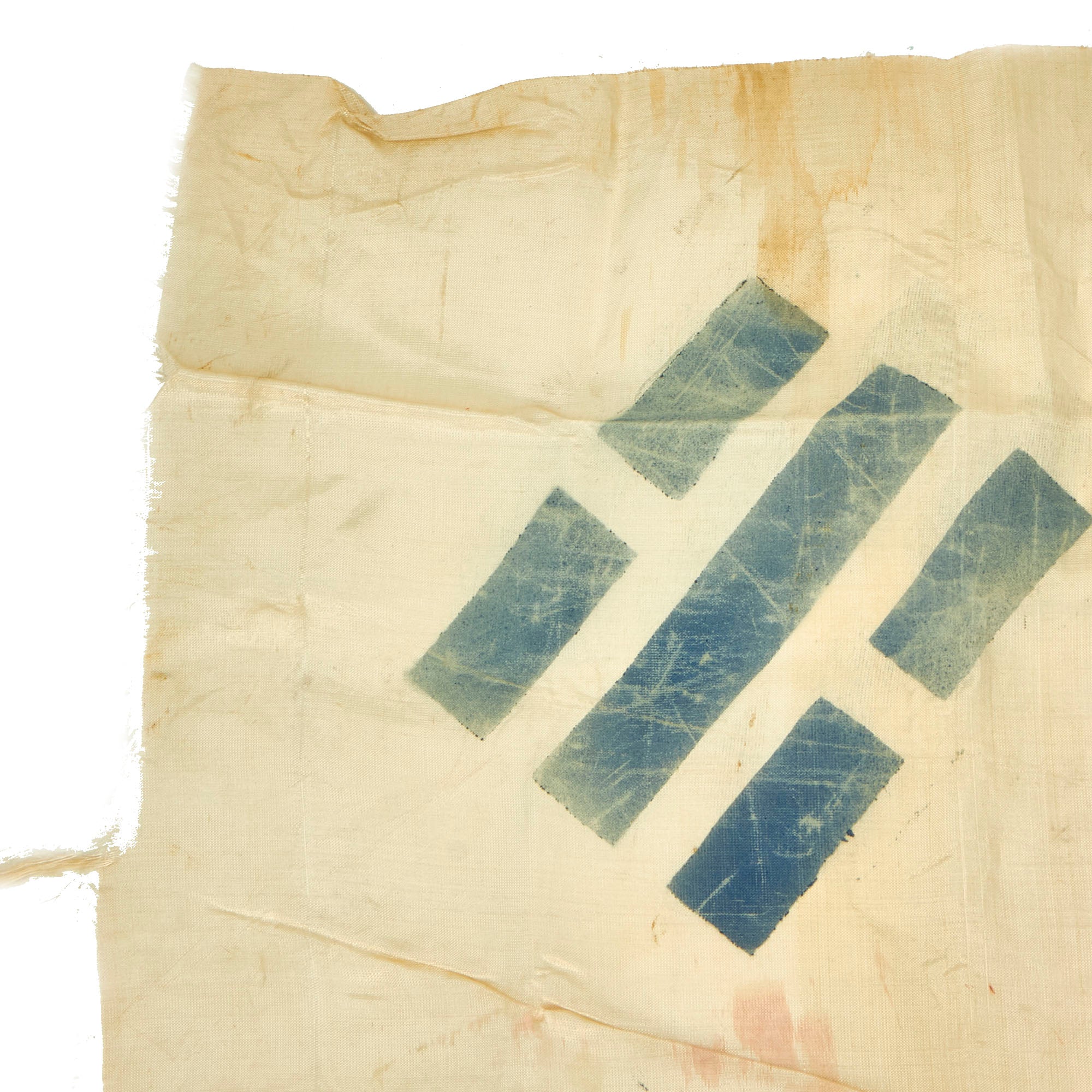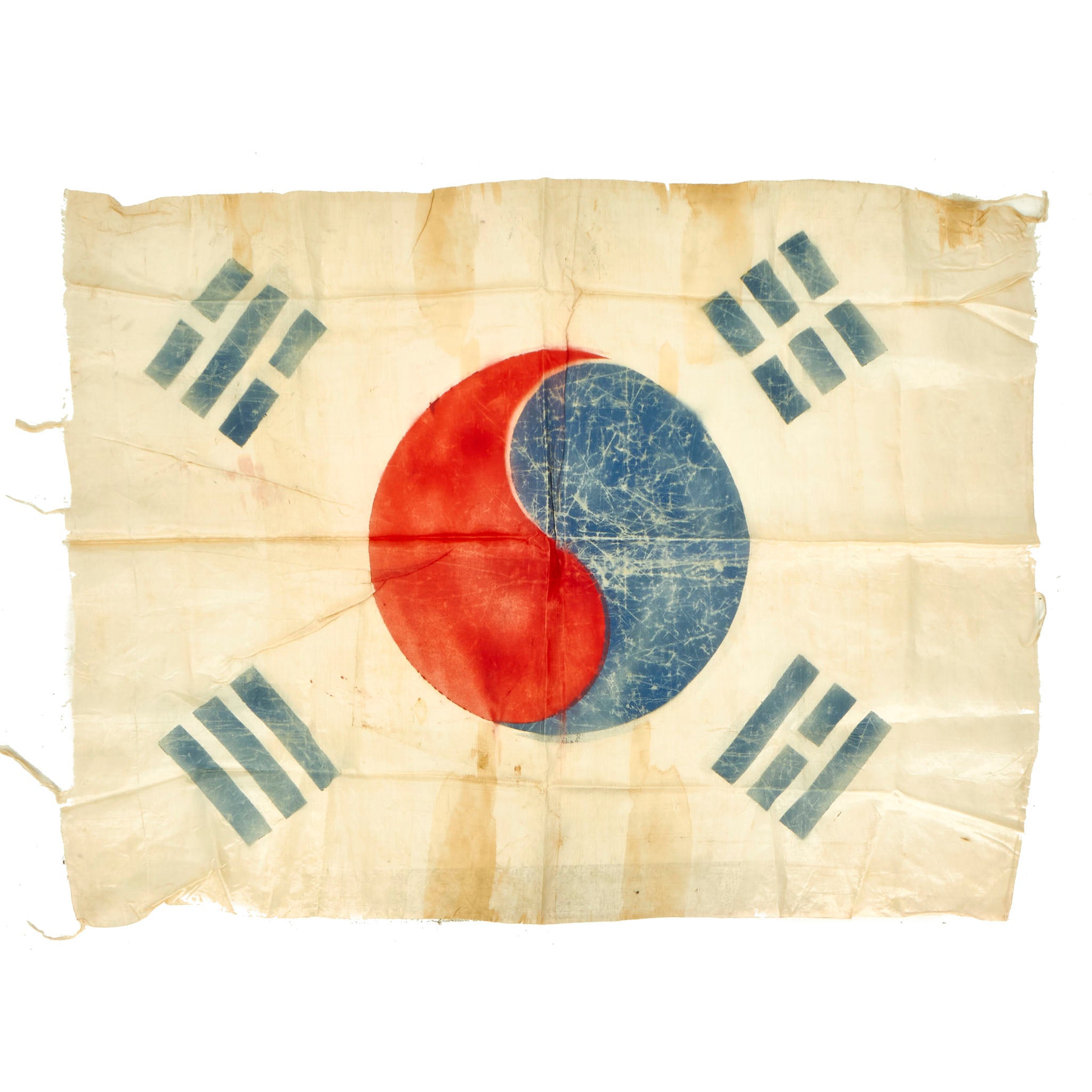 This example of the Taegukgi is quite attractive. It is constructed of a rayon silk like material which has unfortunately hardened and made the material somewhat brittle, so do handle with care as it tears easily. The insignia is painted on with the colors retained well, but there is the expected cracking.