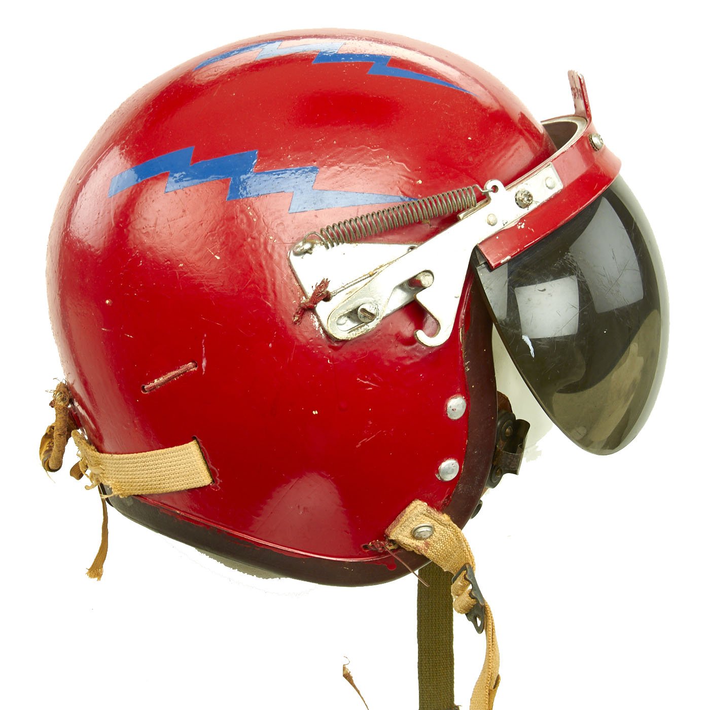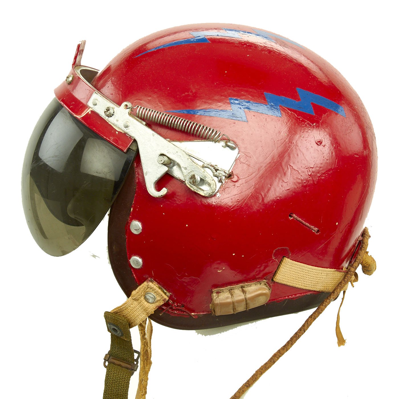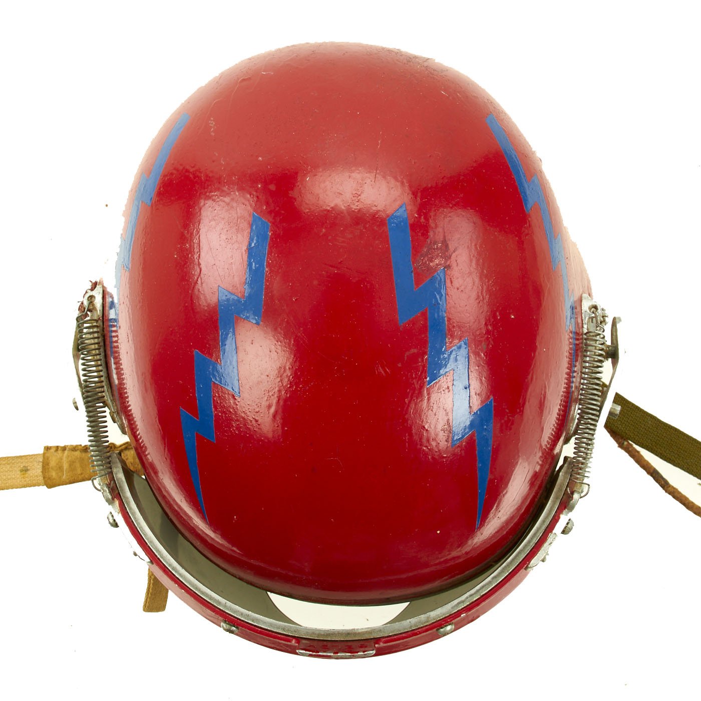 This example has been retrofitted with a later P-3 Style Visor. it has also been custom painted cherry red with blue lighting bolts. Offered in very good condition.