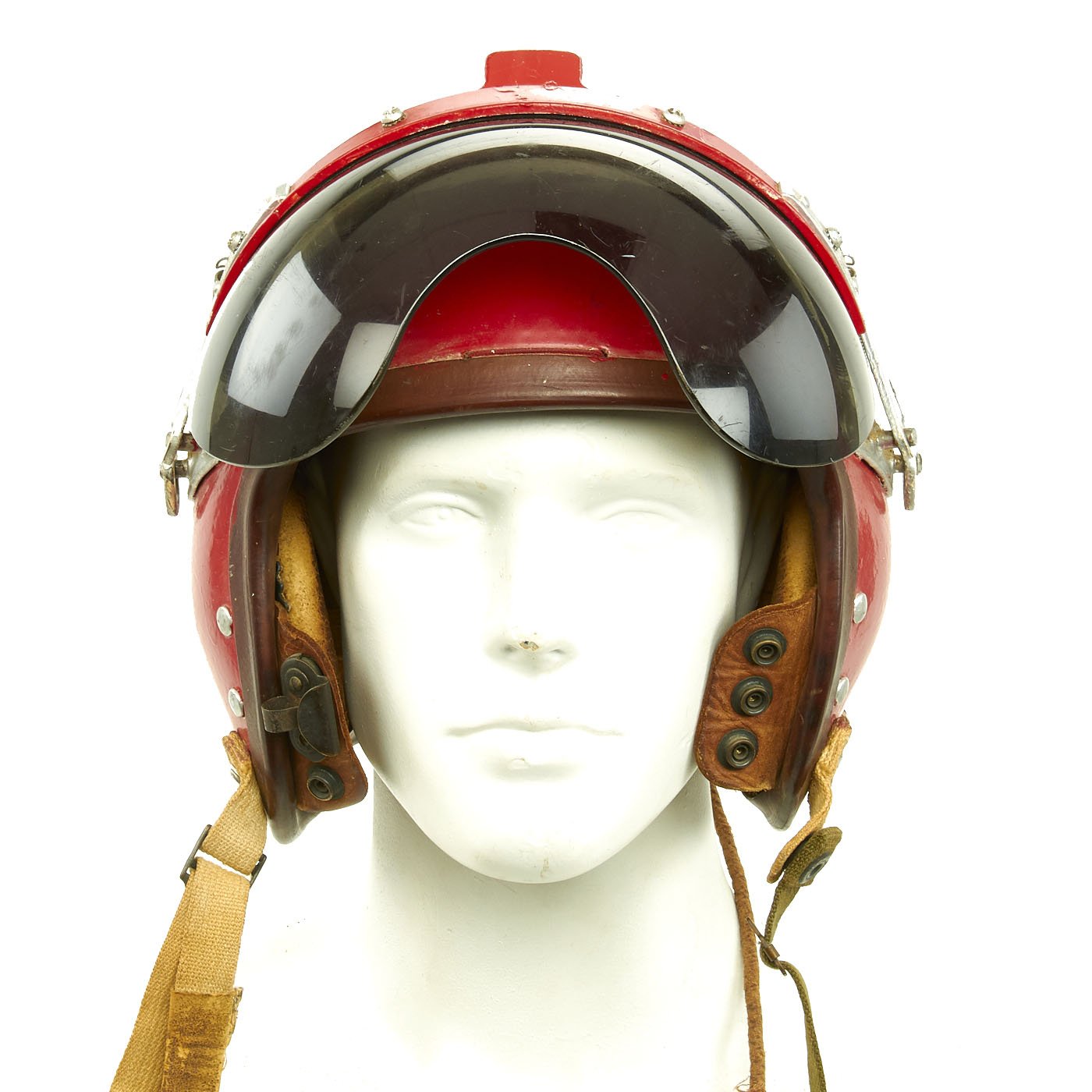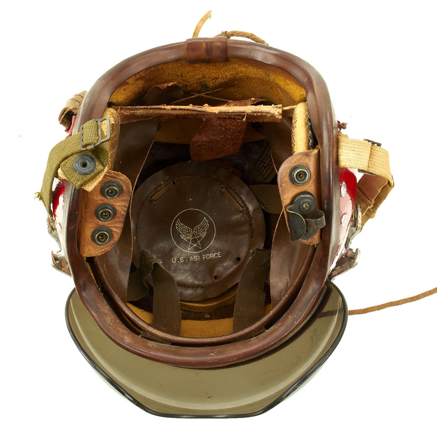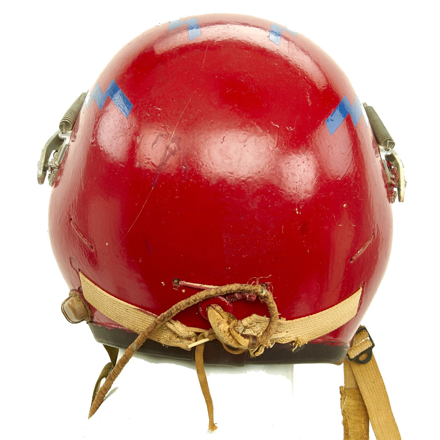This example has been retrofitted with a later P-3 Style Visor. it has also been custom painted cherry red with blue lighting bolts. Offered in very good condition.