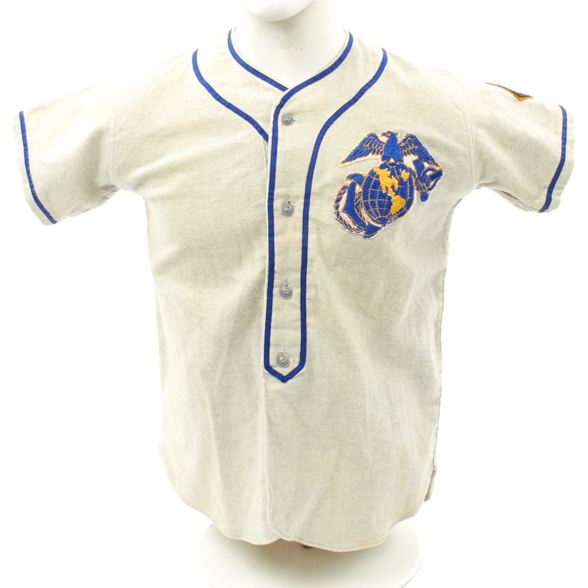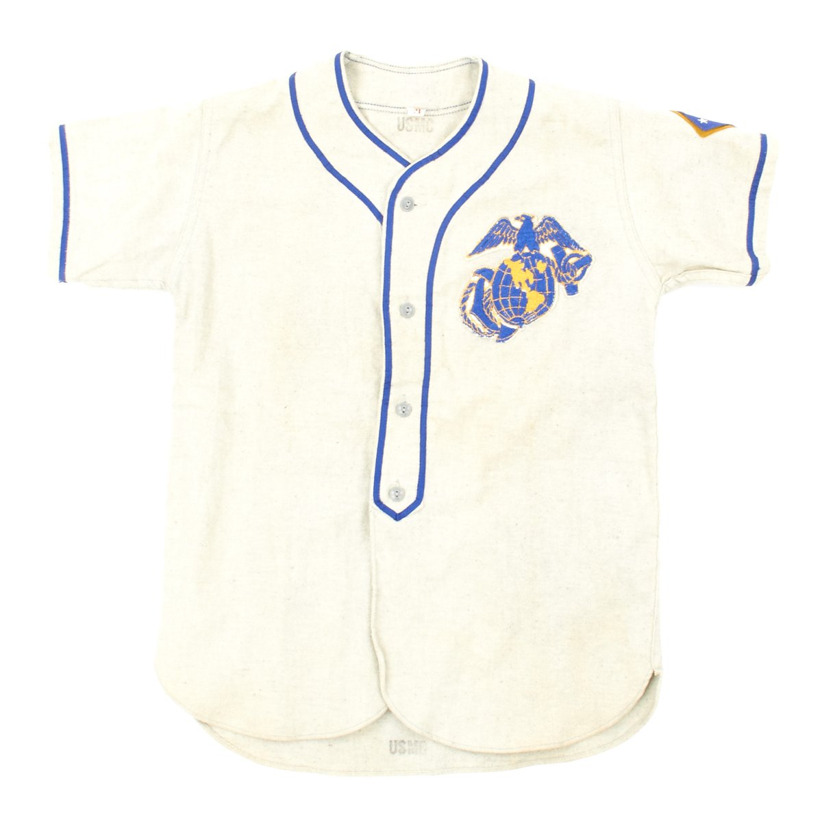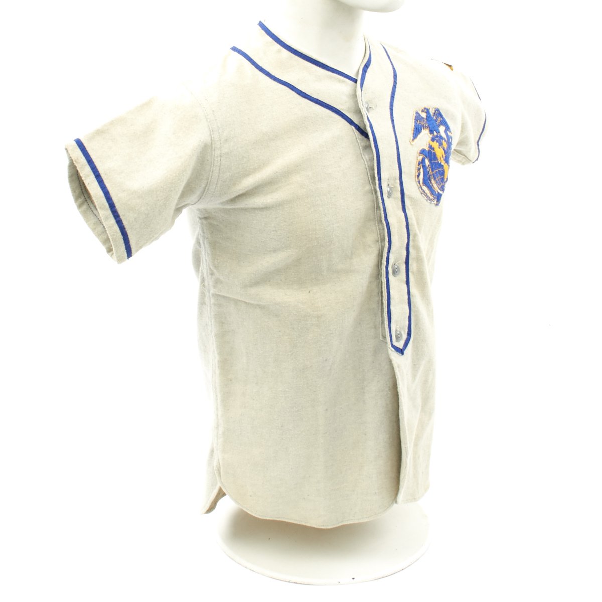 This is a size Medium early 1950s Korean War era Marine Corps baseball uniforme consisting of jersey and pants. it is constructed from gray wool with stitched on blue and gold EGA 1st Marine Division Guadalcanal Patch on left shoulder. The jersey features blue piping and 4 gray buttons and is ink stamped USMC on interior neck. The reverse has blue and gold stitched letter 22. Overall condition is excellent.