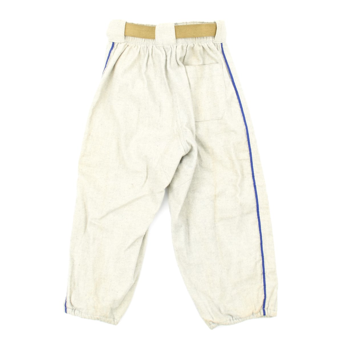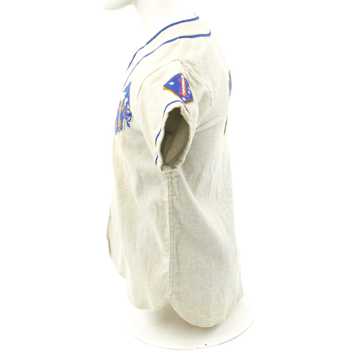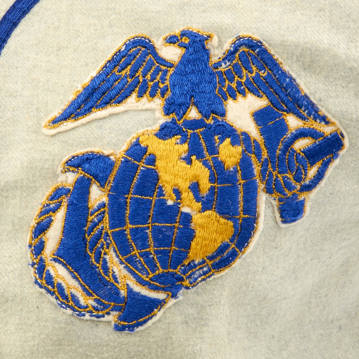This is a size Medium early 1950s Korean War era Marine Corps baseball uniforme consisting of jersey and pants. it is constructed from gray wool with stitched on blue and gold EGA 1st Marine Division Guadalcanal Patch on left shoulder. The jersey features blue piping and 4 gray buttons and is ink stamped USMC on interior neck. The reverse has blue and gold stitched letter 22. Overall condition is excellent.
