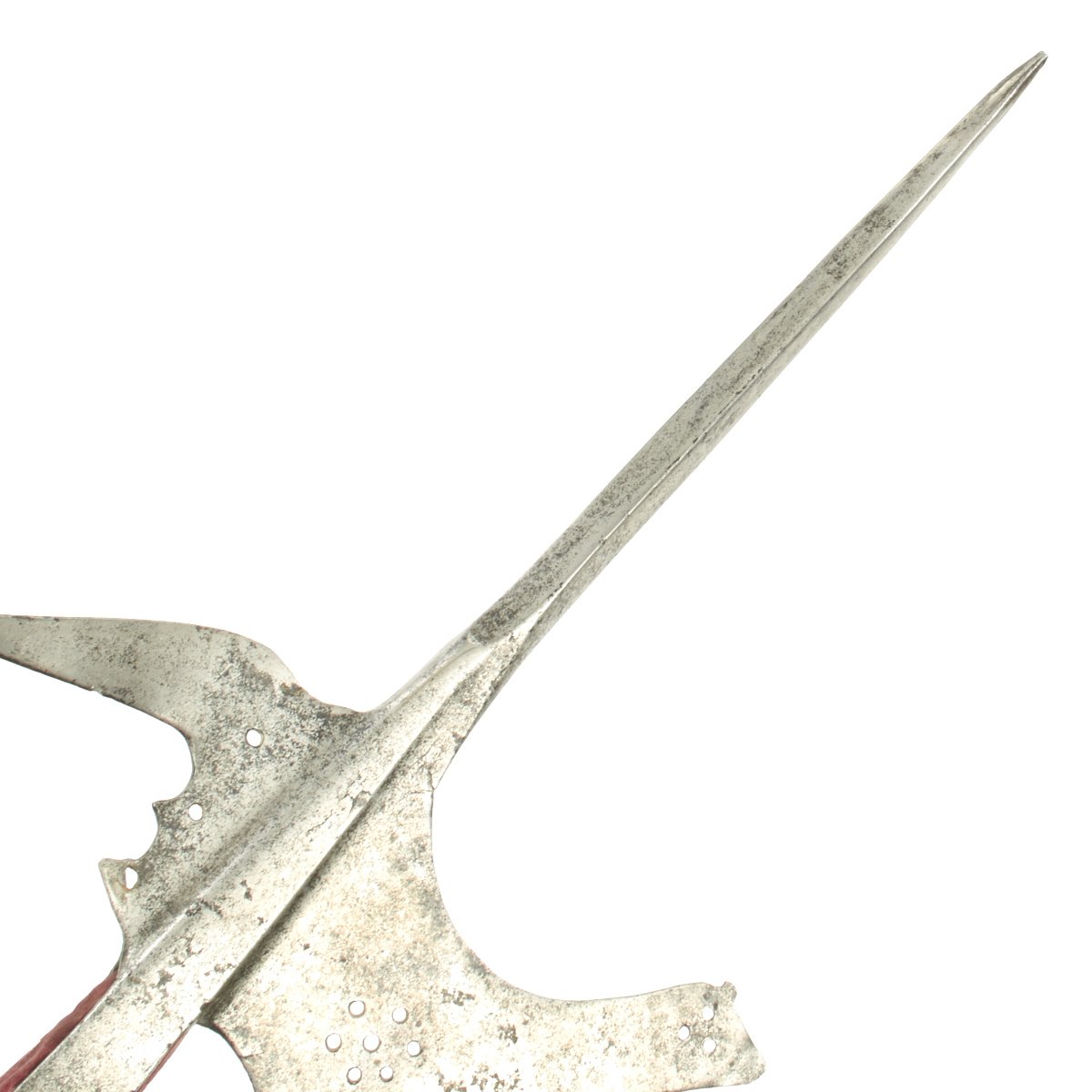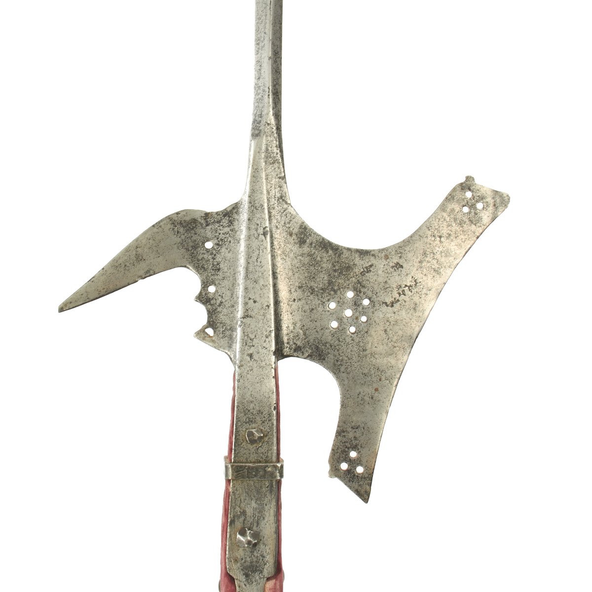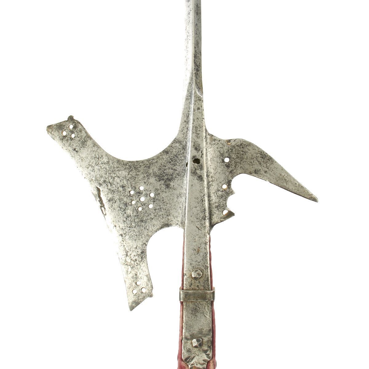 The well-forged head measures 21" overall, excluding the support straps, and has a decoratively pierced blade 7 - 3/4" across. With the straps, the head is approximately 40 inches long. The central spike measures 13" and the fluke 3". The shaft is covered with faded red velvet and decorative tassel below straps, though the tassel is in VERY delicate condition. There are brass tack decorations running down the length of the halberd in the velvet.